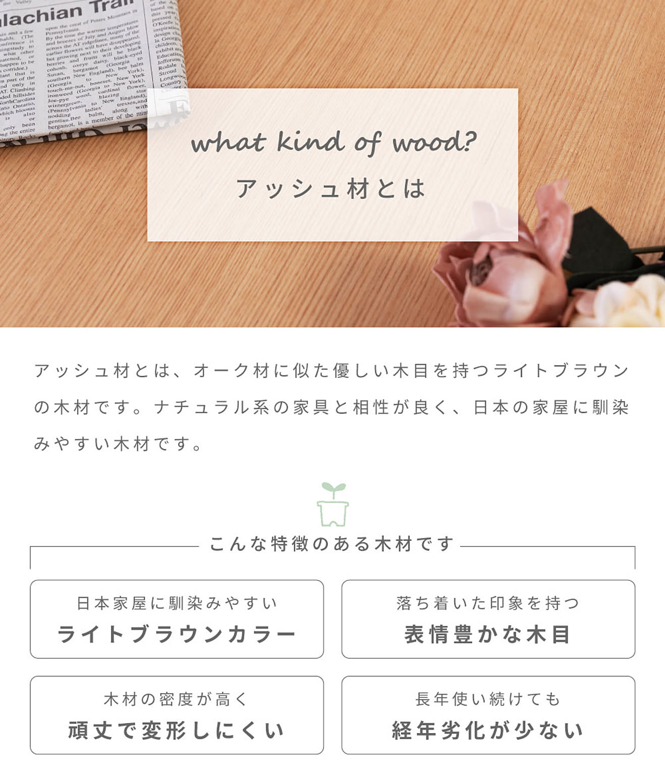 木材には天然木アッシュ材を使用しており、美しいきめ細かな木目が魅力的です。