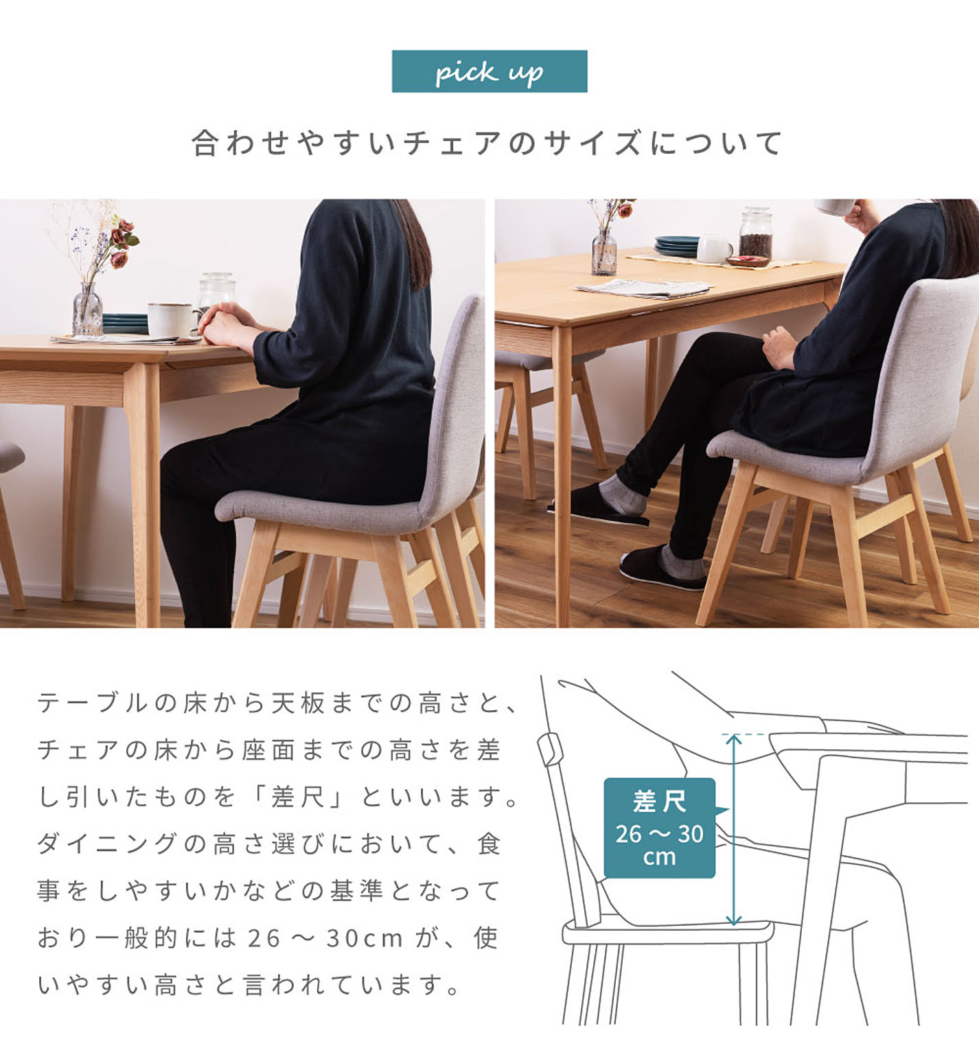 テーブルの床から天板までの高さと、チェアの床から座面までの高さを差し引いたものを「差尺」といいます。