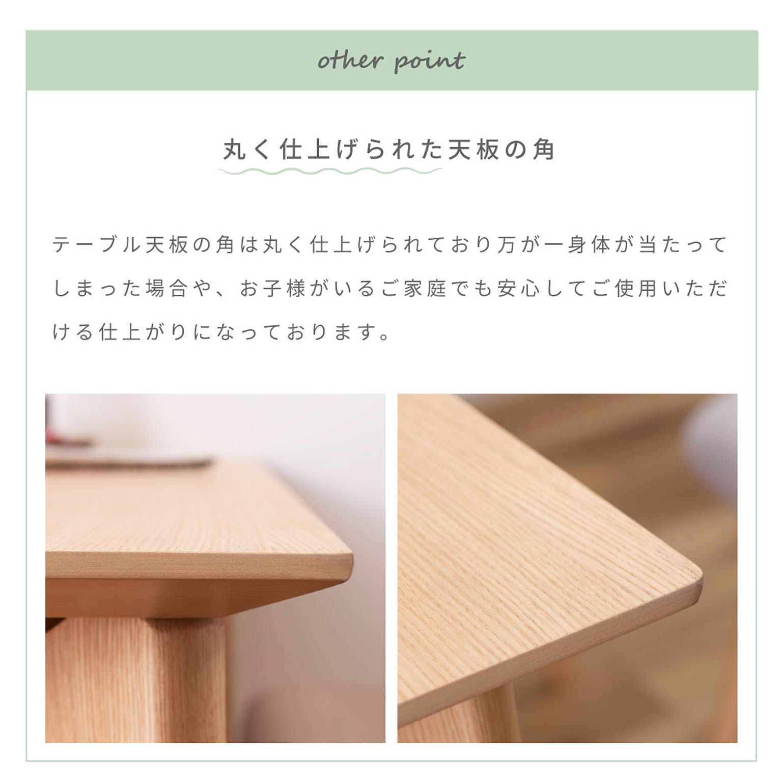 テーブル天板の角は丸く仕上げられており万が一身体が当たってしまった場合や、お子様がいるご家庭でも安心して