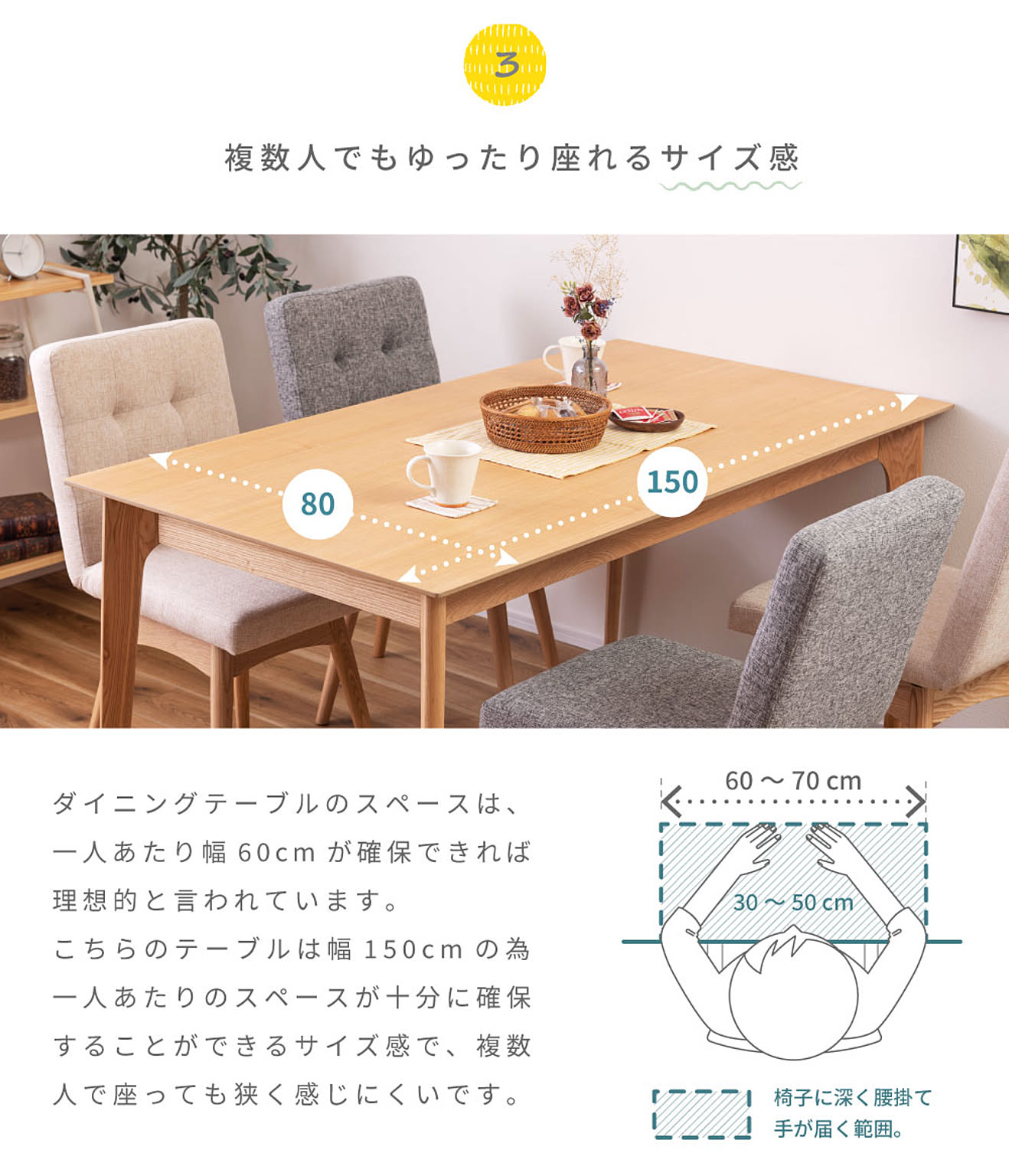 ダイニングテーブルのスペースは、一人あたり幅60cmが確保できれば理想的と言われています。