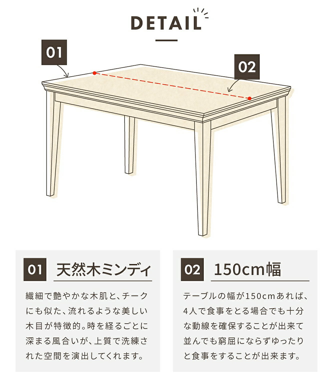 ●ノスタルジックムービーに出てきそうな、どこか懐かしさを感じさせるディテールが魅力のダイニングテーブル。 どっしりとした存在感と愛嬌を兼ね備え、使い込むほどに味わいが増していきます。