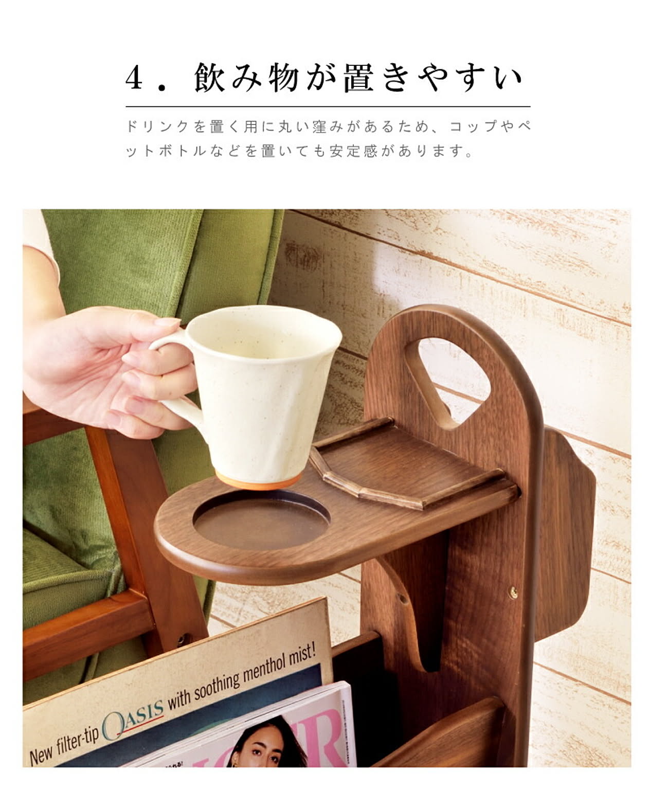 ドリンクを置く用に丸い窪みがあるため、コップやペットボトルなどを置いても安定感があります。