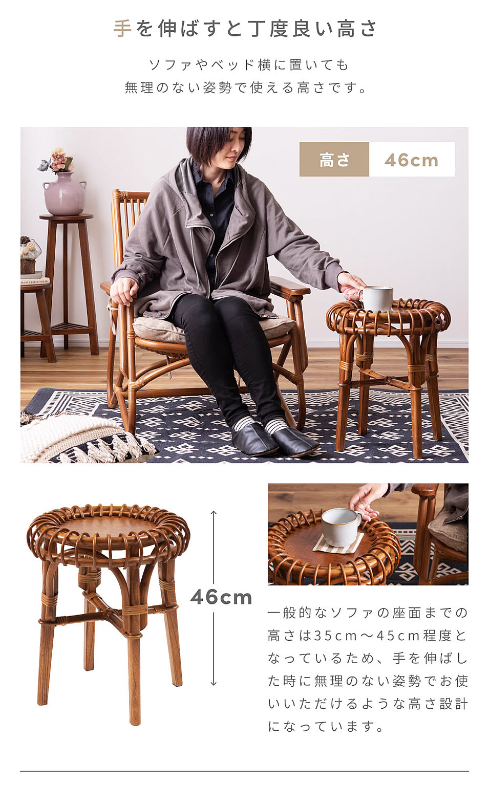 一般的なソファの座面までの高さは35cm〜45cm程度となっているため、手を伸ばした時に無理のない姿勢でお使いいただけるような高さ設計になっています。