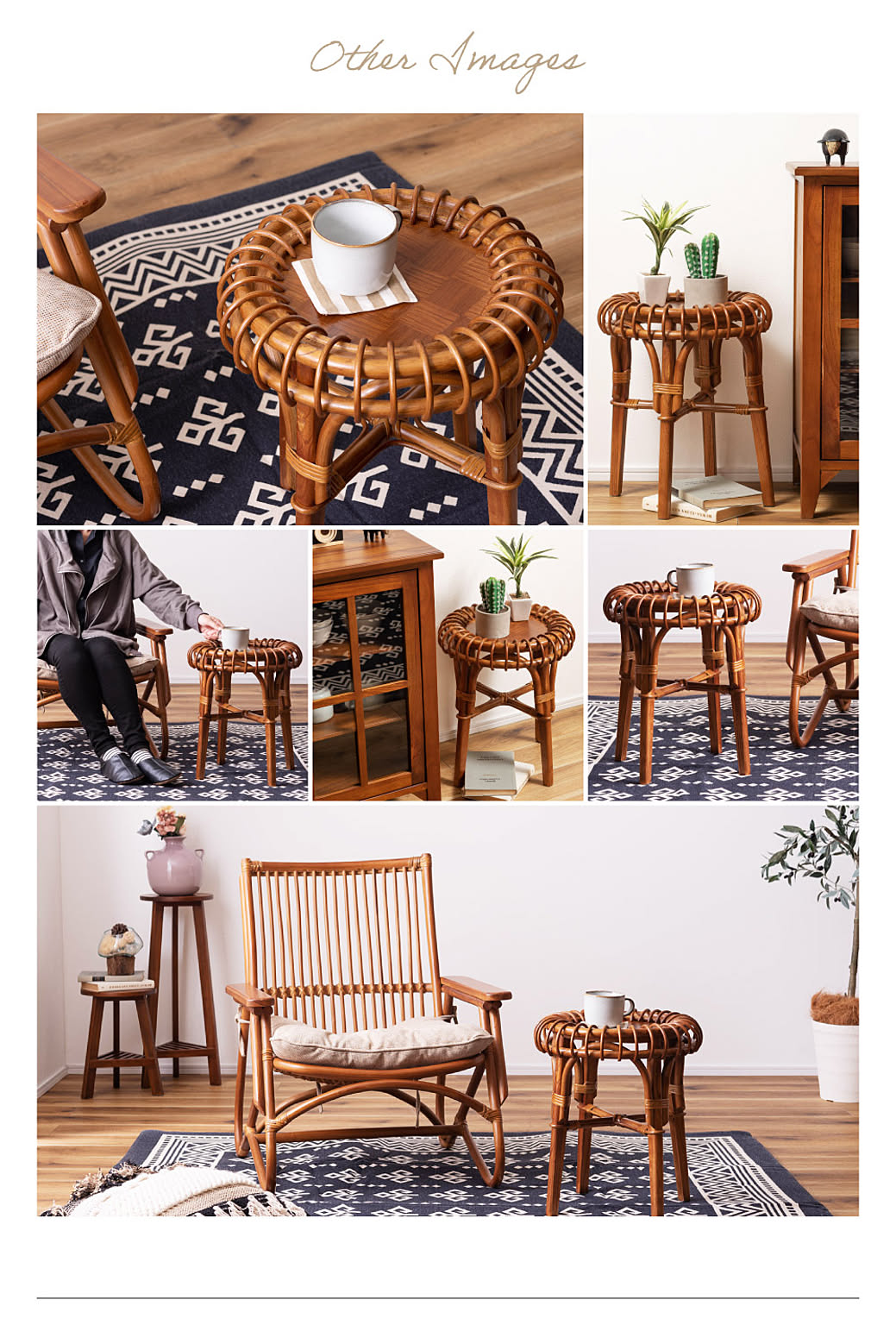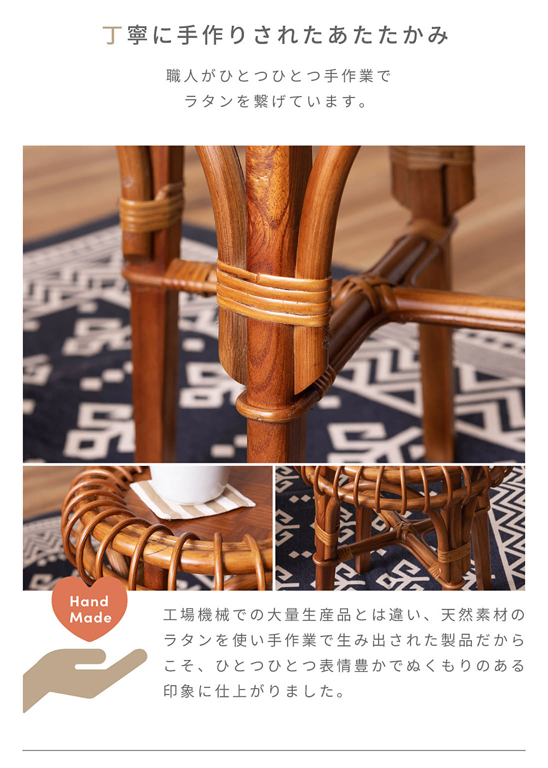 工場機械での大量生産品とは違い、天然素材のラタンを使い手作業で生み出された製品だからこそ、ひとつひとつ表情豊かでぬくもりのある印象に仕上がりました。