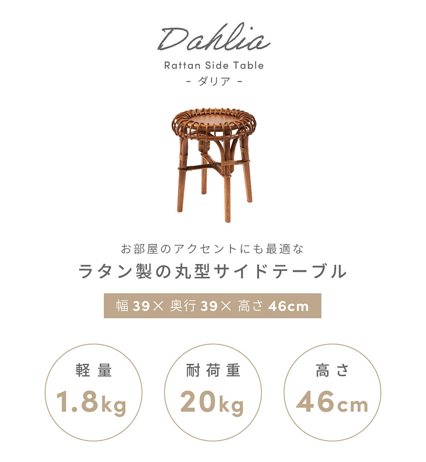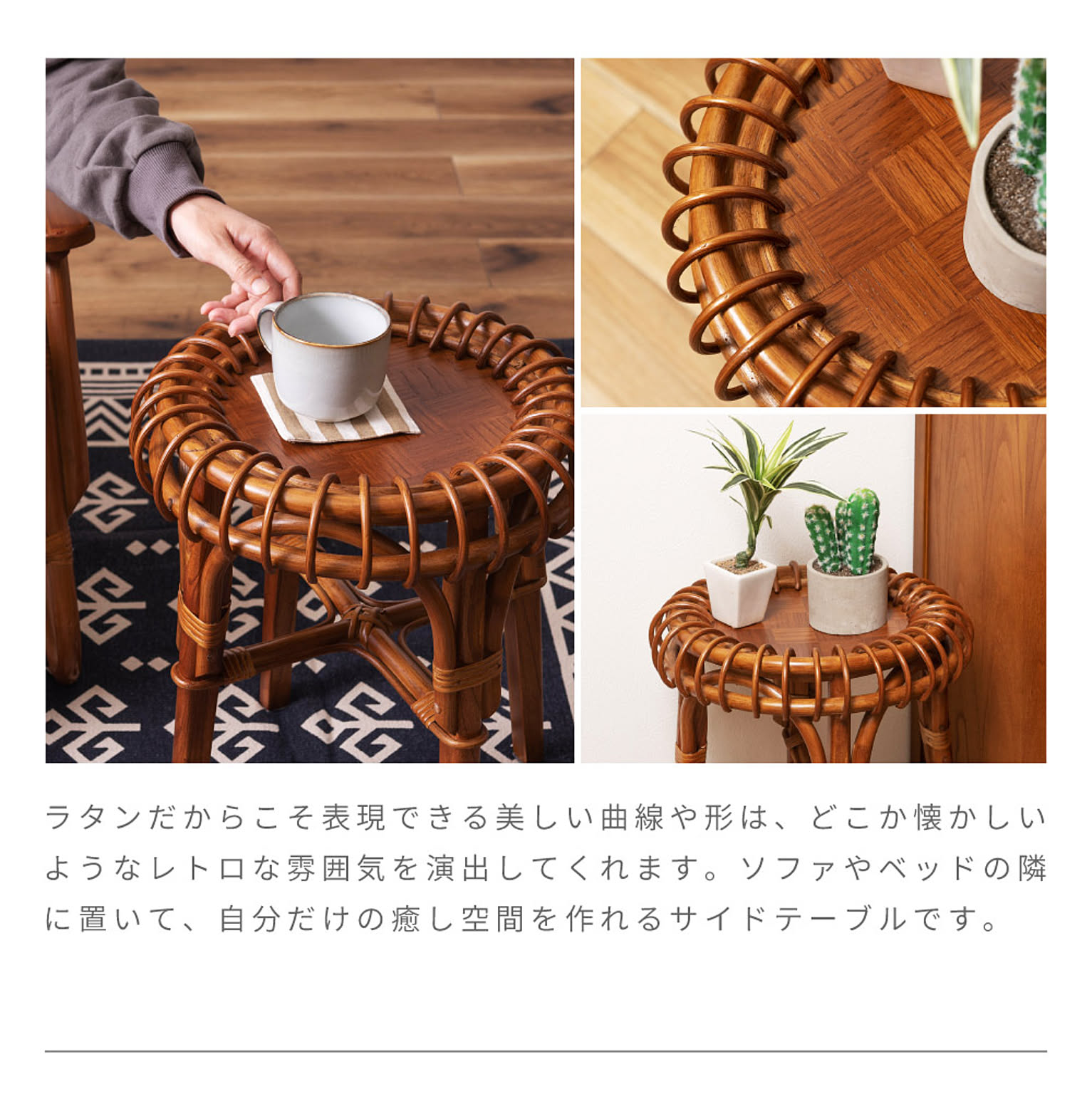 ●お部屋のアクセントにも最適なラタン製の丸型サイドテーブル