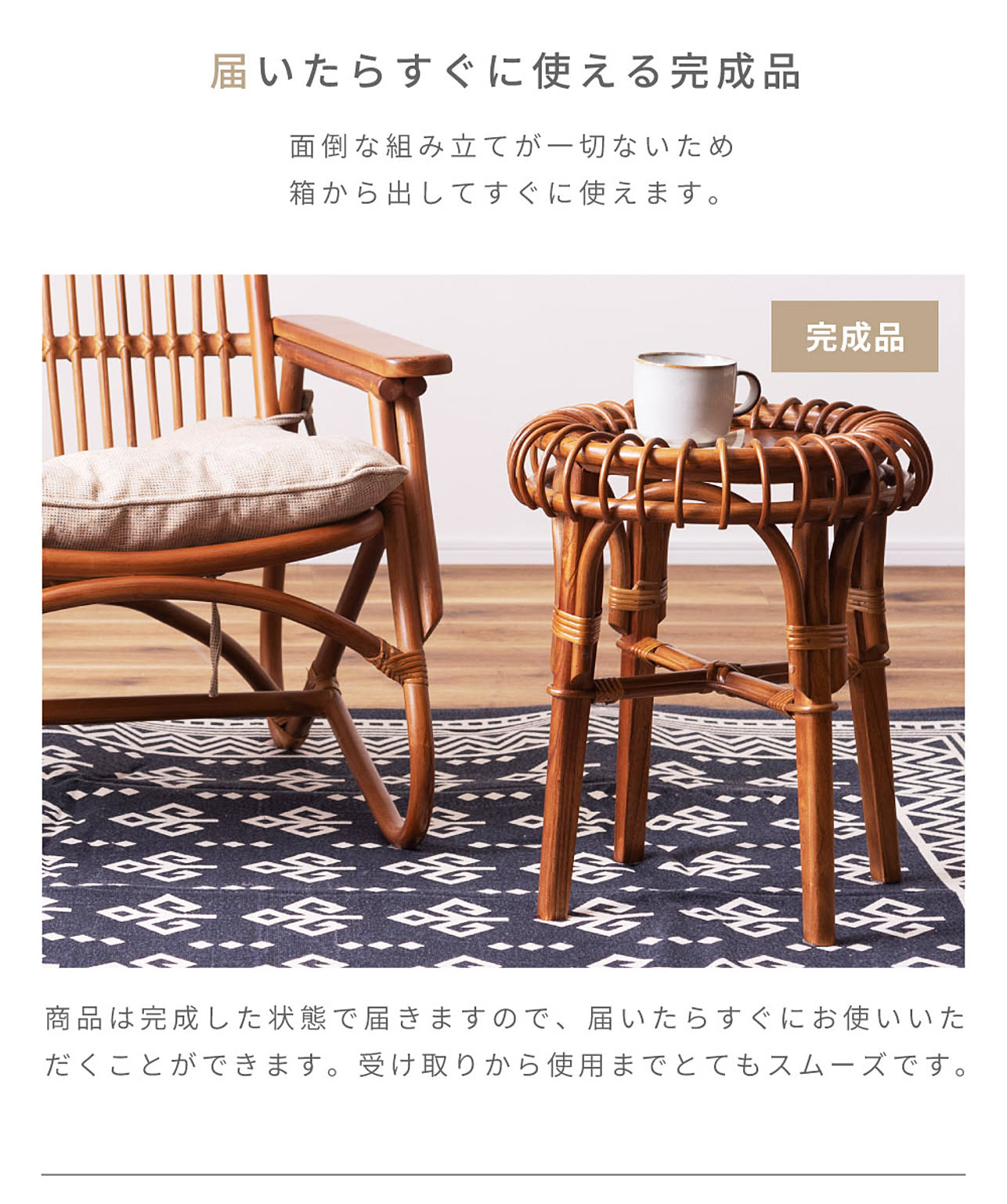 商品は完成した状態で届きますので、届いたらすぐにお使いいただくことができます。受け取りから使用までとてもスムーズです。