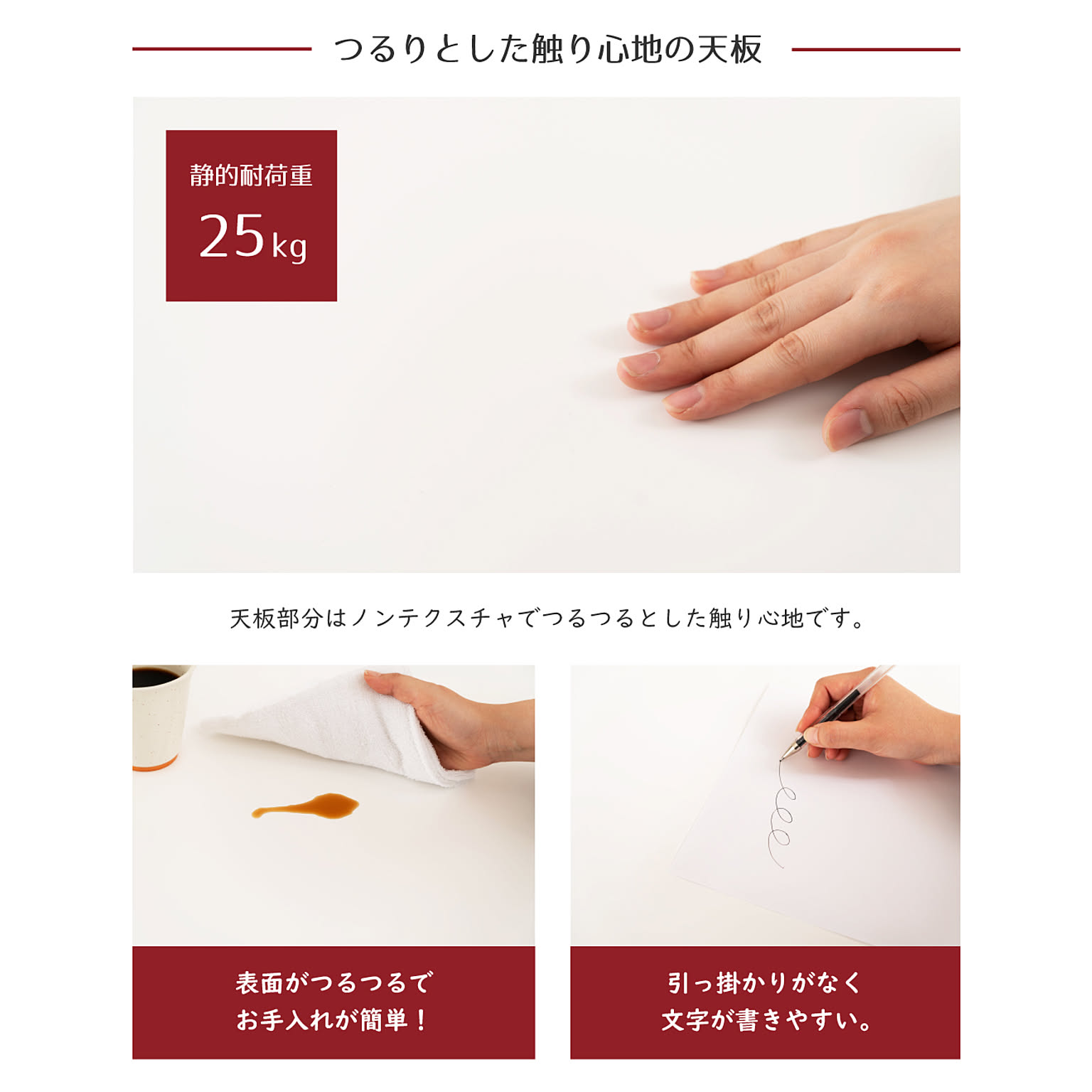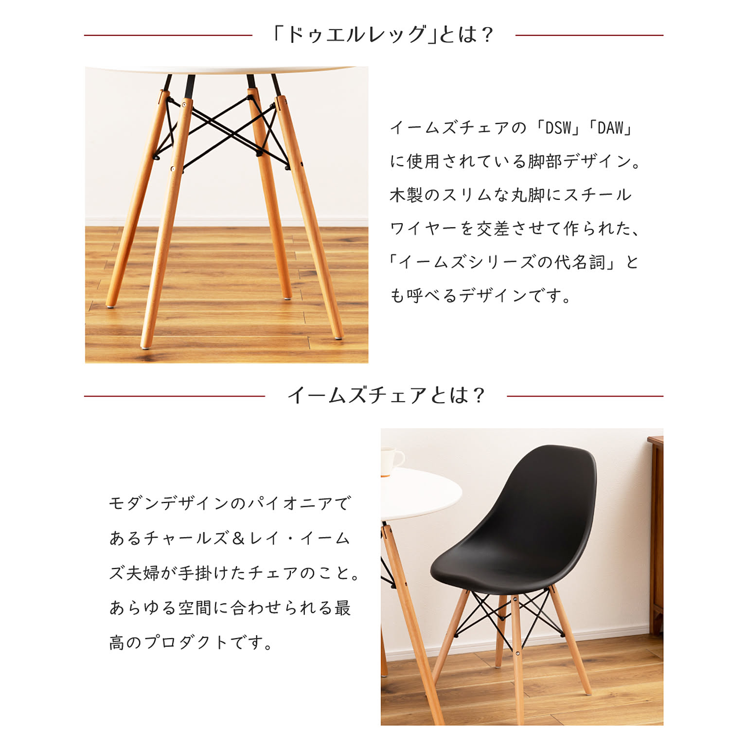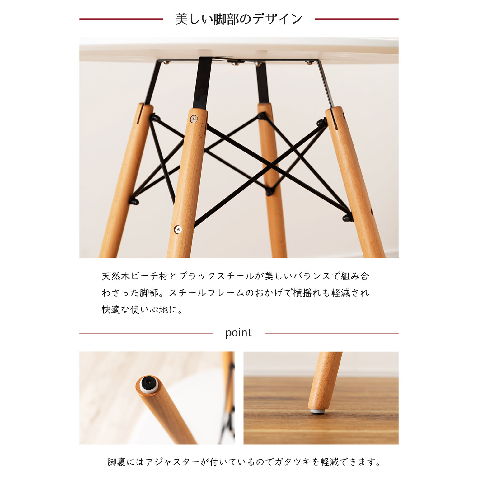 ●ドゥエルレッグと呼ばれる脚部デザインを採用したスッキリとしたシルエットのラウンドテーブルです。 ●美しい脚部のデザイン 天然木ビーチ材とブラックスチールが美しいバランスで組み合わさった脚部。 スチールフレームのおかげで横揺れも軽減され快適な使い心地に。 ●つるりとした触り心地の天板 天板部分はノンテクスチャでつるつるとした触り心地です。 ・引っ掛かりがなく文字が書きやすい。 ・表面がつるつるでお手入れが簡単。