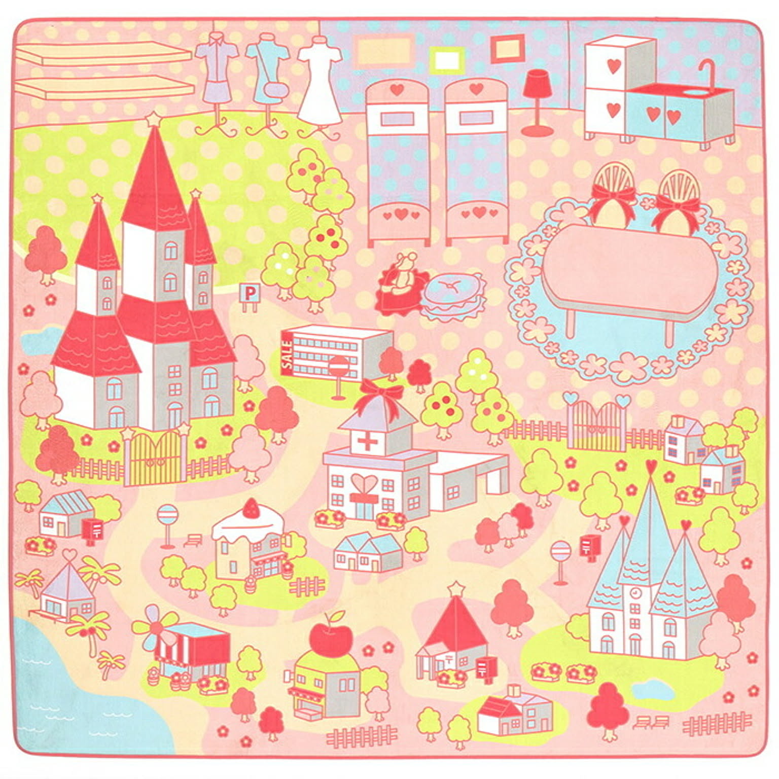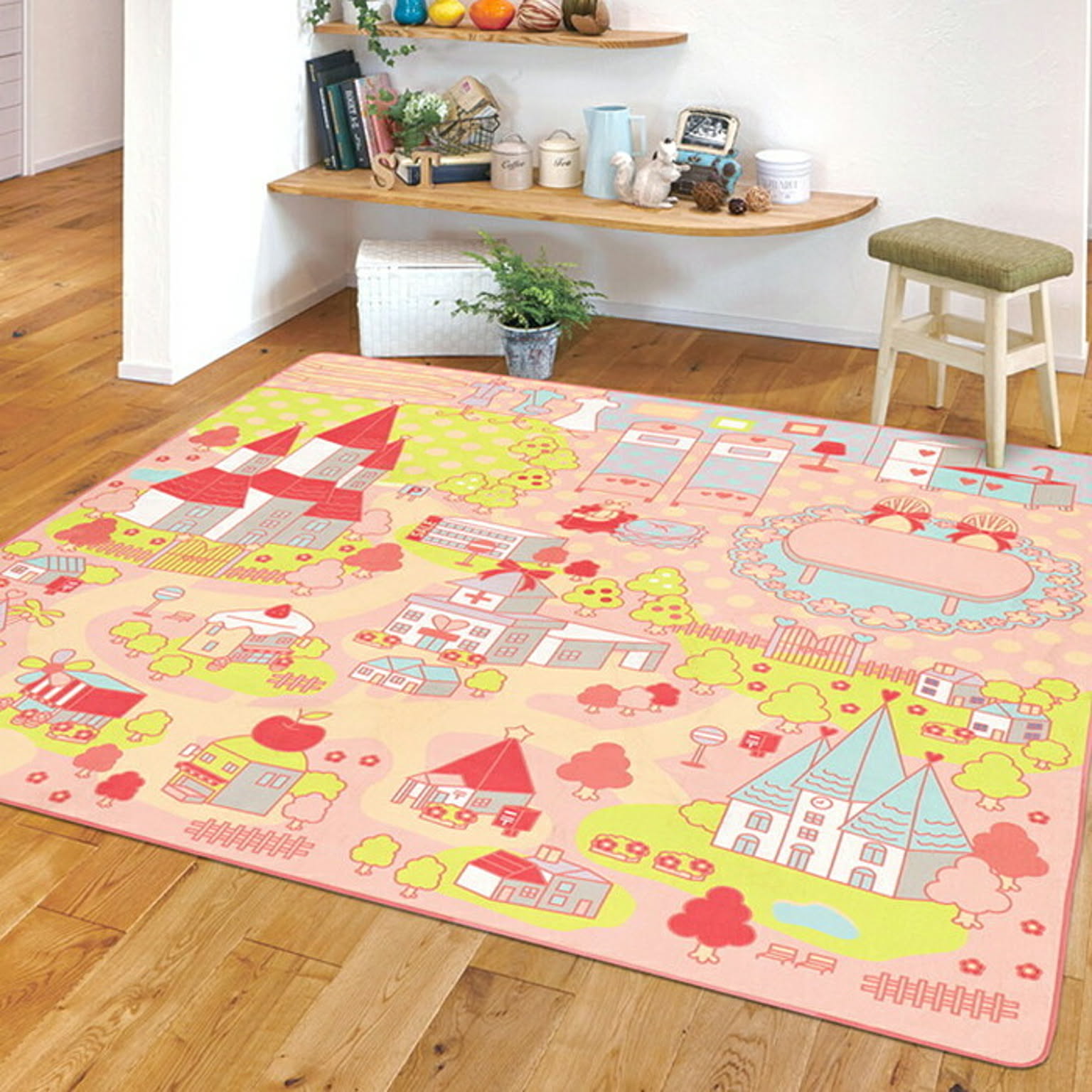 女の子の大好きな人形やお手持ちのオモチャで自由に遊べるキッズラグ。お城やリボンなどかわいいイラストは、女の子に人気のマストデザイン。キッチンやベッドなどのお家エリア、学校や病院などのお出かけエリアと分かれており、こどもの想像力や遊び心をくすぐるデザインです。汚れてもご家庭の洗濯機で丸洗いできます。また、ウレタン入りで程よいクッション性があり、表面は毛足が短くさらさら優しいタッチ感。裏面は滑りにくい加工付き。