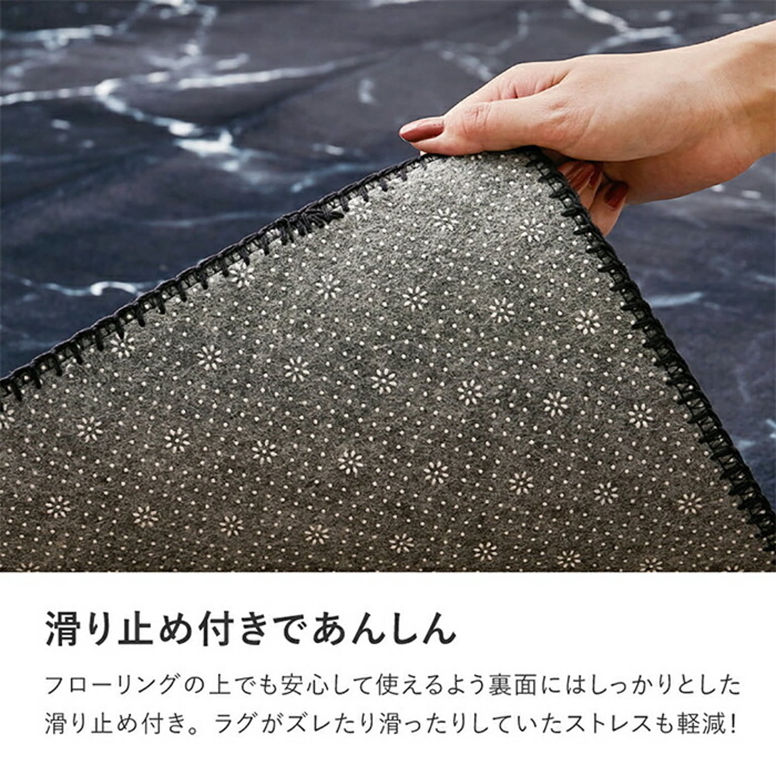 上品で高級感のある大理石柄のプリントラグ。海外風インテリアや、ホワイトコーデにもあうシックなデザインです。ソフトフランネルのなめらかな肌触りは、思わず素肌で触れたくなるようなタッチ感。短毛でやわらかく、コンパクトに折りたためるから収納にも困らず、お手入れも簡単。汚れても洗えるからいつも清潔にお使いいただけます。裏面には滑り止め付きでフローリングの上でもズレにくく安心。寒い季節もあたたかく過ごせるよう、ホットカーペット・床暖房に対応しています。