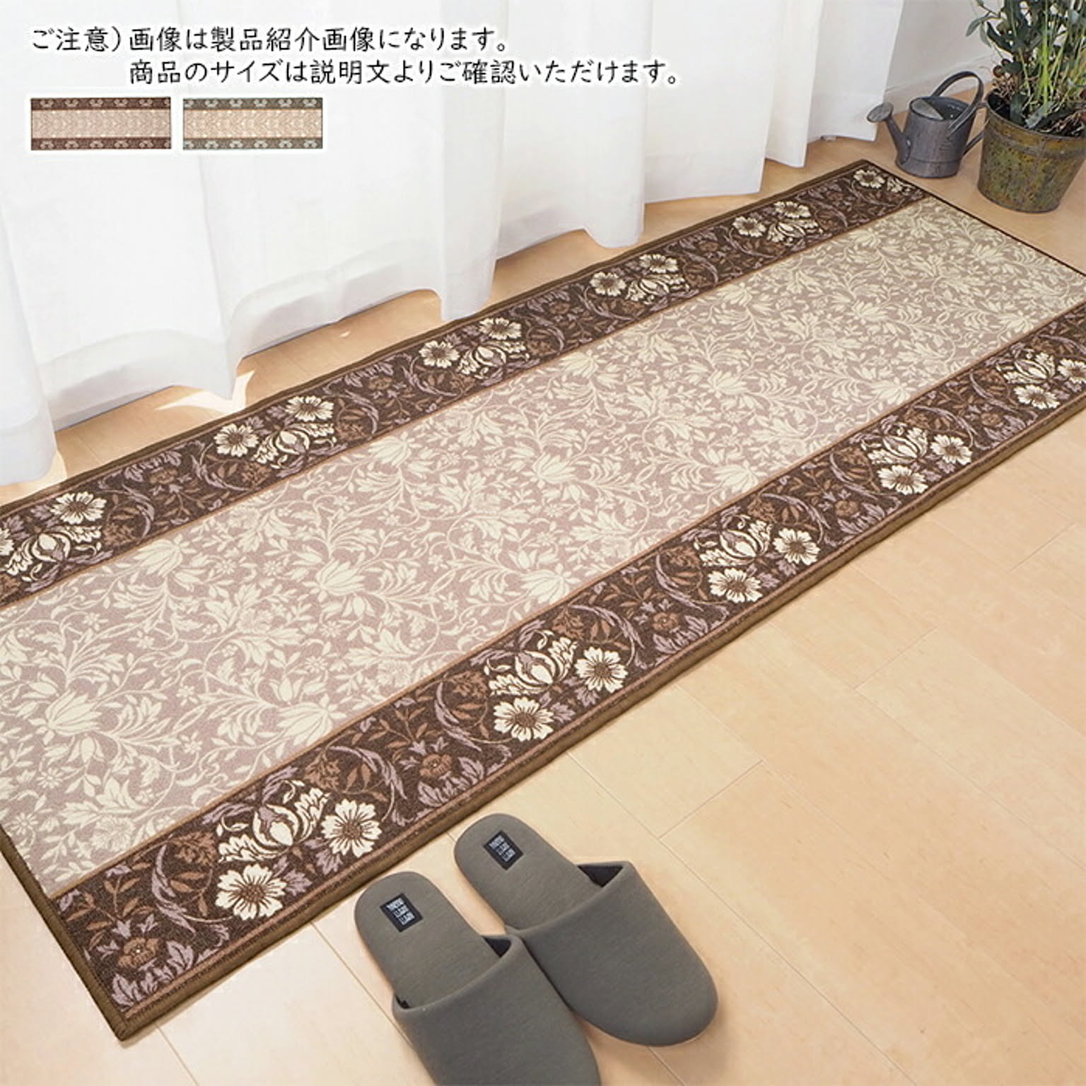 落ち着きのある上品な色合いと、優雅なデザインで廊下を華やかに演出。階下への防音効果も兼ね備えたロングカーペットです。手洗いできるから、いつでもきれいをキープ。キッチンマットなどとして水回りにもおすすめです。短めのパイルなので、掃除機がかけやすい。硬めの生地で、毛がへたりにくく長持ちしやすい。裏面は、床を傷つけにくい不織布貼り。裏面は不織布で、滑りにくい加工付き。スペースに合わせて選べるよう多サイズ展開。落ち着きのある上品なカラーで、ブラウンとグリーンの2色をご用意しました。