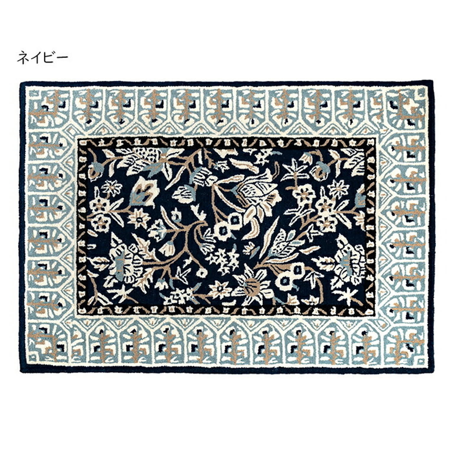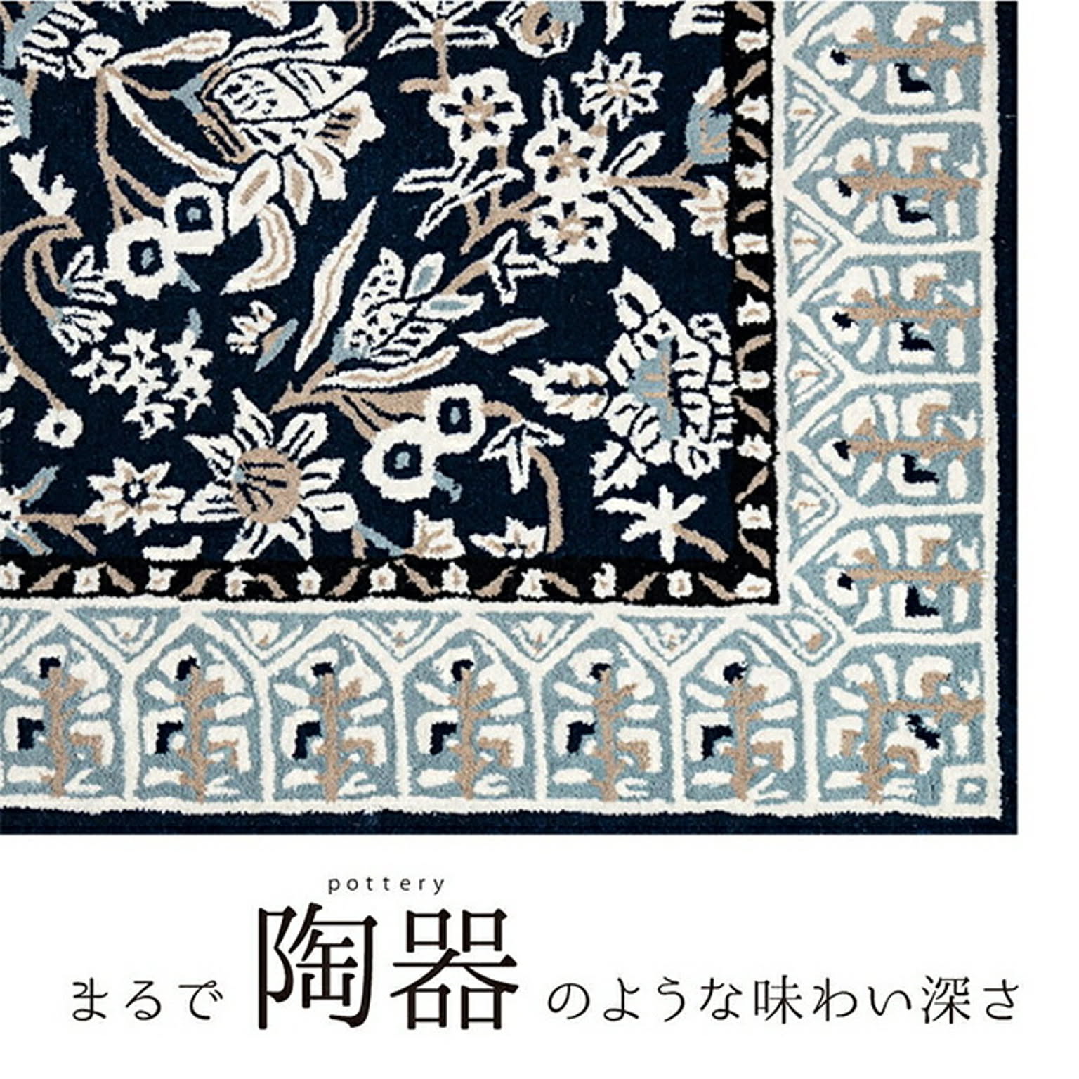 インドの職人による手作りのウールラグマット。陶器(pottery)のような繊細さと、独特な色味や発色の良さが絶妙なアクセントになり、部屋全体をおしゃれに引き立てます。ウールは保温性、吸湿性に優れ、季節問わず使いやすい天然素材。汚れにくく耐久性にも優れ、丈夫で長くお使いいただけます。