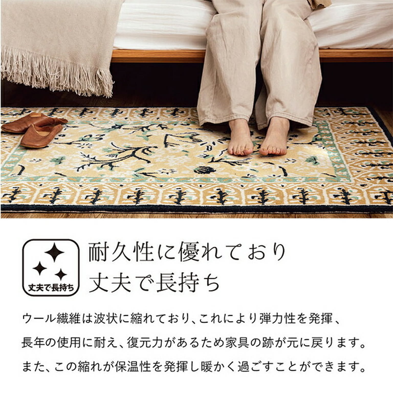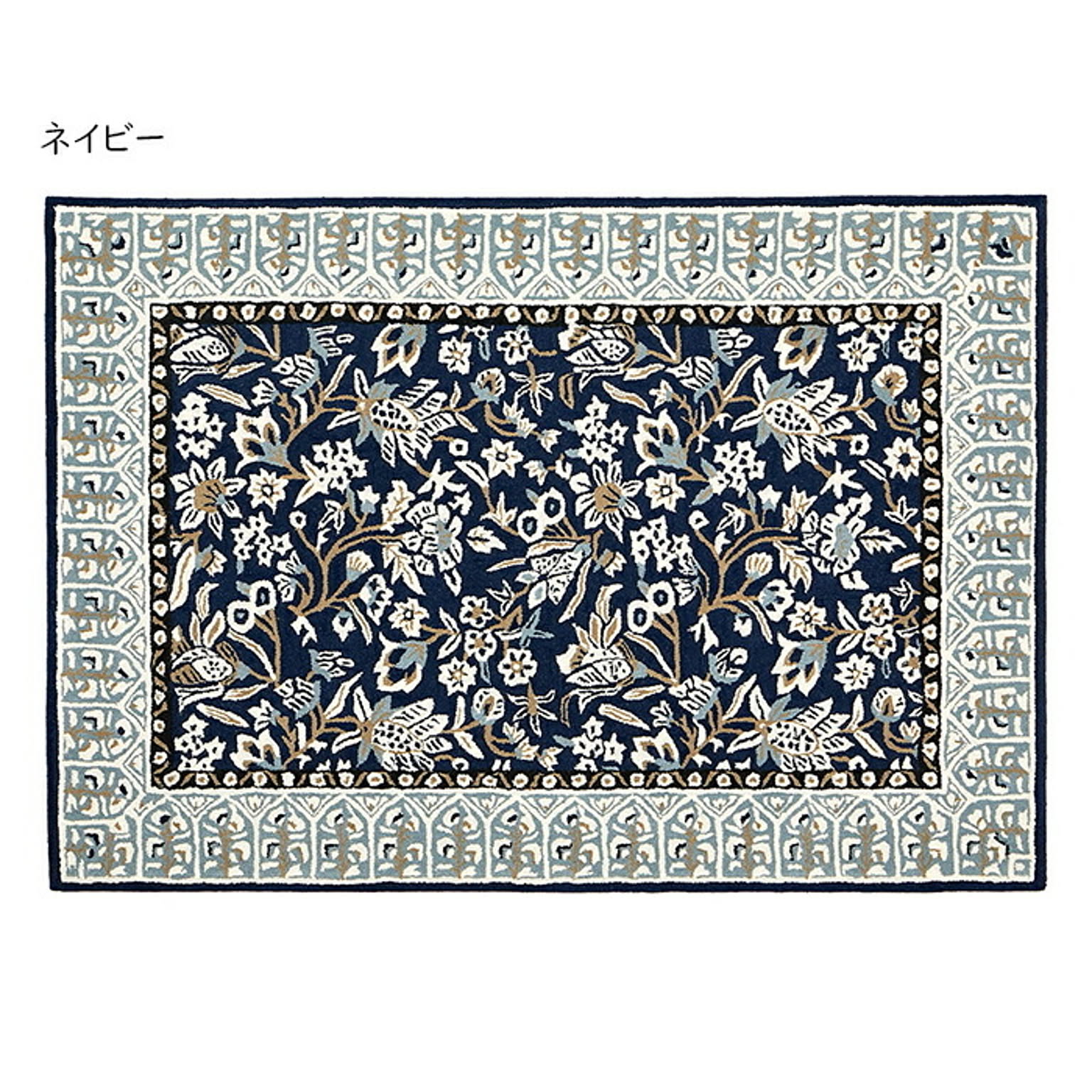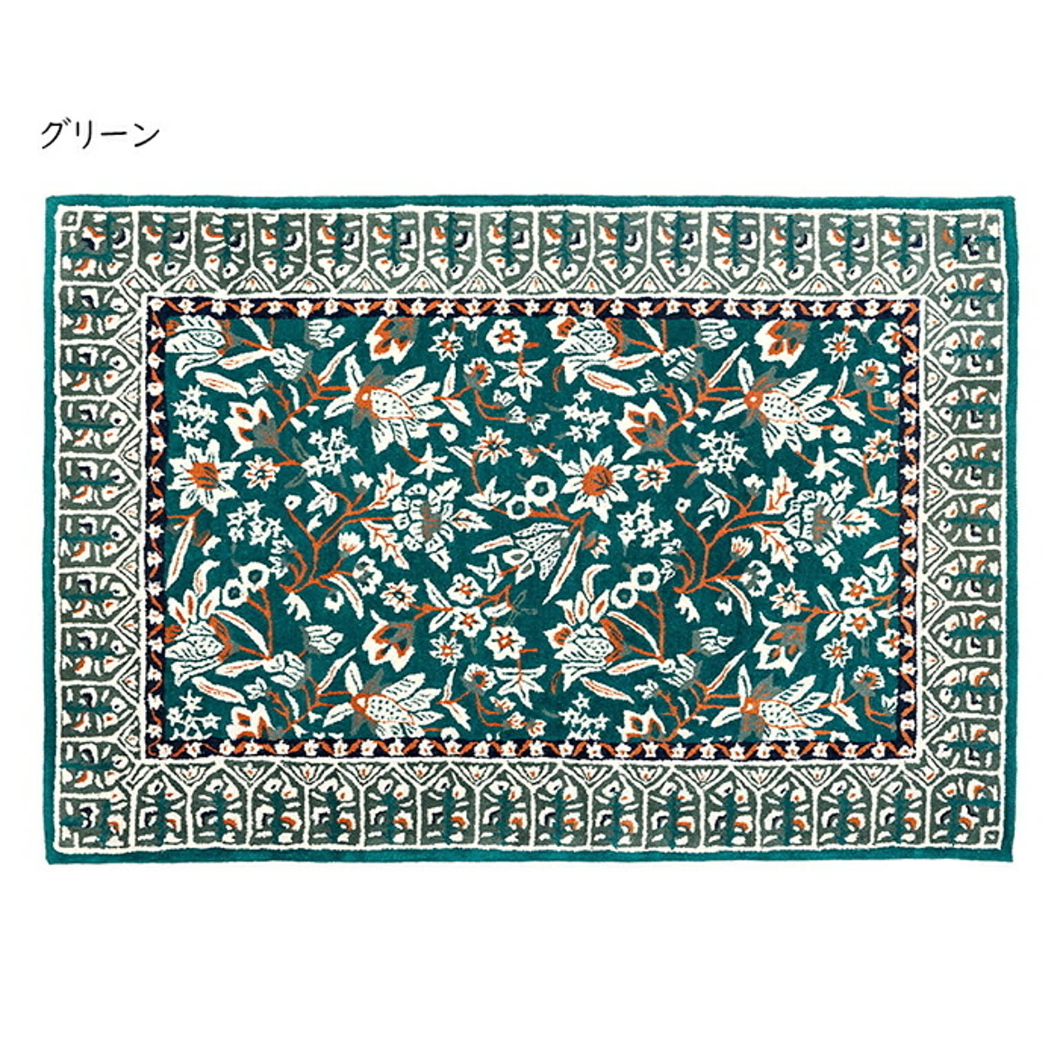 インドの職人による手作りのウールラグマット。陶器(pottery)のような繊細さと、独特な色味や発色の良さが絶妙なアクセントになり、部屋全体をおしゃれに引き立てます。ウールは保温性、吸湿性に優れ、季節問わず使いやすい天然素材。汚れにくく耐久性にも優れ、丈夫で長くお使いいただけます。