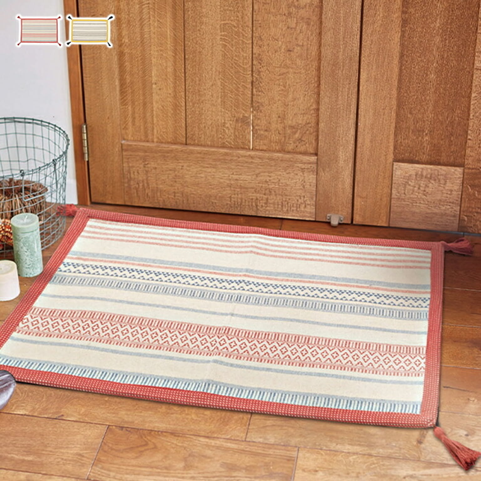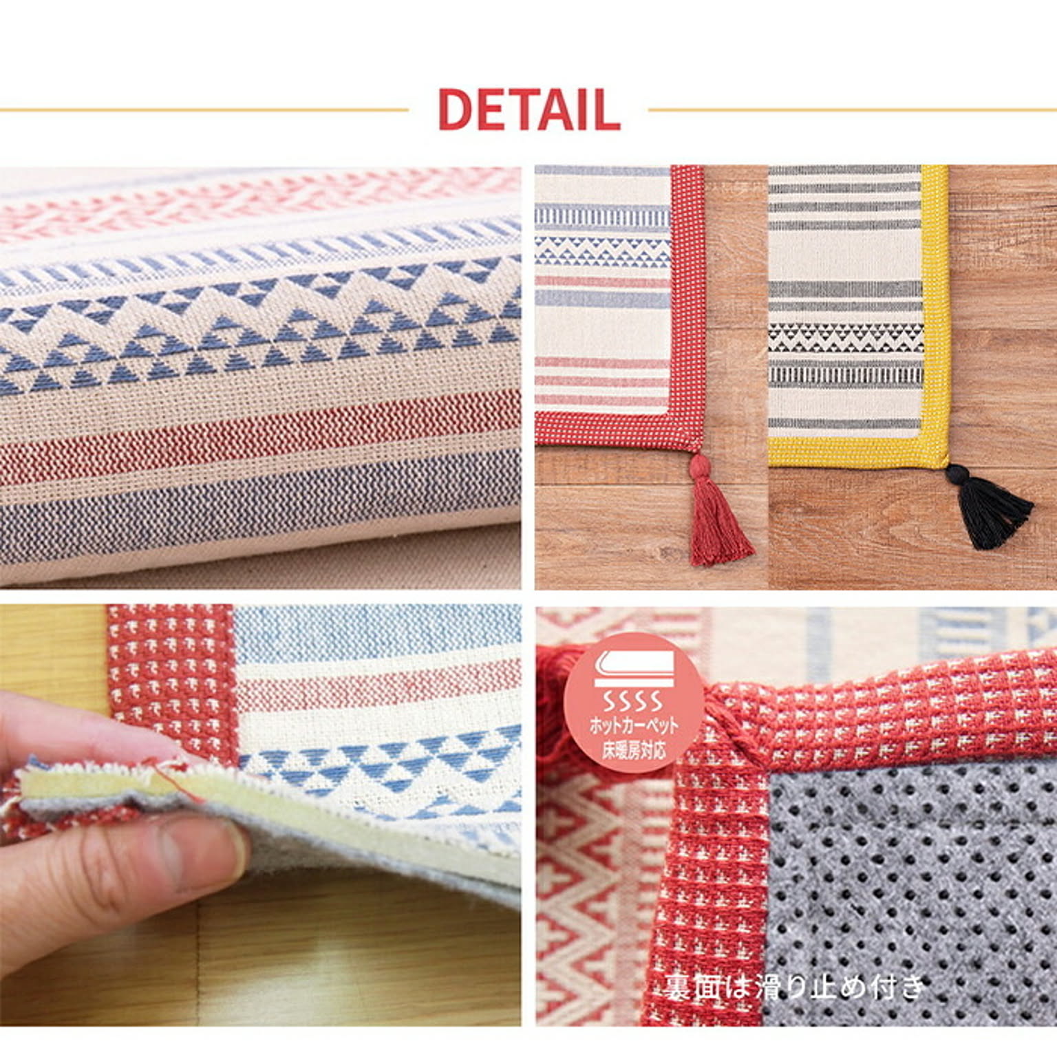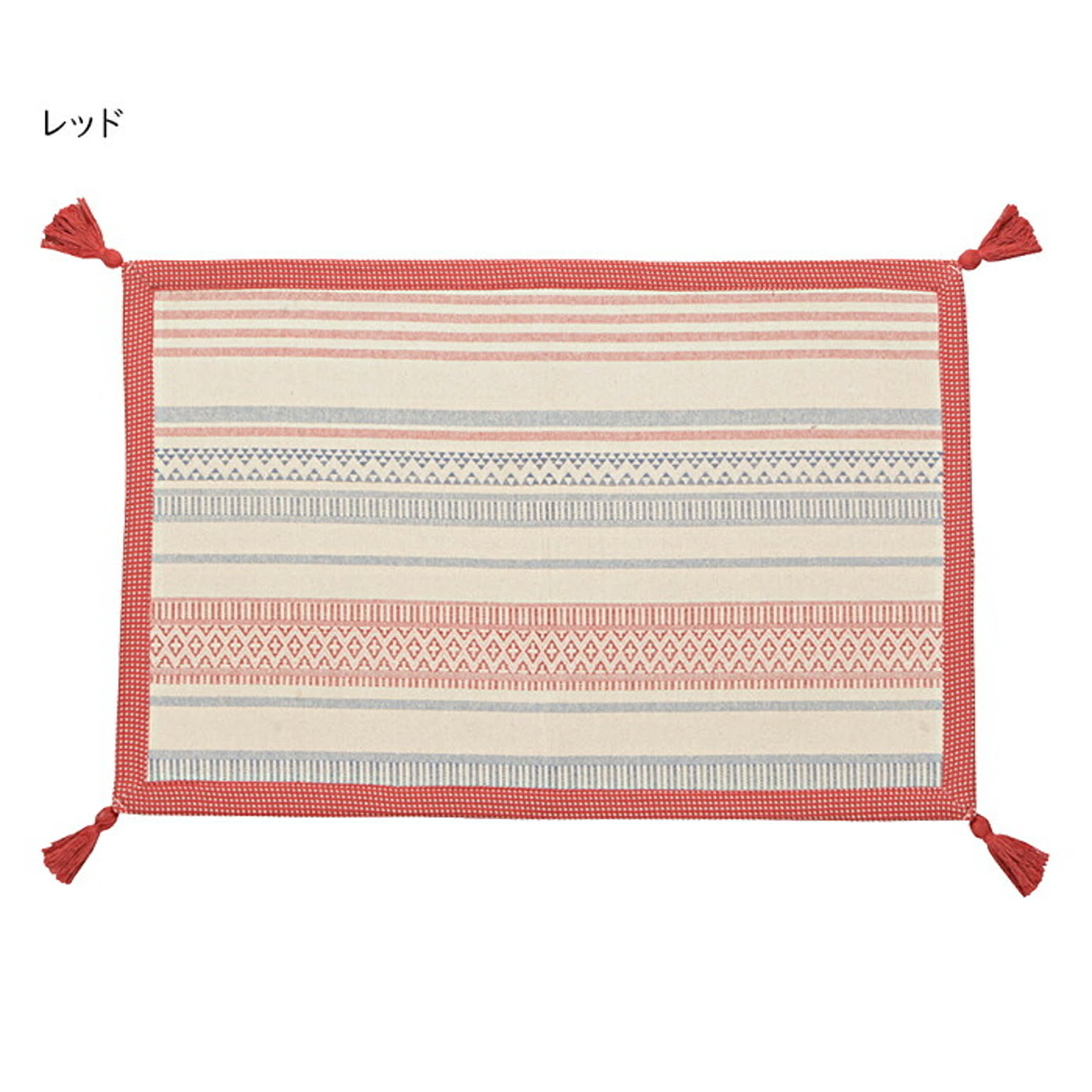 ざっくり感のあるコットンの心地よい手触りとやわらかな風合いが魅力のインド綿100%マット。インテリアに合わせやすい、シンプルでナチュラルなデザインで、四隅に付いたタッセルがおしゃれ度をさらにアップ。天然素材で肌にやさしく、通気性がよく保温性にも優れたインド綿は、オールシーズン快適に。裏面には滑り止めが付いているのでズレにくく、また、洗濯機で丸洗いOKだから汚れても安心!いつも清潔にお使いいただけます。