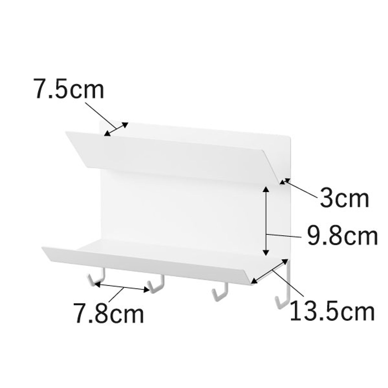 2段のラックに手袋などの衣類小物を、4つのフックにバッグやリード、靴ベラなどの玄関小物を吊り下げ収納できます。