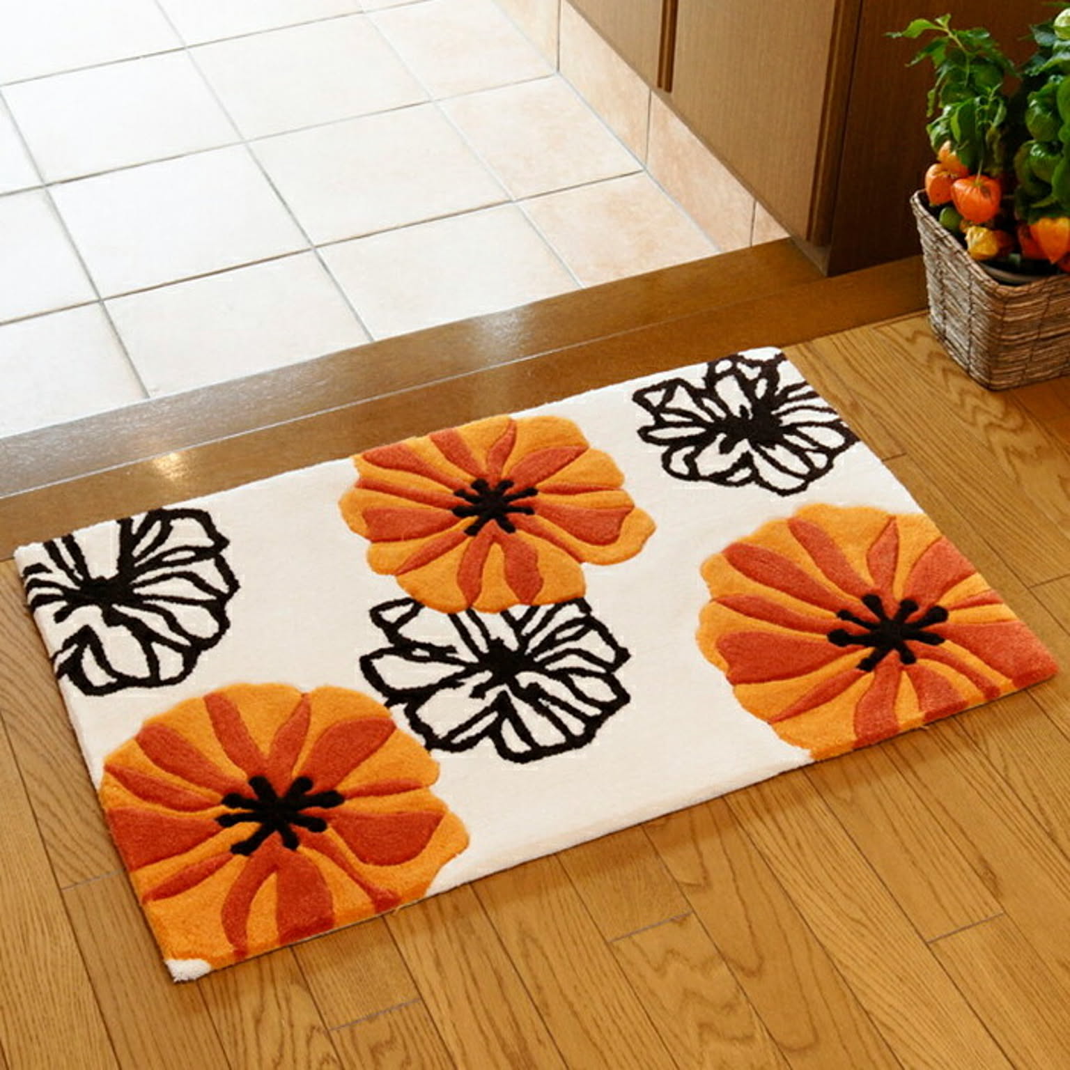 アイボリー地にひときわ目立つオレンジの花を咲かせました。あなたのお帰りを元気いっぱいに迎えてくれる、そんな玄関マットです。最長約12mmのパイル長と打ち込みもよく、足あたりがソフトで踏み心地もふかふか。汚れてもご家庭で手洗い可能で、いつも清潔にお使いいただけます。裏面は滑り止め付きだからズレにくく安心です。