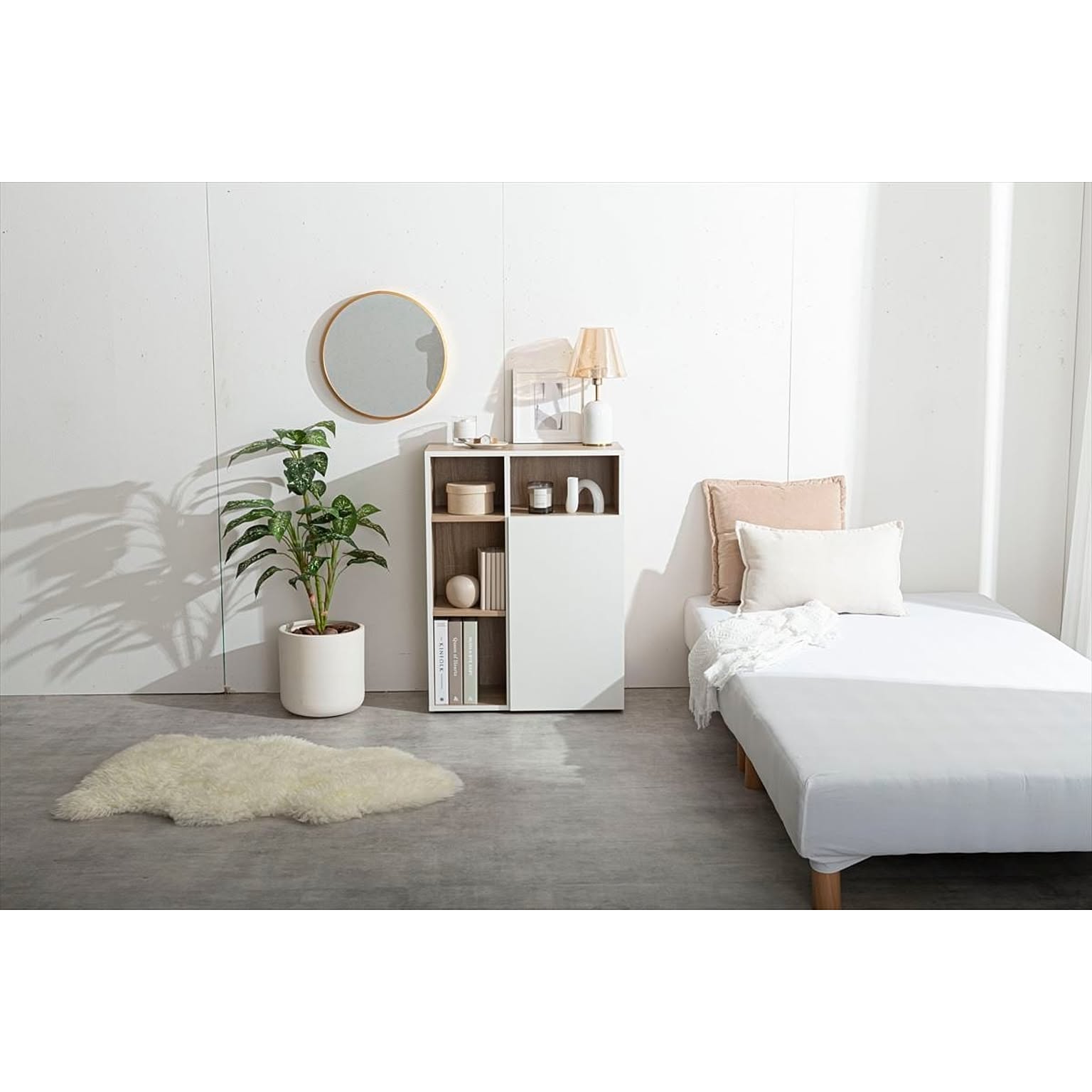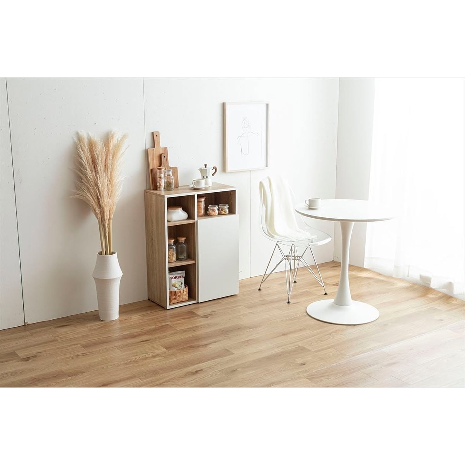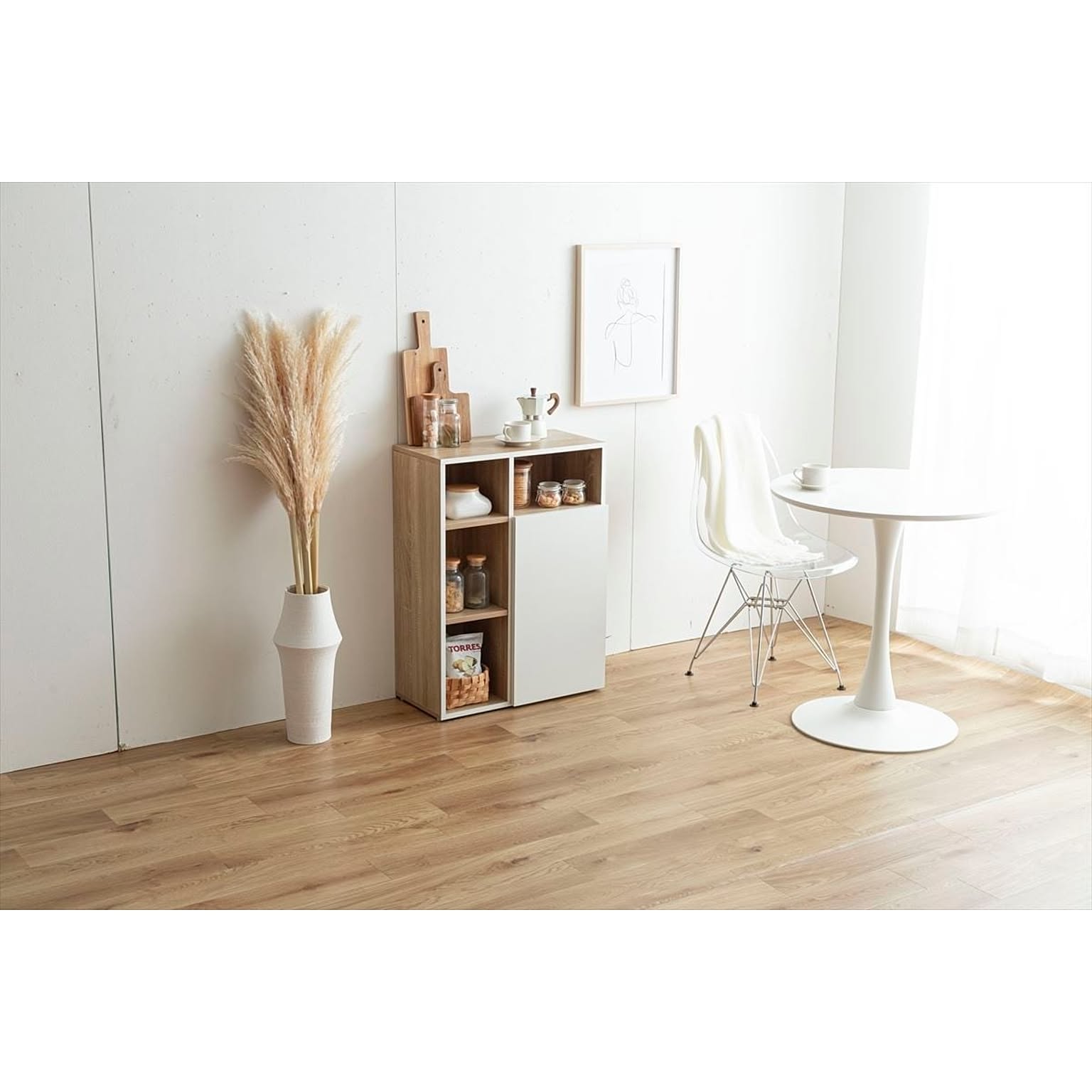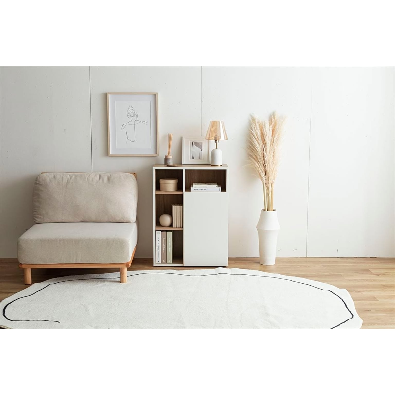 バイカラーとノイズレスデザインが印象的なキャビネット。置くだけで感度の高い、すっきりした空間を演出します。また、オープン収納と扉収納の両方を兼ね揃えているので、見せる収納と隠す収納の両方が1台で実現。サイズはコンパクトで置きやすく、ワンルームや一人暮らしの方にもおすすめです。