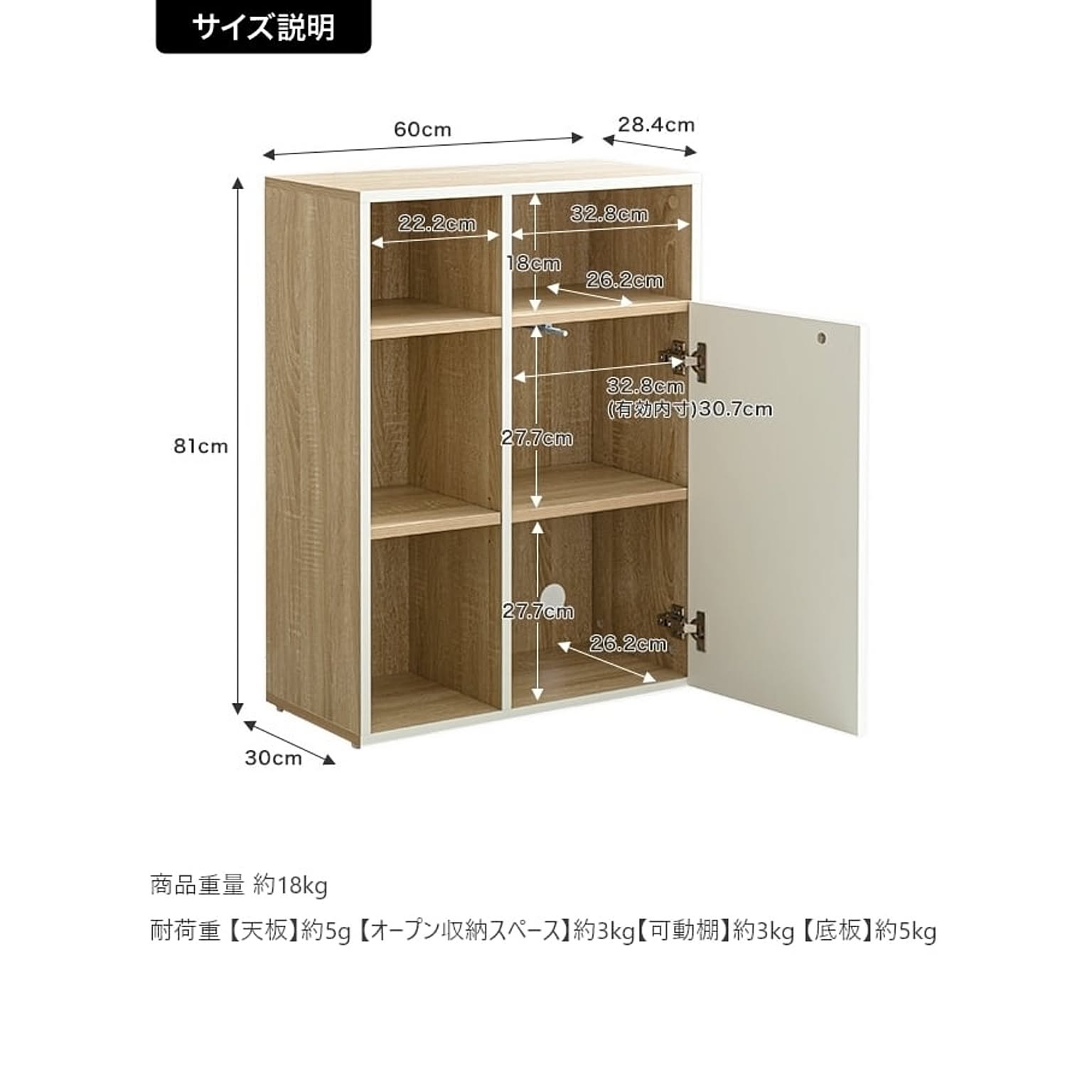 【耐荷重】天板:約5kg 、オープン収納スペース:約3kg、可動棚:約3kg 、底板:約5kg