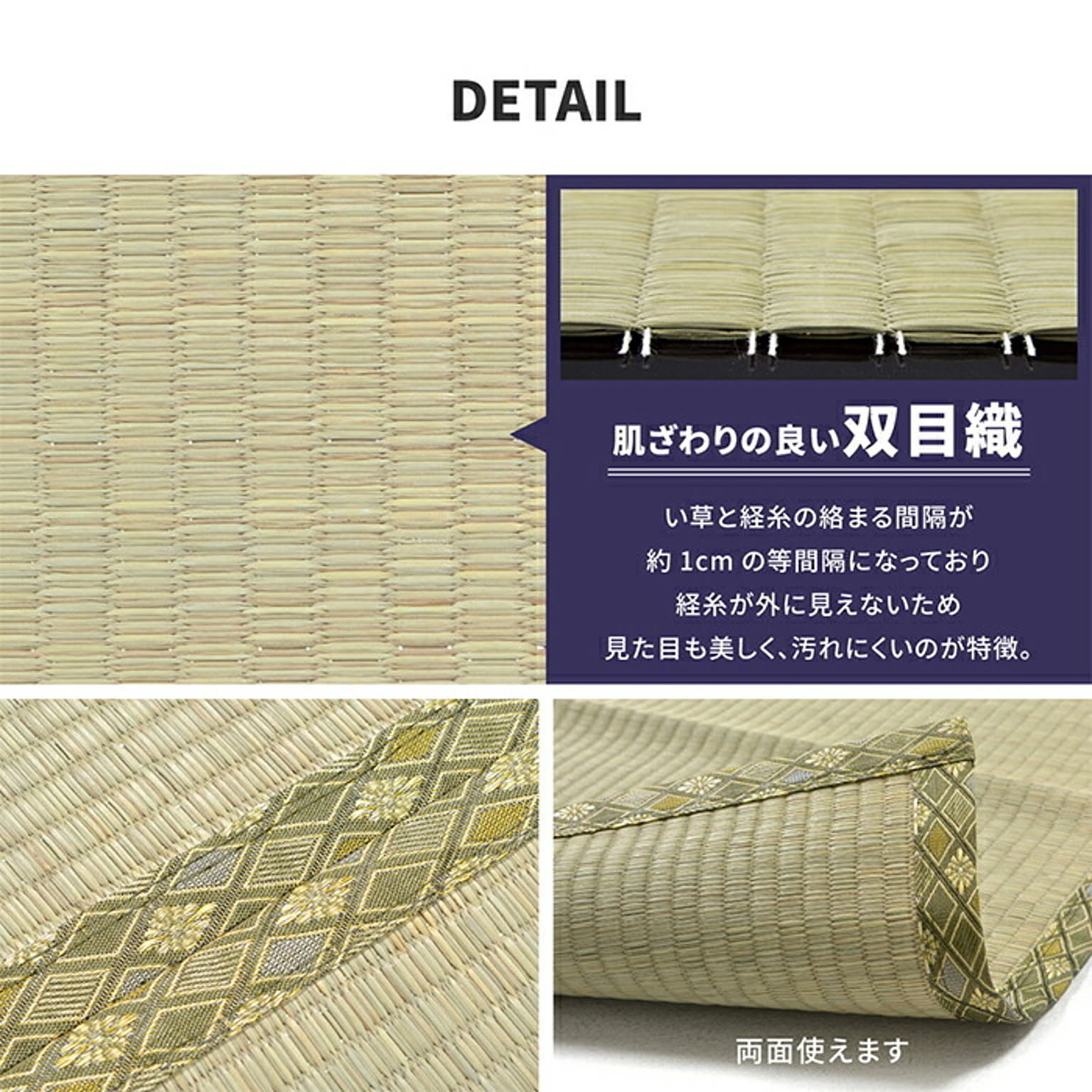 畳の素材である「い草」を気軽に味わうことができる敷き詰めタイプの上敷きです。はっ水加工付きで、水などをこぼしても未加工品よりも拭き取りが簡単にできるので、小さなお子様がいるご家庭にもおすすめです。肌触りの良い双目織です。