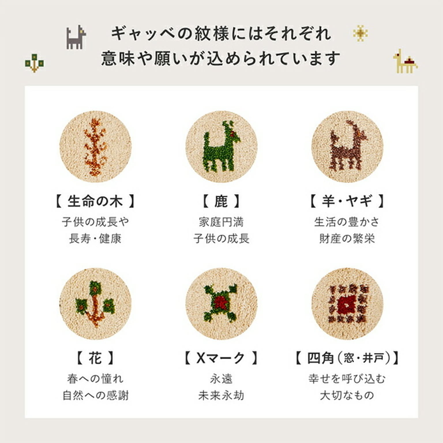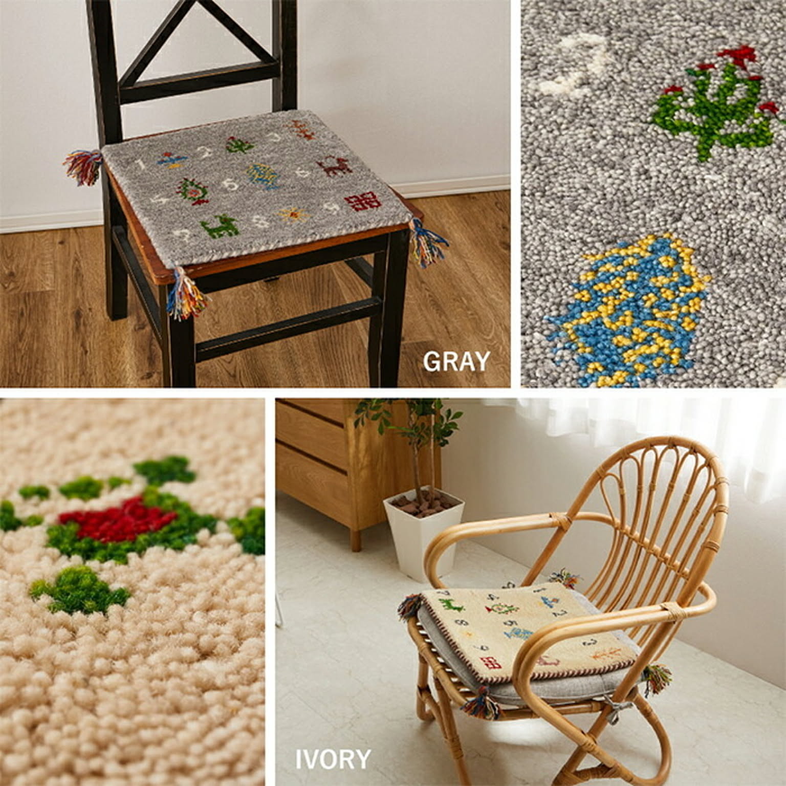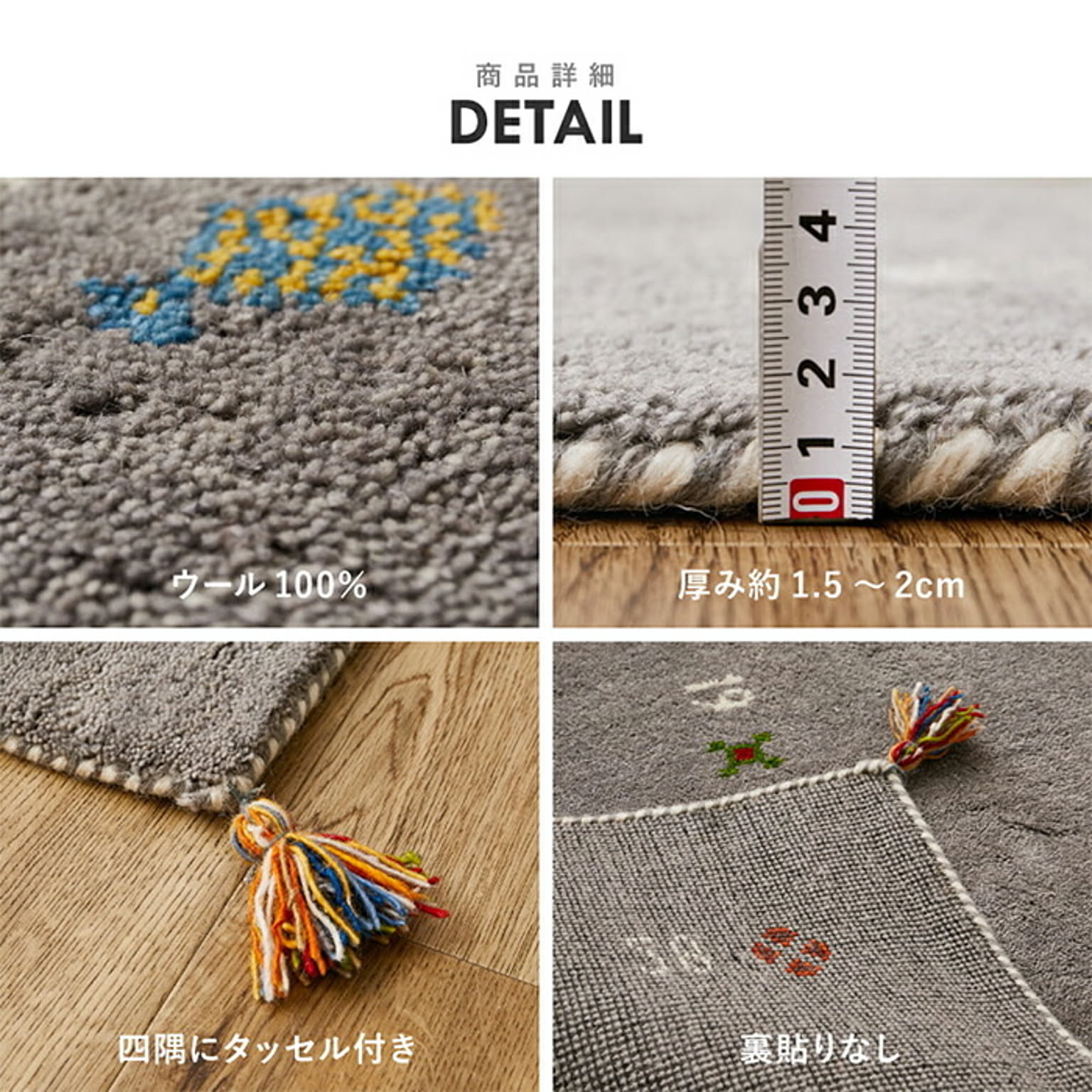 インドの職人が一枚一枚丁寧に織り上げた一点もの。ウ−ル素材は暖かく冬に適しているイメ−ジがありますが、温度差の激しい環境で育った羊から取れる羊毛は、保温性と湿度を調節する機能に優れています。夏の湿気にも適しておりオ−ルシ−ズンご使用いただける素材です。しっかりとした密度と厚みで、ふかふかな座り心地をお楽しみいただけます。裏面も同素材で床にやさしい仕様です。四隅にはタッセルをあしらい、愛らしさをプラスしました。