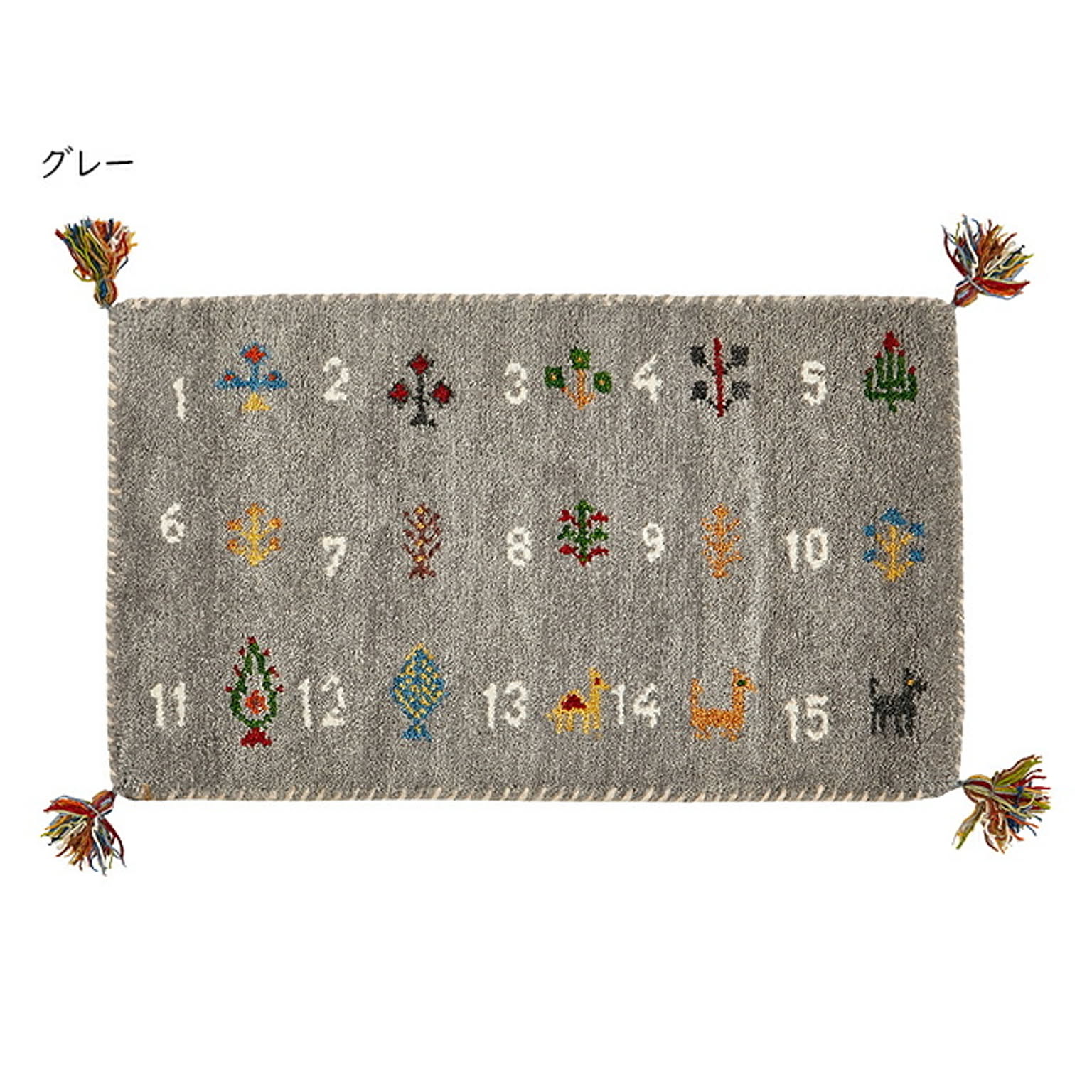 インドの職人が一枚一枚丁寧に織り上げた一点もの。ウ−ル素材は暖かく冬に適しているイメ−ジがありますが、温度差の激しい環境で育った羊から取れる羊毛は、保温性と湿度を調節する機能に優れています。夏の湿気にも適しておりオ−ルシ−ズンご使用いただける素材です。しっかりとした密度と厚みで、ふかふかな座り心地をお楽しみいただけます。裏面も同素材で床にやさしい仕様です。四隅にはタッセルをあしらい、愛らしさをプラスしました。