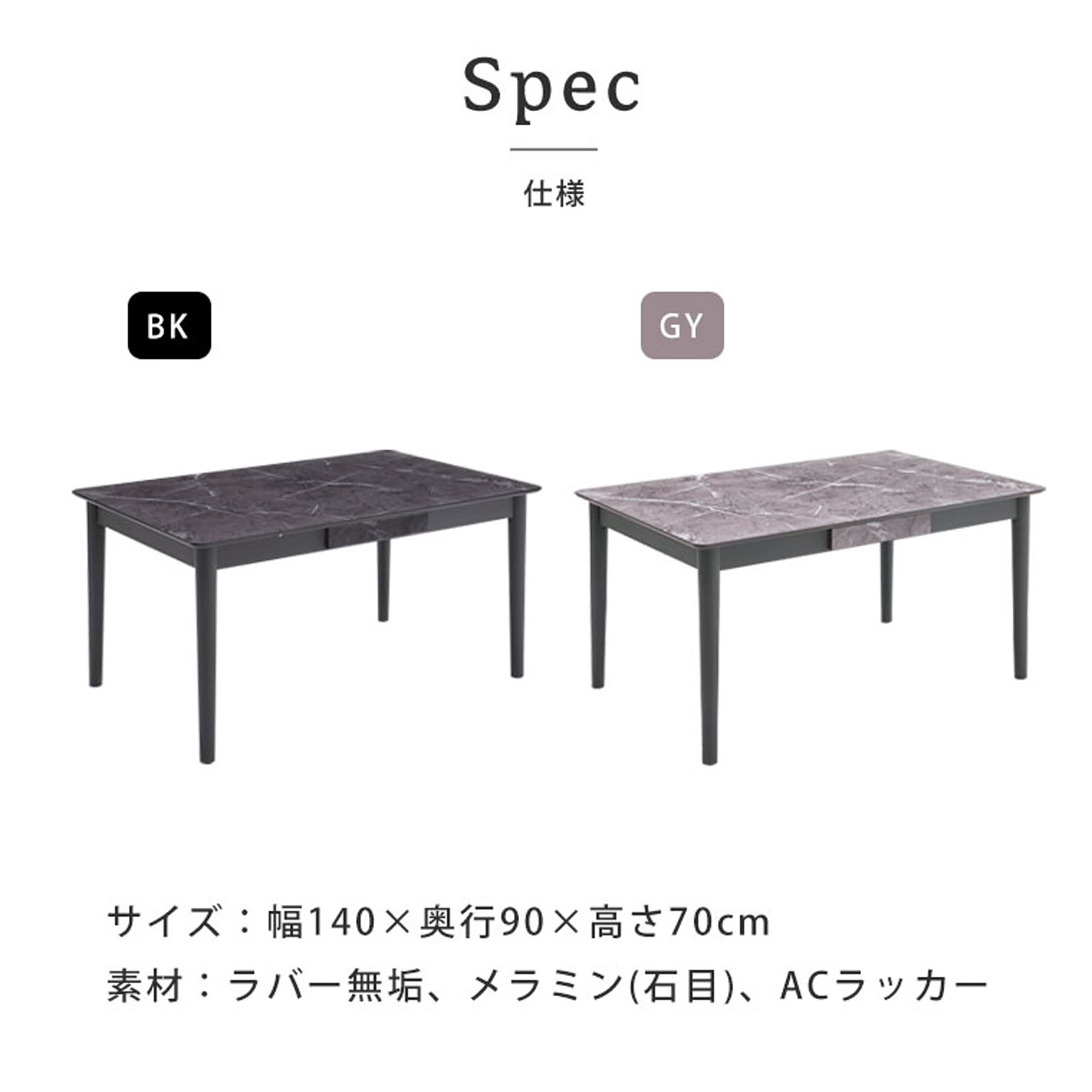 ■商品サイズ 幅140×奥行90×高さ70cm 引出し内寸:幅34.5×奥行27.5×高さ4.5cm 重量:23kg ■材質 ラバー無垢 メラミン(石目) ■商品詳細 組立品 ブラックとグレーの2カラー 引出2杯付き ※グレーは完売致しました。 ■商品説明 高級感のある石目柄が目を引く、モダンでシンプルなデザイン。4人掛けとして配置しやすいサイズ感と、引出し収納が嬉しい、暮らしに寄り添う上質なダイニングテーブル。 ■注意事項 撮影及び表示画面の関係で、実際の色と異なって見える場合がございます。