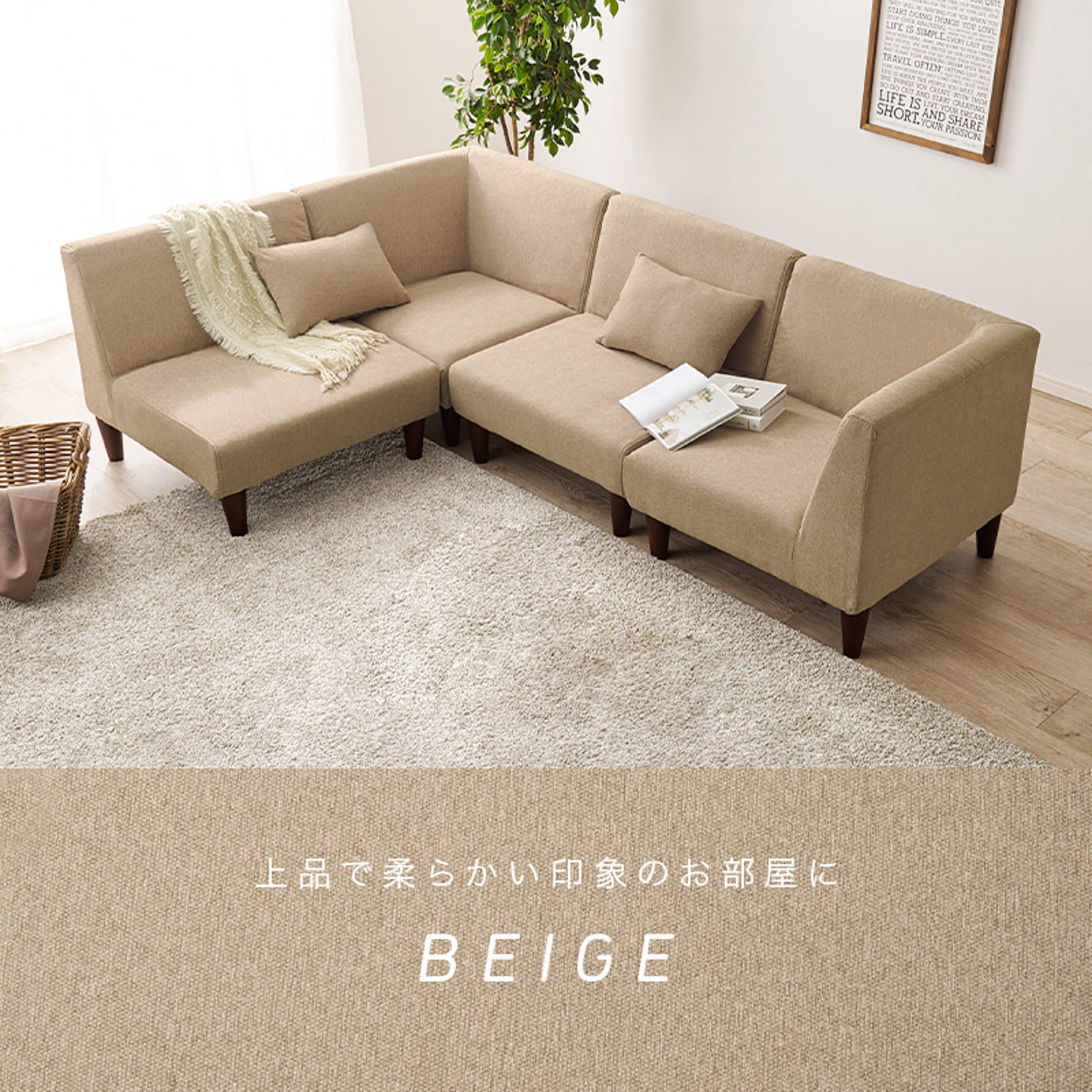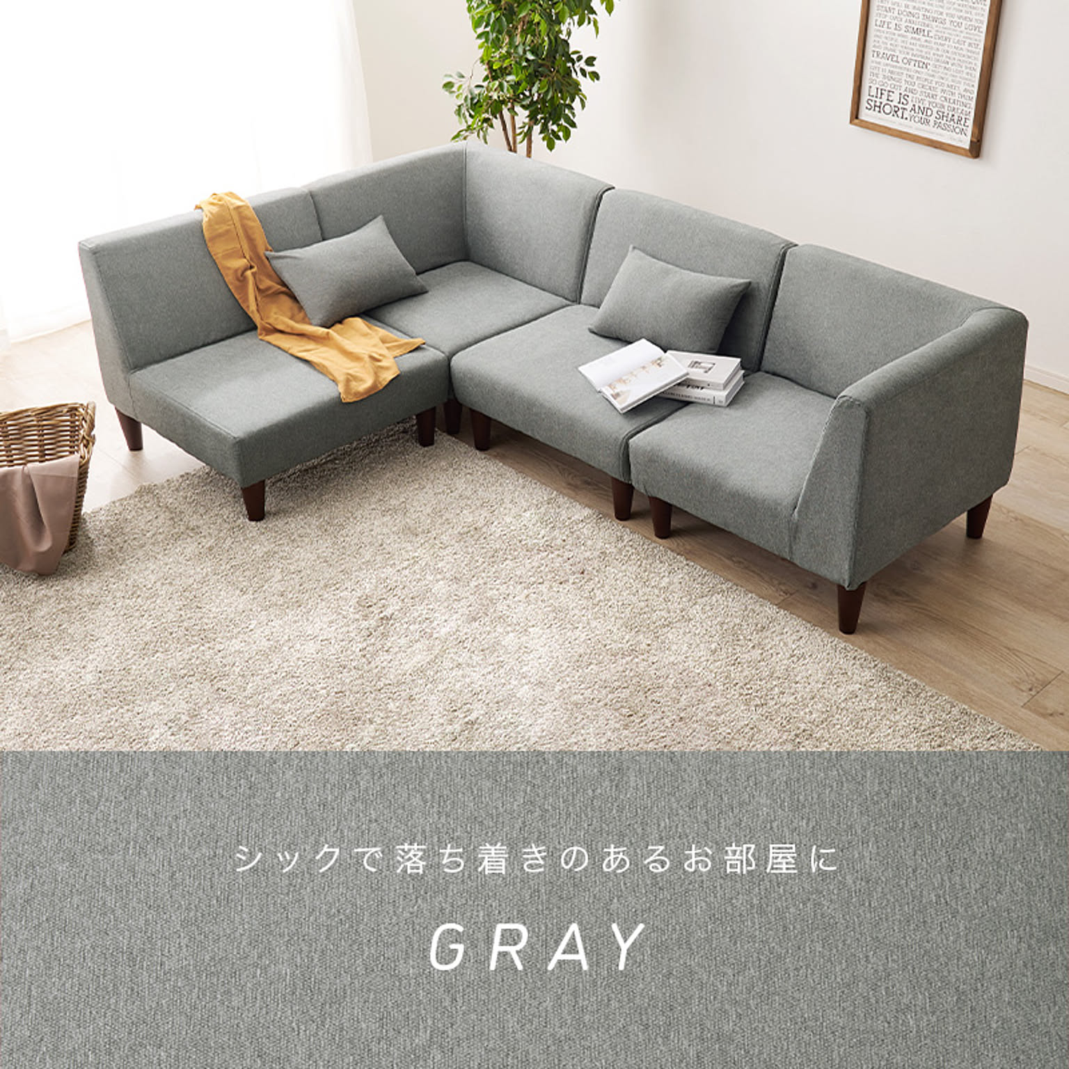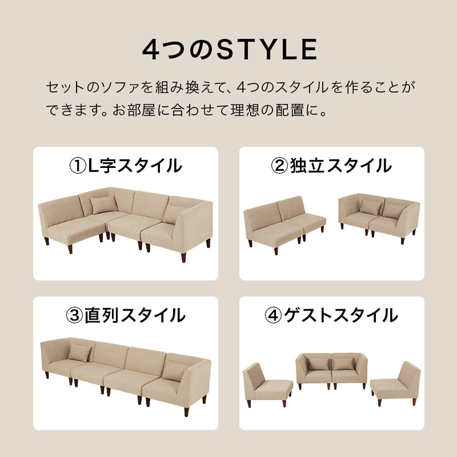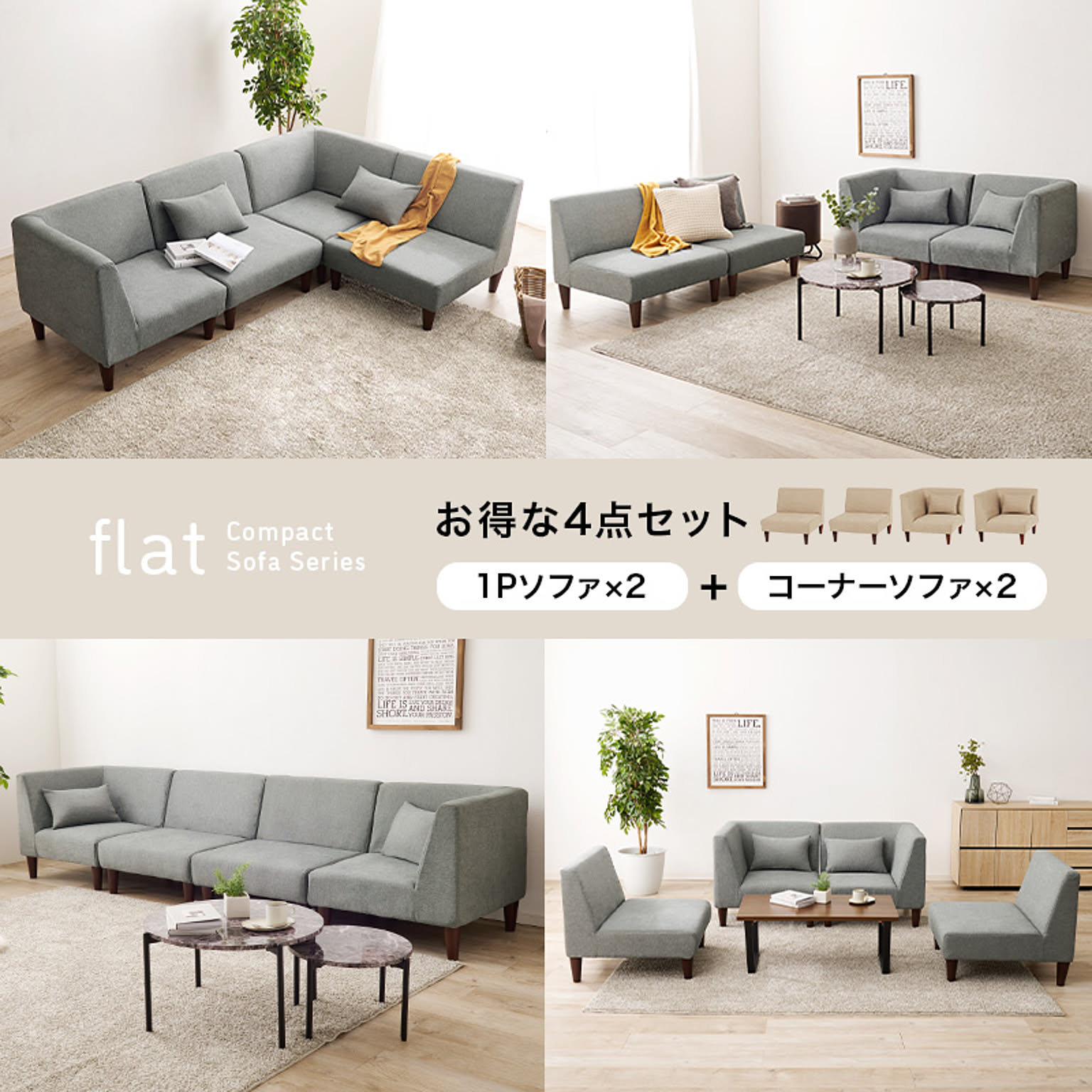 一人掛けソファ2個・コーナーソファ2個の4点セットで、組み替えて使えるユニットソファ。