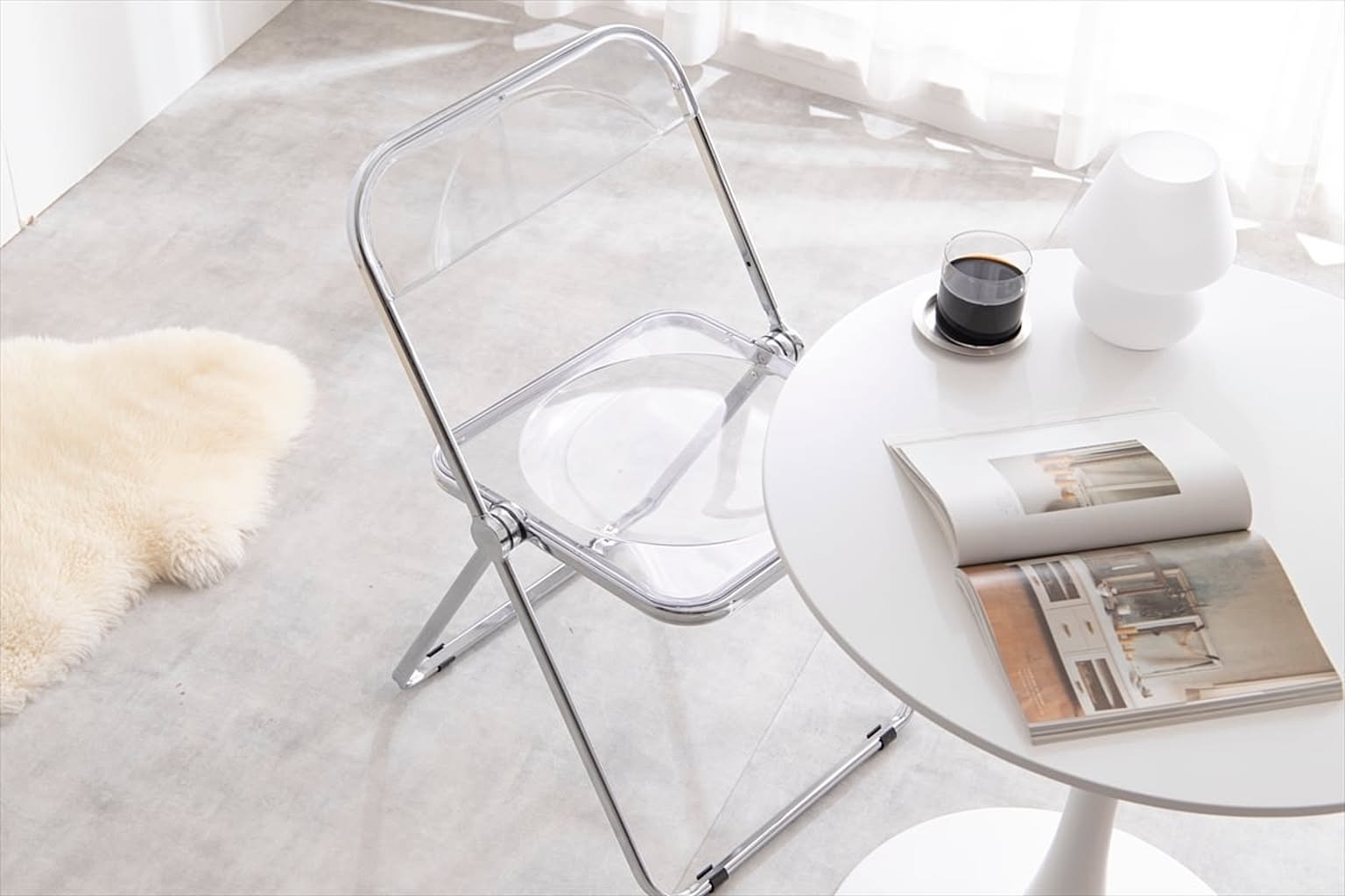 透明度が高く美しい座面と背もたれメシルバーフレームの組み合わせが印象的な折りたたみクリアチェア。透明感溢れるデザインでお部屋に溶け込みつつも、アクセントとなる存在感を発揮しま す。また、折りたたみ可能で、使わない時は省スペース保管できて便利です。