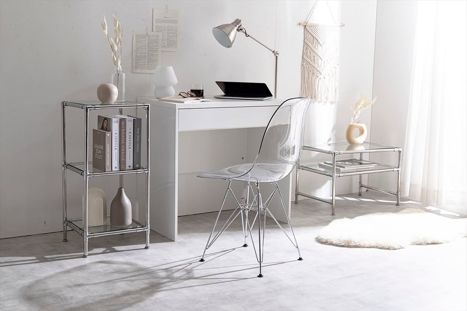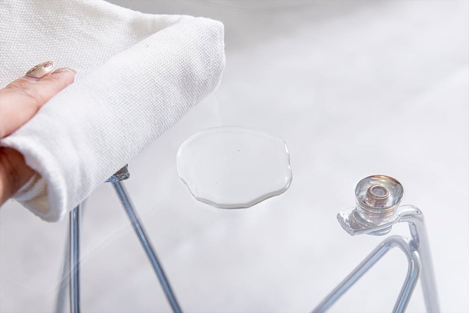 シルバーの光沢感が美しい脚部。透明感あふれるチェア全体をスタイリッシュに引き締め、存在感を発揮します。また、耐久性に優れたクローム仕上げで、さびにくく長くお使いいただけます。