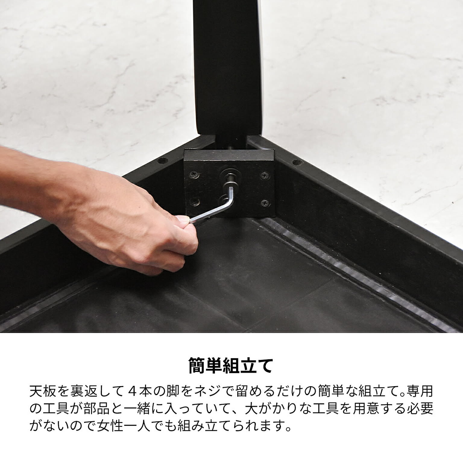本物のように美しい木目が特徴の木目調と、さらりとした大理石調の天板がヴィンテージライクなテーブル。 特殊な素材で作られた天板は衝撃や熱に強く耐久性に優れた作りになっています。 カラーは3色展開で定番のブラック×木目調とブラック×大理石調2色。個性的ですが置くだけで垢抜けるデザインです。 【 商品コード 】 OKA-XXX-0016 【 商品名 】 大川家具 KLAN 135テーブル 【 商品仕様 】 ■ サイズ: W1350×D800×H710mm ■ 素材: 天板:高圧化粧繊維板 脚:ラバーウッド無垢 ■ 仕様: ■ 素材天板:高圧化粧繊維板 脚:ラバーウッド無垢 ■ 形状お客様組立 【 商品詳細 】 ■ ポイント ・すっきりとしたシックなデザイン ・シームレスでスタイリッシュ ・テーパード型の脚 ・耐久性の高い天板 ・本物のような見た目 ・さらりとした触り心地 ・軽量で頑丈 ・アジャスター付き ・簡単組立て ■ シックにまとめる 本物のように美しい木目が特徴のウッド調天板、さらりとした大理石調天板の2種類。 スマートな印象を与える薄い天板とブラックのフレームと脚がシックなデザインを強調させます。 ■ シームレスですっきりと 天板と周縁に継ぎ目のないシームレスでスマートなシルエットに。 シンプルかつ無駄のない仕上がりが、全体的なスタイリッシュさを上げます。 ■ スマートなテーパード脚 先が細くなっていくテーパード型の脚は全体をすっきり見せる効果があります。 角があるので天板のシャープな印象とマッチしてかっちりとした雰囲気にまとめ上げます。 ■ 耐久性の高い天板 一般的なメラミンよりも強い特殊な素材『メラミナイト』を使うことで耐久力がさらにアップ。 熱・水・摩擦、紫外線と様々なトラブルに強くなっているので、長くお使いいただけます。 ■ 本物のように美しい ヴィンテージな木目調とマーブルな大理石調の天板は、ナチュラルな模様で作られているのでまるで本物のようなデザイン。 セラミックのように重すぎないテーブルとして使いやすい材質はそのままに、美しい質感を再現しています。 ■ さらりとした触り心地 さらりと手触りのいい天板はマットな質感で高級感があります。表面に光沢が少ないので 落ち着いた雰囲気になりわざとらしすぎない絶妙な仕上がりになっています。、 ■ アジャスター付き 脚の裏には高さを調節できるがたつきを防止のアジャスターがそれぞれについています。 使わない場合はアジャスターを締めきれば脚の中に隠れるのでデザインを損ないません。 ■ 簡単組立て 裏返した天板に4つの脚をボルトで取り付けるだけの簡単組立て。 専用の部品付きで工具不要、女性一人でも組み立てられるシンプルな構造です。 ※角に差し込んだ脚の根本をしっかりと押さえながらねじ留めすると組み立てやすくなっています。