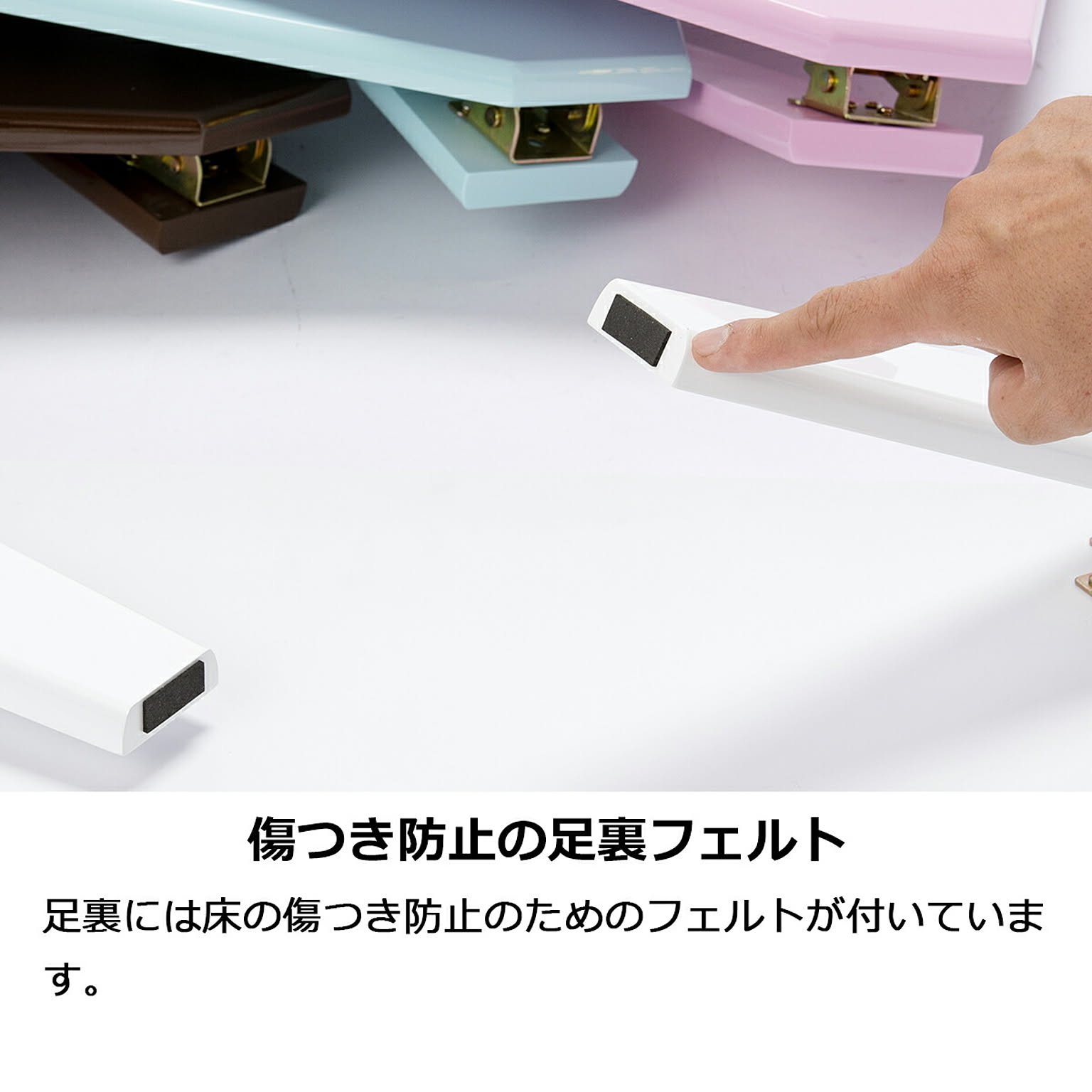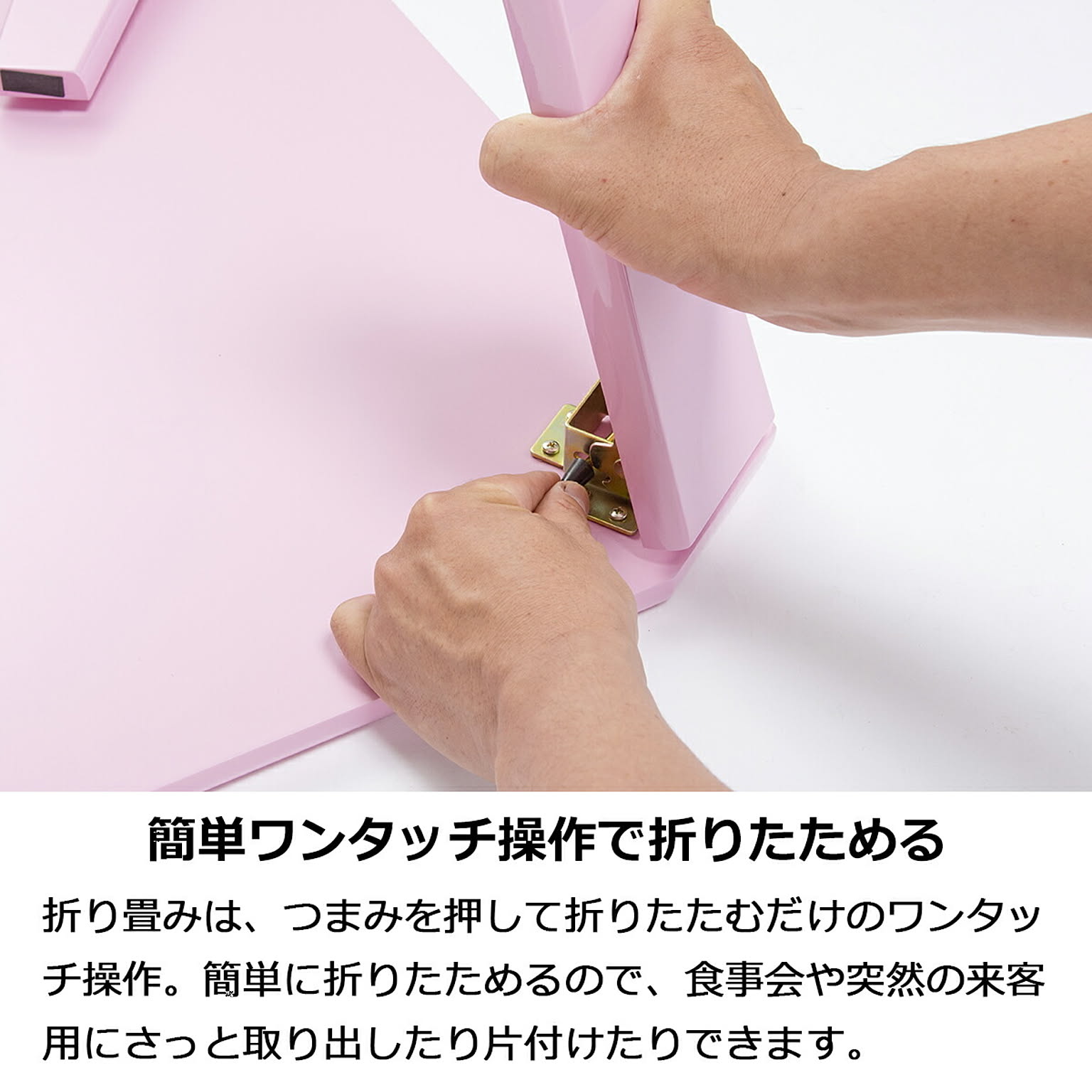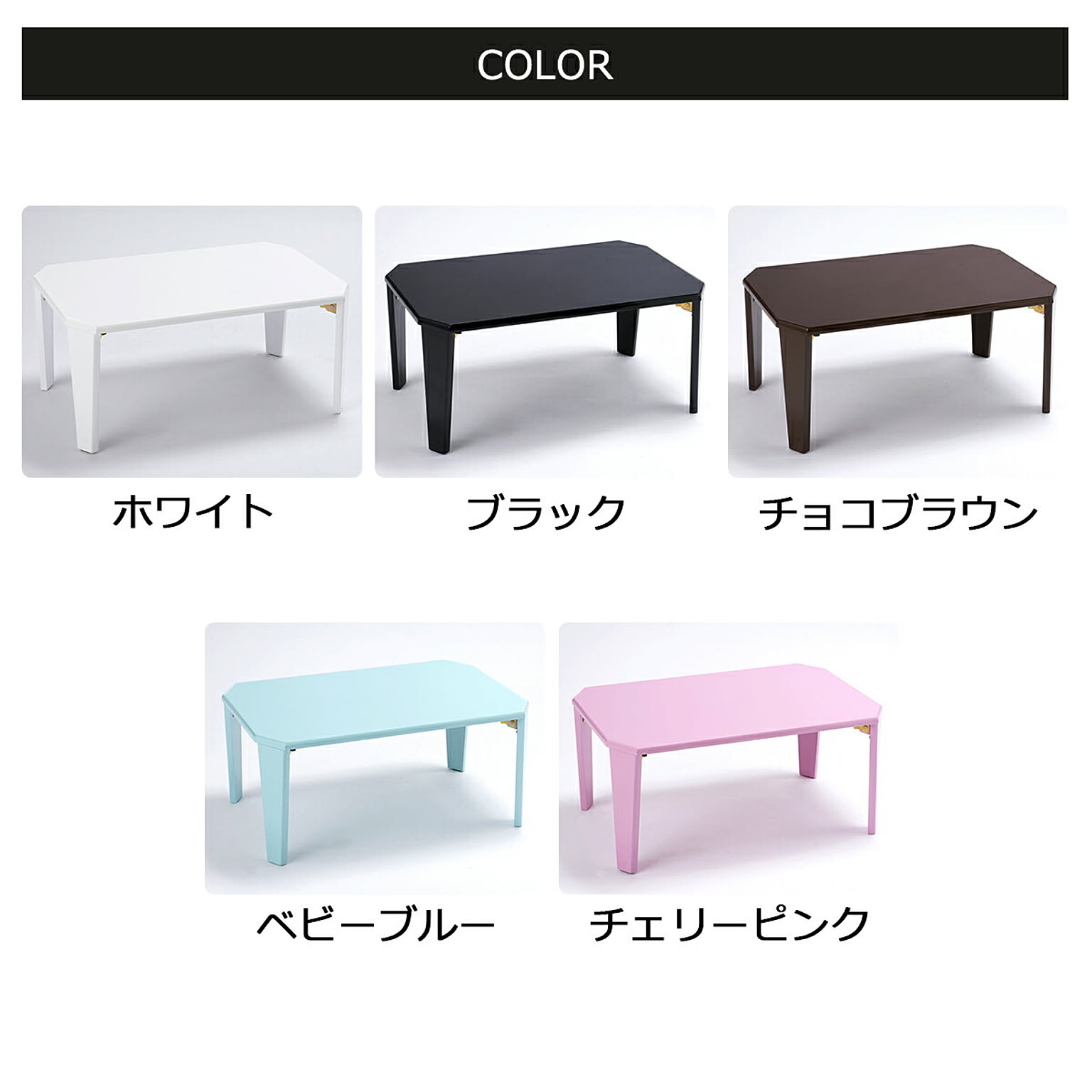 脚が折りたためて、コンパクトで出し入れしやすい完成品の可愛いローテーブル。お子様も思わず「可愛い」と言ってしまうパステル系の色展開。一人暮らしや子供部屋におすすめの「チョコっとテーブル」。 【 商品コード 】 VDE-XXX-0008 【 商品名 】 チョコっとテーブル 【 商品仕様 】 ■ サイズ: W700×D500×H320mm ■ 素材: 構造部材:天板/脚 MDF繊維板表面加工:天板/脚 ウレタン樹脂塗装 ■ 商品重量: 6.2kg ■ 耐荷重: - ■ 仕様: 〇原産国 : 中国〇組立て : 完成品 【 商品詳細 】 ■ コンパクトな折りたたみローテーブル コンパクトで出し入れしやすく使い勝手の良い、可愛いローテーブル。完成品なので届いたらすぐにお使いいただけます。 ■ 鏡面仕上げでお手入れ簡単 お部屋を彩る艶やかで光沢感のある鏡面仕上げは、傷に強く、汚れが拭き取りやすい加工です。 ■ 可愛いパステル系のカラー展開 カラーは「ホワイト」「ブック」「チョコブラウン」「ベビーブルー」「チェリーピンク」の5色展開。お子様でも思わず「可愛い」と言ってしまうパステル系のカラー。 ■ 簡単ワンタッチ操作で折りたためる 折り畳みは、つまみを押して折りたたむだけのワンタッチ操作。女性やお子様でも簡単に折りたためるので、食事会や突然の来客用にさっと取り出したり片づけたりできます。 ■ 安心の天板角丸仕上げ 天板の角は丸く仕上げているので、お子様のいるご家庭でも安心してお使いいただけます。 ■ 傷つき防止の足裏フェルト 足裏には、床の傷つき防止のためのフェルトが付いているので安心です。