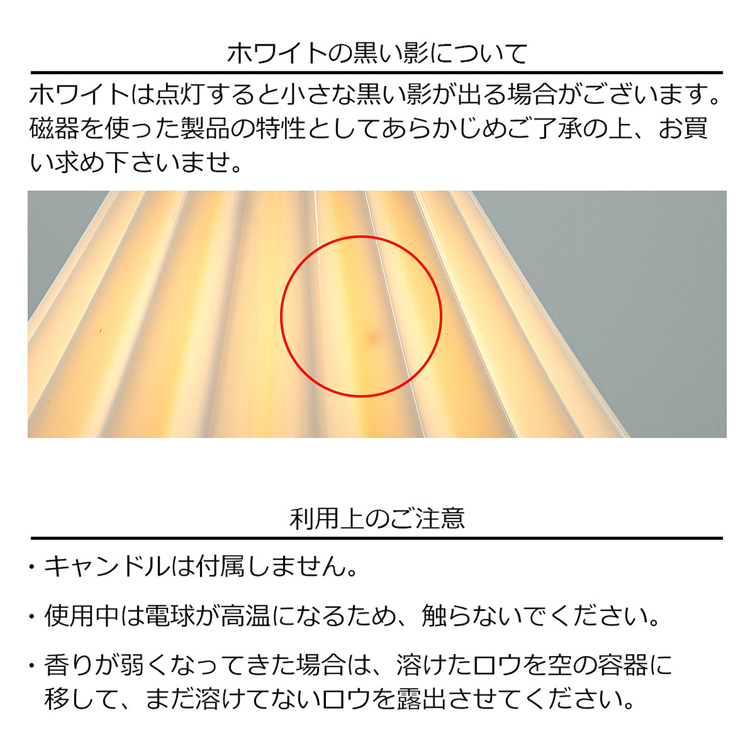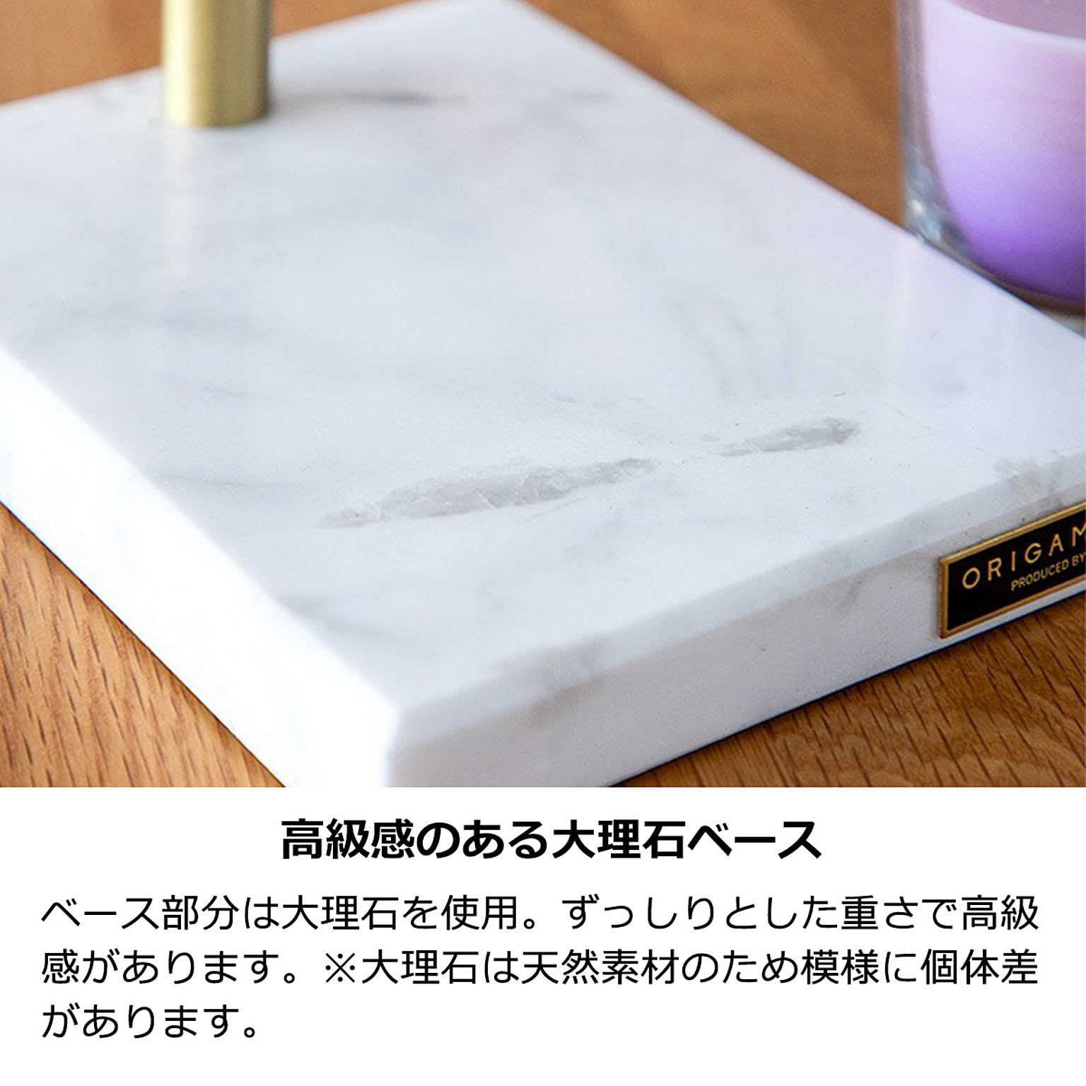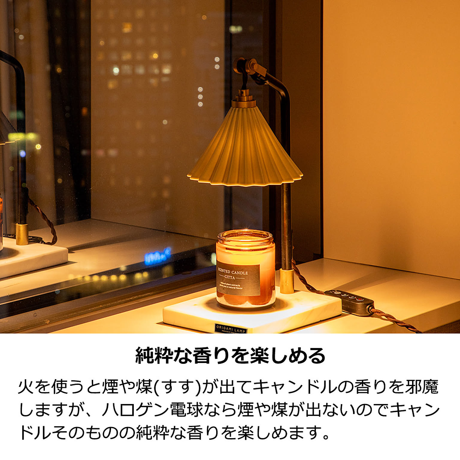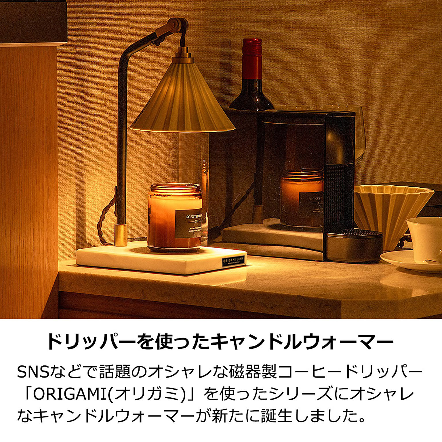 SNSなどで話題のオシャレな磁器製コーヒードリッパー「ORIGAMI(オリガミ)」を使ったシリーズにオシャレなキャンドルウォーマーが新たに誕生しました。磁器・真鍮・大理石・スチールなどの異素材を組み合わせたお部屋を格上げしてくれるオシャレなキャンドルウォーマーです。火を使わずハロゲン電球の熱でキャンドルを溶かして香りを拡散させるので小さいお子様やペットがいるシーンでも安心して使えます。また煙や煤(すす)が出ないので、キャンドルそのものの純粋な香りを楽しむことができます。ハロゲン電球を使った場合、ロウが溶けても気化しないのでお気に入りのキャンドルを減らさずに使えます。※ロウは減りませんが、使用するたびに香りの効果は薄くなっていきます。 磁器製のシェードは全部で13色。シェードは1つ1つ丁寧に作られた岐阜県の美濃焼を使用。キャンドルウォーマーとしてはもちろん間接照明としても利用可能、ベッドサイドなどにおいて読書灯として使うのもオススメです。ベースは高級感のある大理石で、ずっしりとした重さで高級感があります。(大理石は天然素材のため、模様に個体差があります)。明るさは4段階で調節可能。さらにスイッチのボタン長押しで無段階でも調節できます。便利なタイマー機能も用意、2・4・8時間から選べます。※キャンドルは付属しません。※使用中は電球が高温になるため触れないでください。【 商品コード 】 tic-xxx-0055 【 商品名 】 ORIGAMI LAMP CANDLE WARMER(オリガミランプ キャンドルウォーマー) 【 商品仕様 】 ■ サイズ: 幅14×奥行15×高さ33cm ケーブル長さ:1.8m(本体からスイッチまで20cm) ■ 素材: 磁器、スチール、大理石、真鍮 ■ 商品重量: 2100g ■ 生産国: シェード:日本(岐阜県美濃) 本体:中国 ■ 仕様: 口金GU10 35ワット タイマー:2・4・8時間 調光:4段階/ボタン長押しで無段階調節 付属品:電球2個、保証書 メーカー保証1年 【 商品詳細 】 ■ ポイント ・人気のドリッパーがキャンドルウォーマーに ・異素材の組み合わせがオシャレ ・火を使わないから安心 ・純粋な香りを楽しめる ・お気に入りのキャンドルも減らずに使える ・シェードのカラーは全部で13色 ・間接照明としても活躍 ・高級感のある大理石ベース ・アクセントになるロゴプレート ・アンティーク感を生み出す真鍮 ・明るさ調節可能 ・便利なタイマー機能 ■ 人気のコーヒードリッパーがキャンドルウォーマーに SNSなどで話題のオシャレな磁器製コーヒードリッパー「ORIGAMI(オリガミ)」を使ったシリーズにオシャレなキャンドルウォーマーが新たに誕生しました。 ■ 異素材の組み合わせがオシャレ 磁器・真鍮・大理石・スチールなどの異素材を組み合わせたお部屋を格上げしてくれるオシャレなキャンドルウォーマーです。 ■ 火を使わないから安心 火を使わずハロゲン電球の熱でキャンドルを溶かして香りを拡散させるので、小さいお子様やペットがいるシーンでも安心して使えます。 ■ 純粋な香りを楽しめる 煙や煤(すす)が出ないので、キャンドルそのものの純粋な香りを楽しむことができます ■ お気に入りのキャンドルも減らずに使える ハロゲン電球を使った場合、ロウが溶けても気化しないのでお気に入りのキャンドルを減らさずに使えます。※ロウは減りませんが、使用するたびに香りの効果は薄くなっていきます。 ■ シェードのカラーは全部で13色 磁器製のシェードは1つ1つ丁寧に作られた岐阜県の美濃焼を使用。シェードは全部で13色でビビッドな色から淡い色まで取り揃えています。 ■ 高級感のある大理石ベース ベースは高級感のある大理石で、ずっしりとした重さで高級感があります。(大理石は天然素材のため、模様に個体差があります) ■ 間接照明としても活躍 キャンドルウォーマーとしてはもちろん間接照明としても利用可能、ベッドサイドなどにおいて読書灯として使うのもオススメです ■ アクセントになるロゴプレート 大理石のベースにはロゴの入ったプレートを配置、ホワイトの大理石に映えてちょうどよいアクセントになっています。 ■ アンティーク感を生み出す真鍮 ランプをつるす滑車やソケットカバーは落ち着いた上品な輝きを放つ真鍮を採用。アンティークで上品な雰囲気に仕上げました。 ■ 明るさ調節可能 明るさは4段階。スイッチのボタン長押しで無段階の調節にも対応しています。※暗くしすぎるとキャンドルが溶けなくなるのでご注意ください。 ■ 便利なタイマー機能 付属のスイッチを使えば時間経過でオフになるオフタイマーも利用可能。時間は2・4・8から選べます。