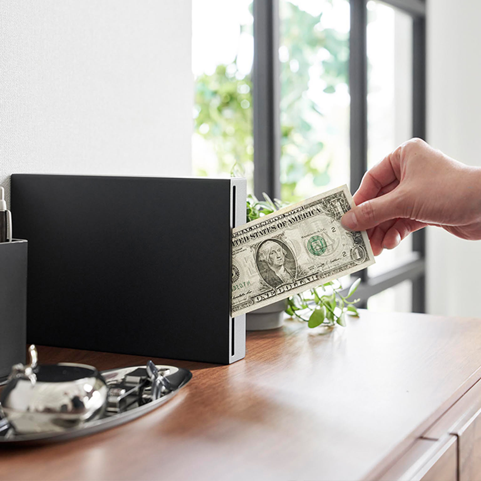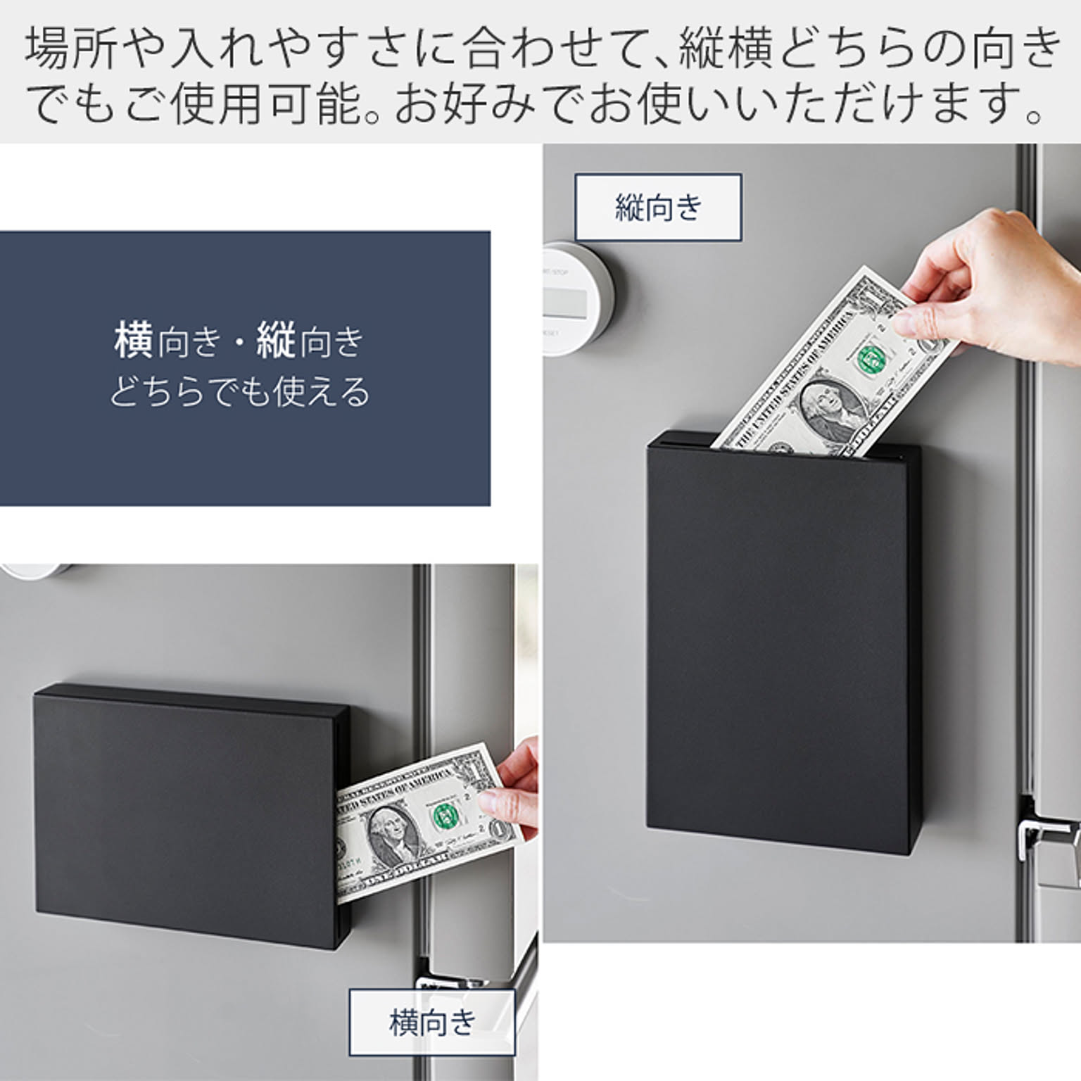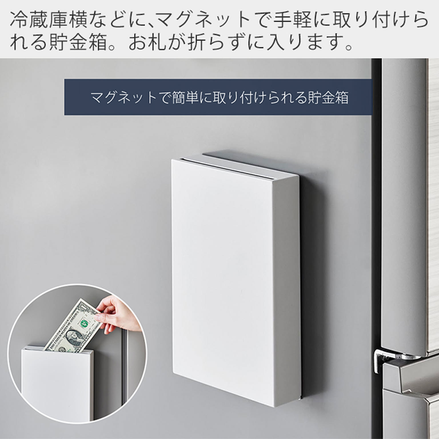 マグネットで取り付けてお手軽に貯金!お札が折らずに入るマグネット貯金箱です。