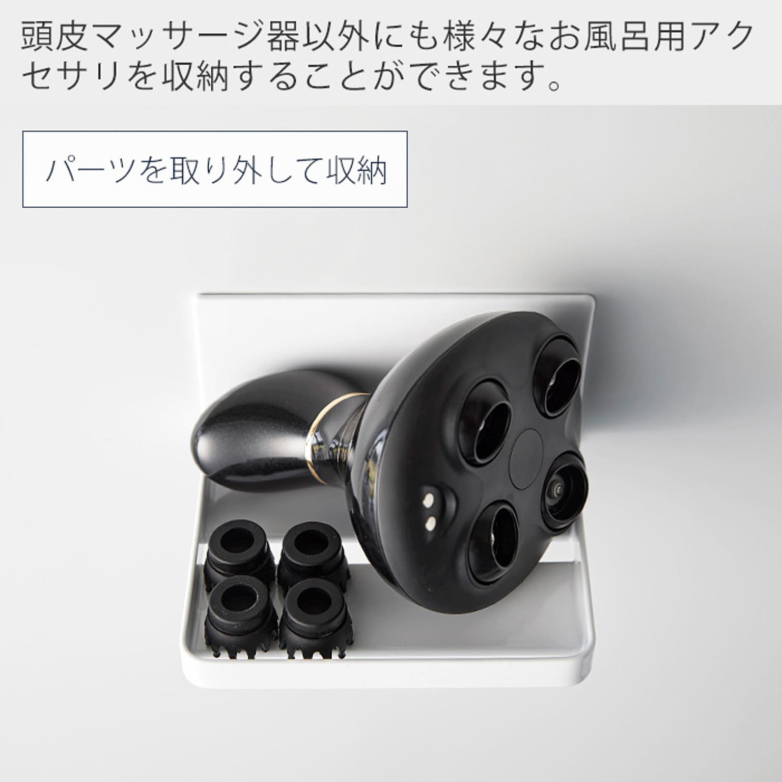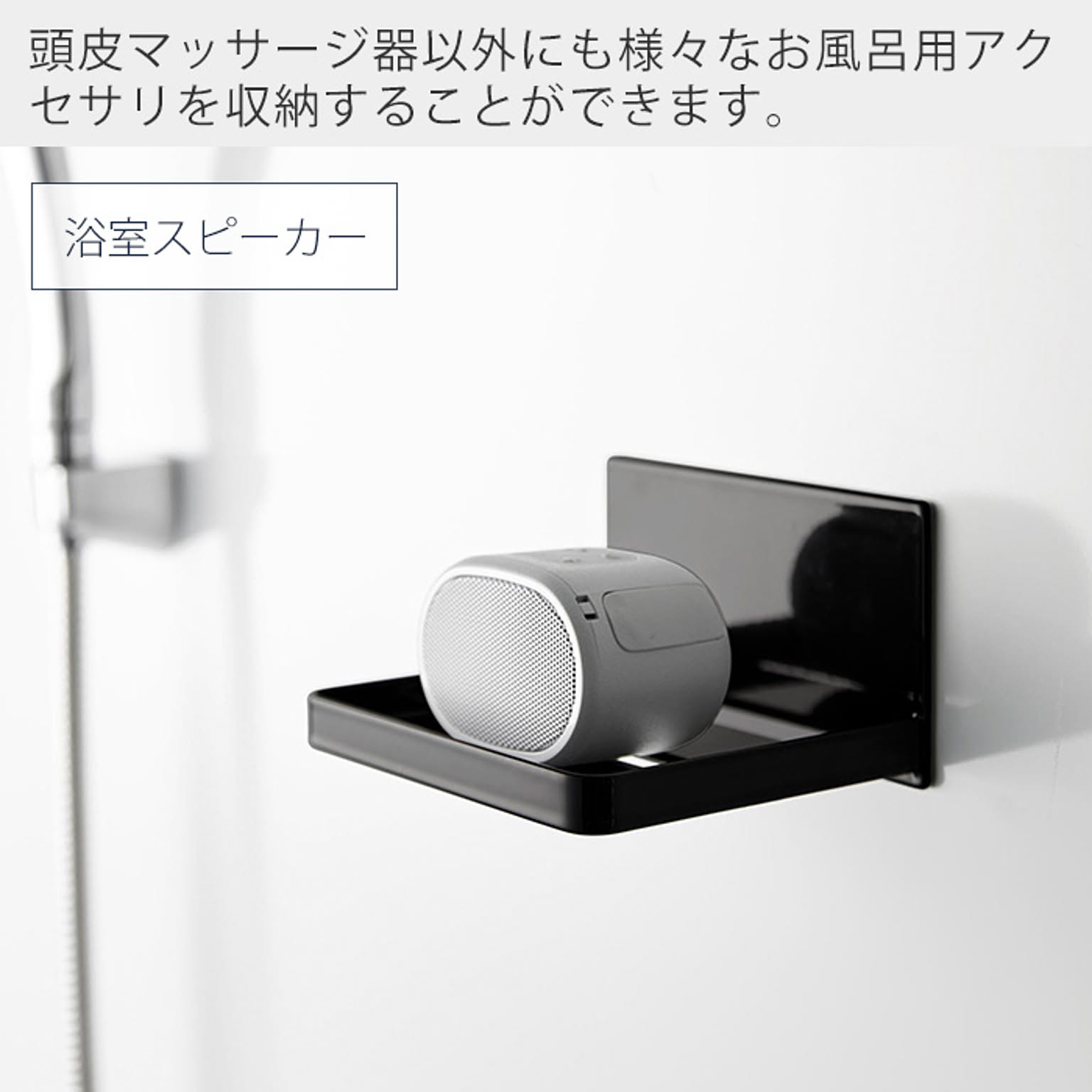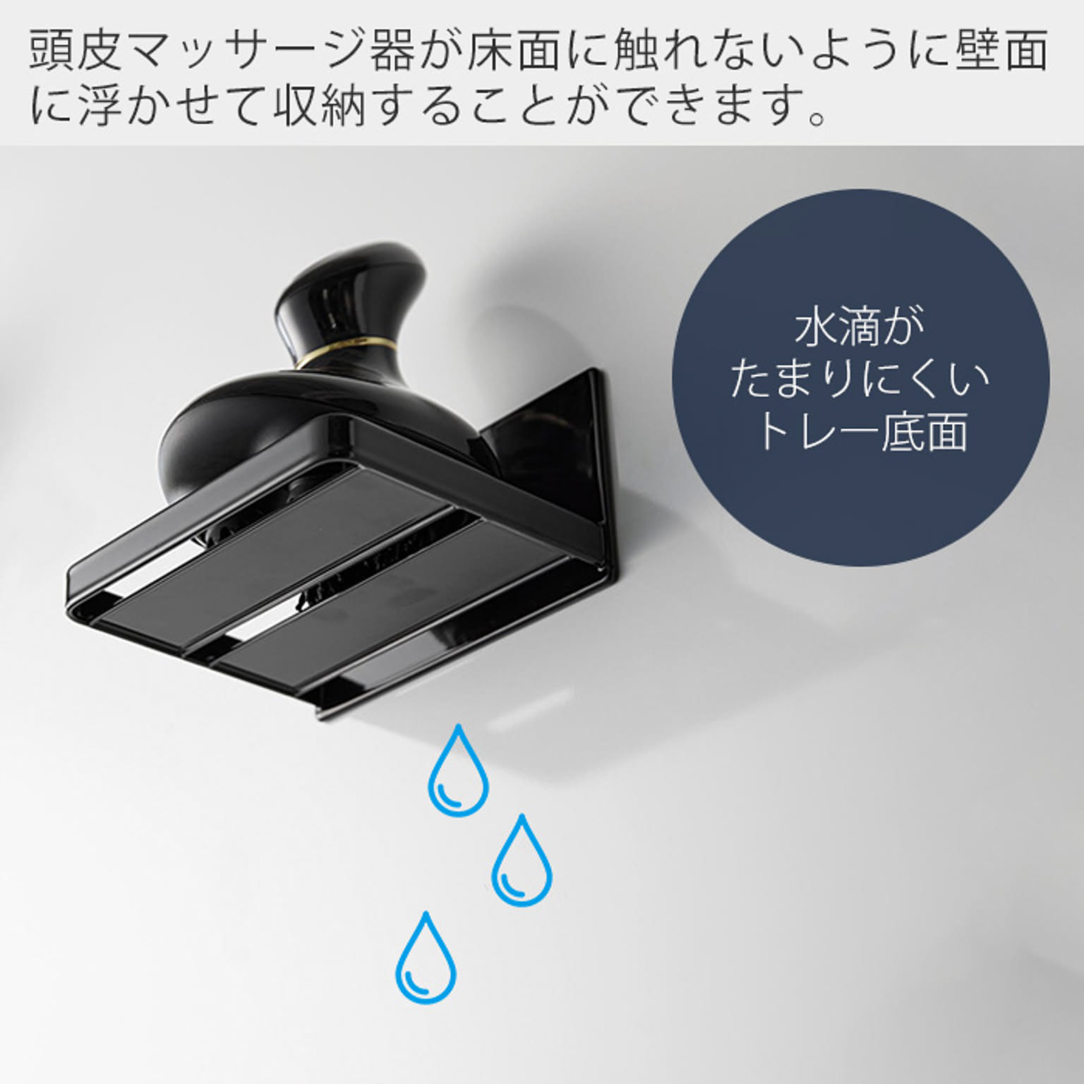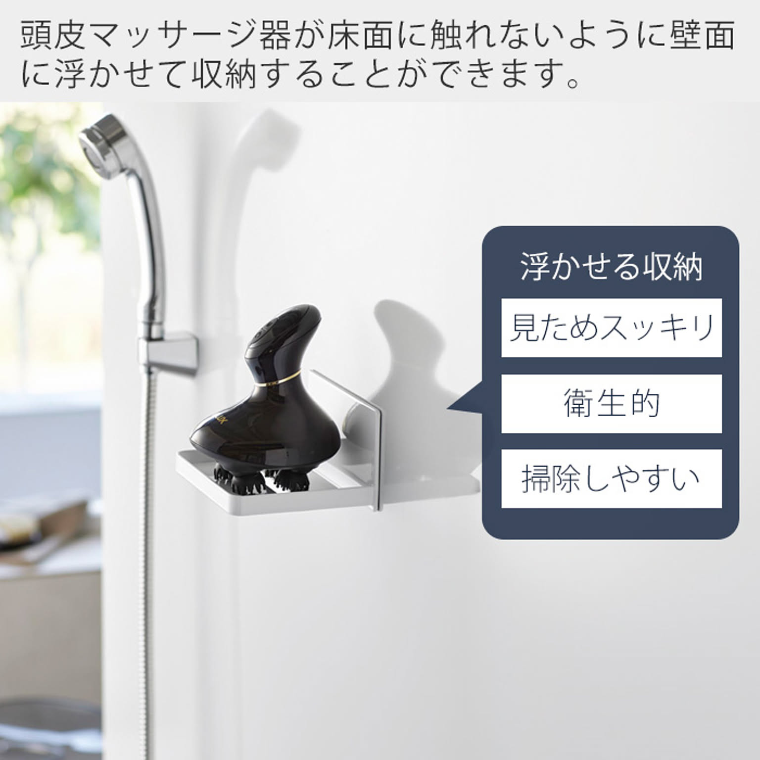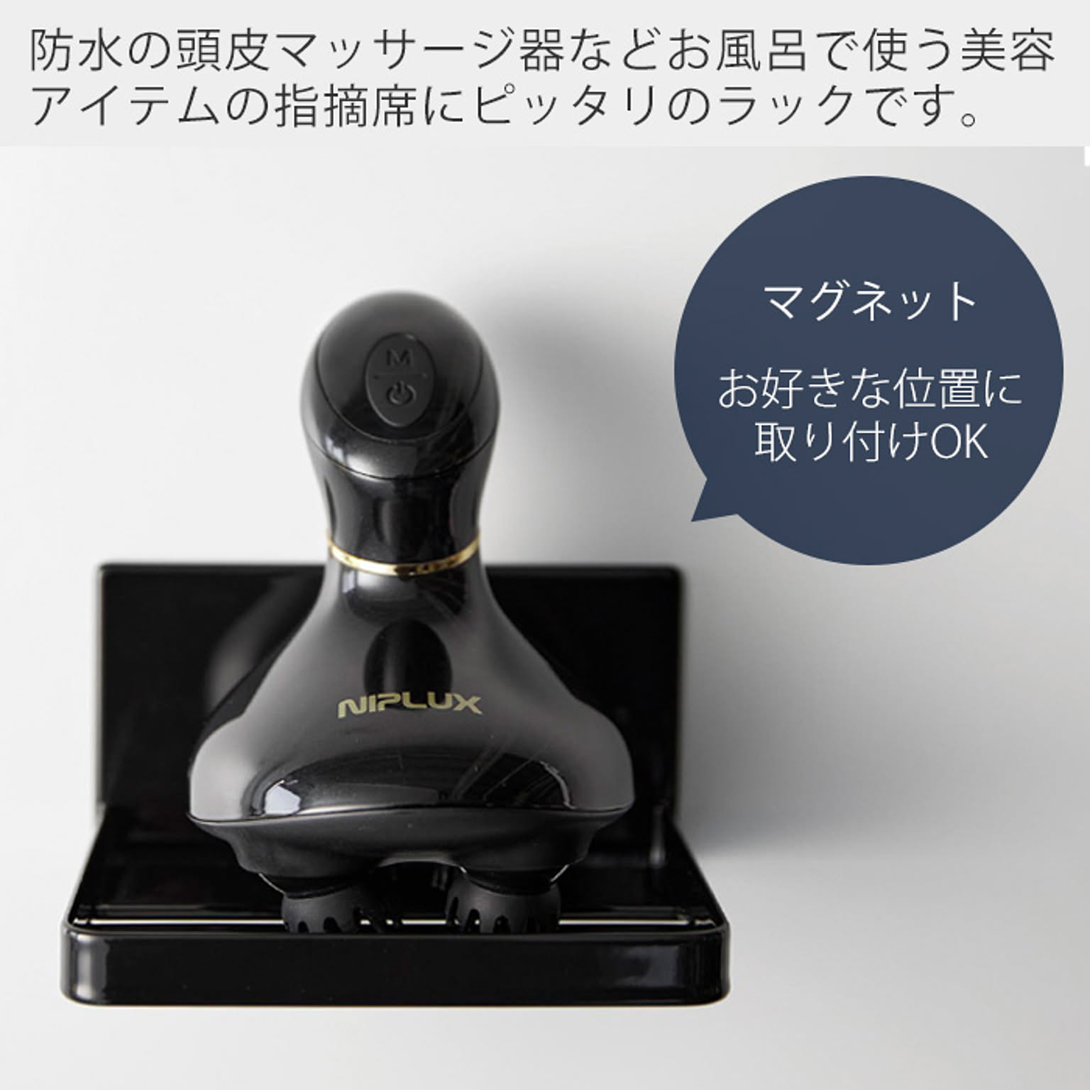 お風呂で使える防水の頭皮マッサージ器をマグネットで浮かせて収納することができるラックです。お風呂で使う美容アイテムの指定席にぴったり。シャワーで濡れない位置に取り付けできるので安心です。お風呂スピーカーなどの収納にも便利。フック付きで小物を掛ける事ができます。