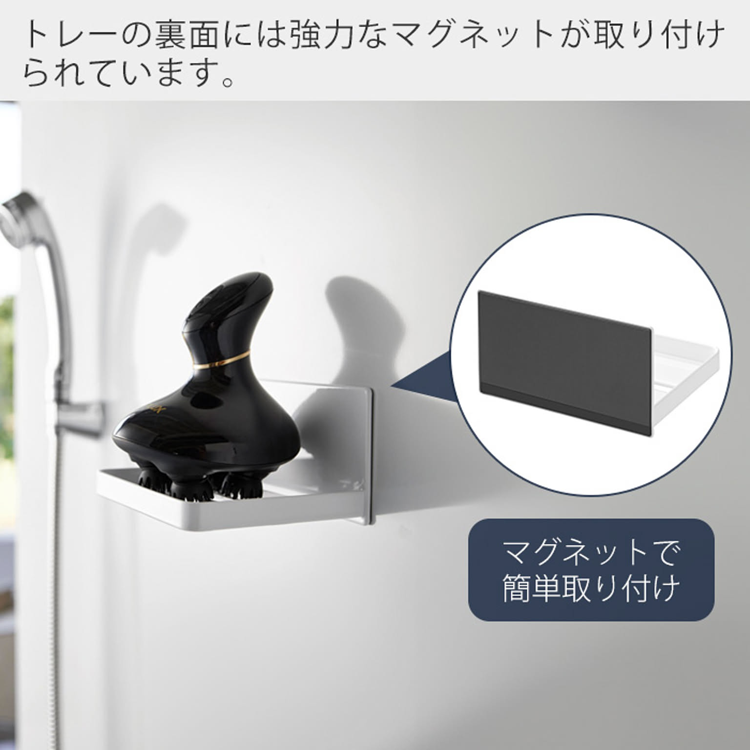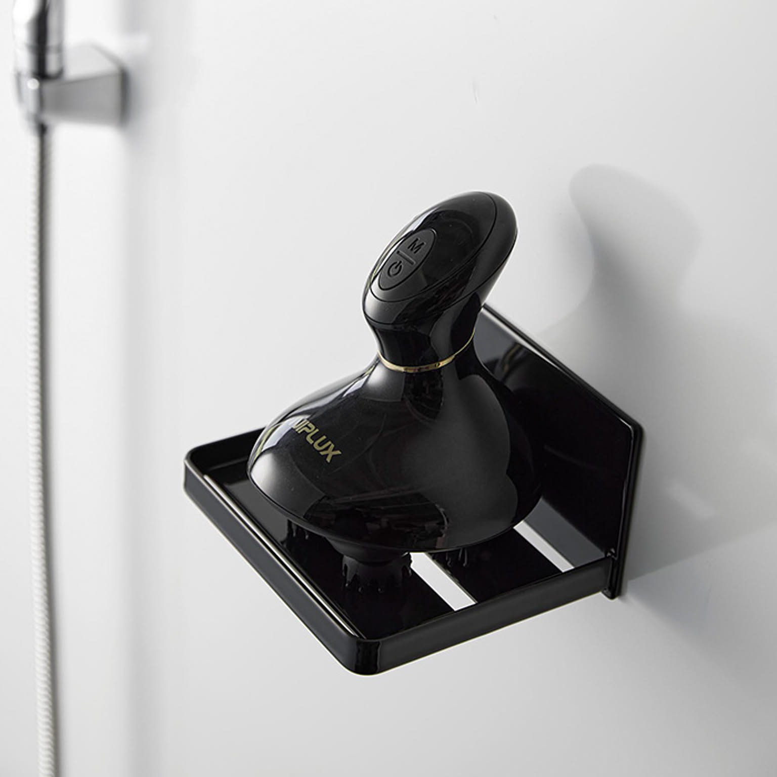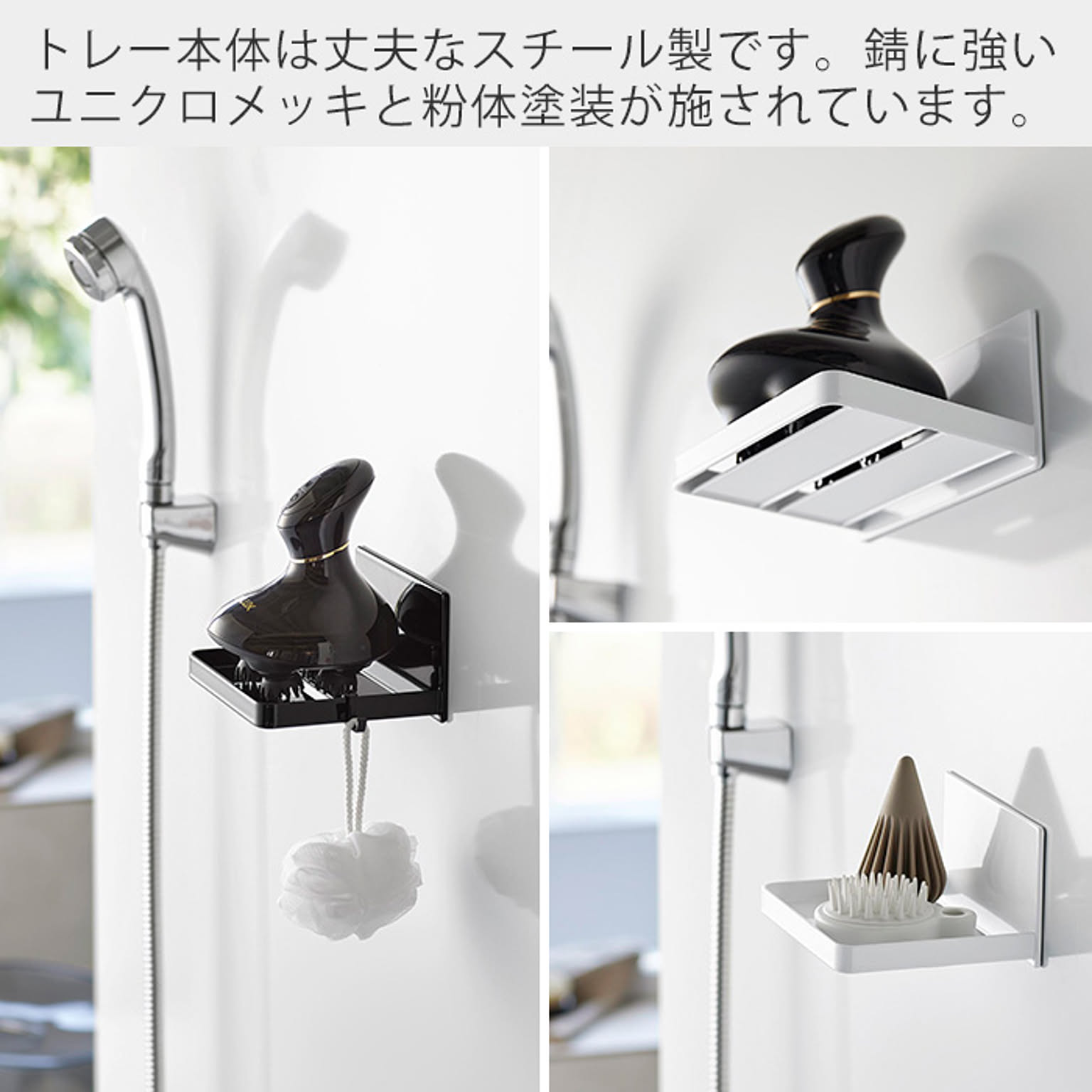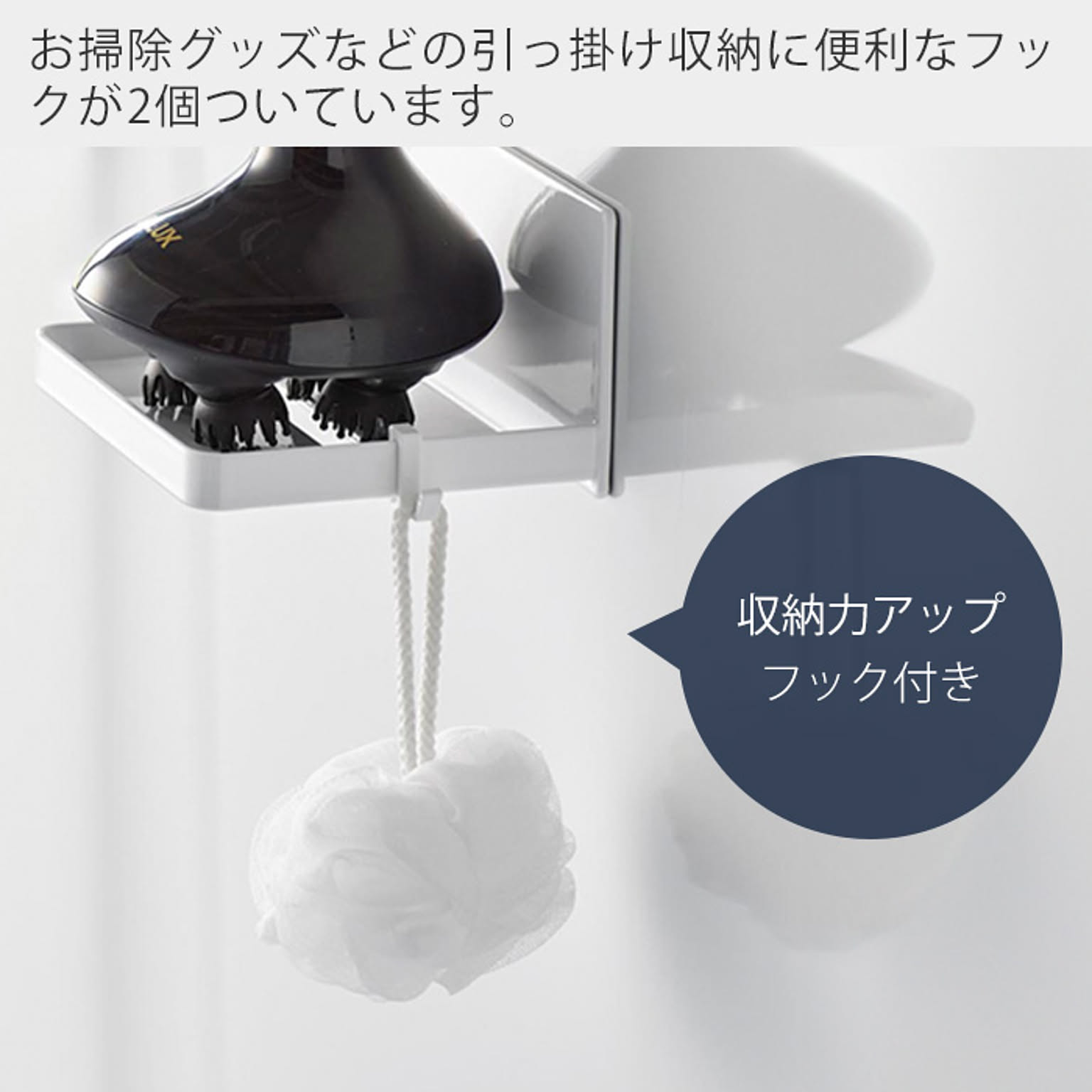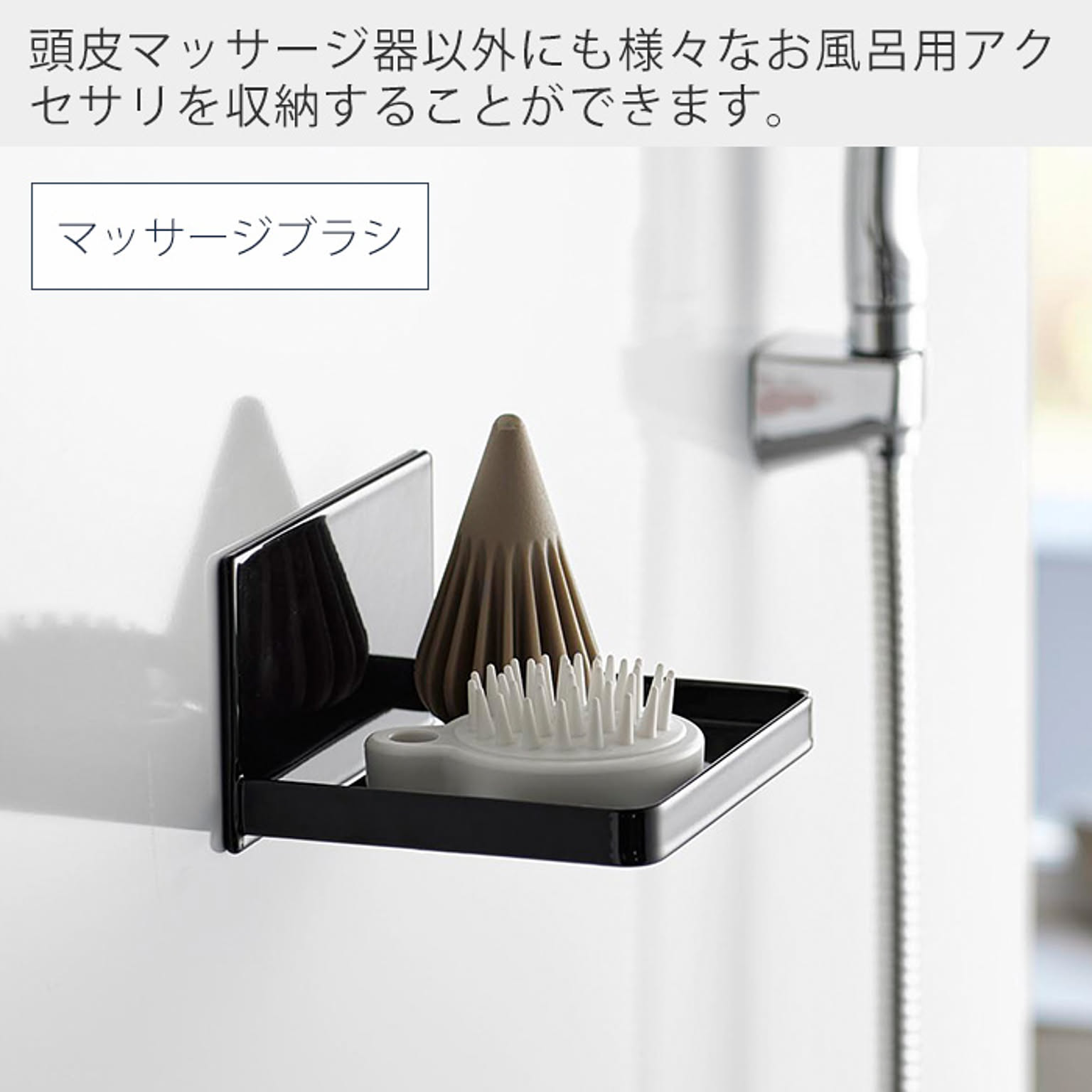 お風呂で使える防水の頭皮マッサージ器をマグネットで浮かせて収納することができるラックです。お風呂で使う美容アイテムの指定席にぴったり。シャワーで濡れない位置に取り付けできるので安心です。お風呂スピーカーなどの収納にも便利。フック付きで小物を掛ける事ができます。
