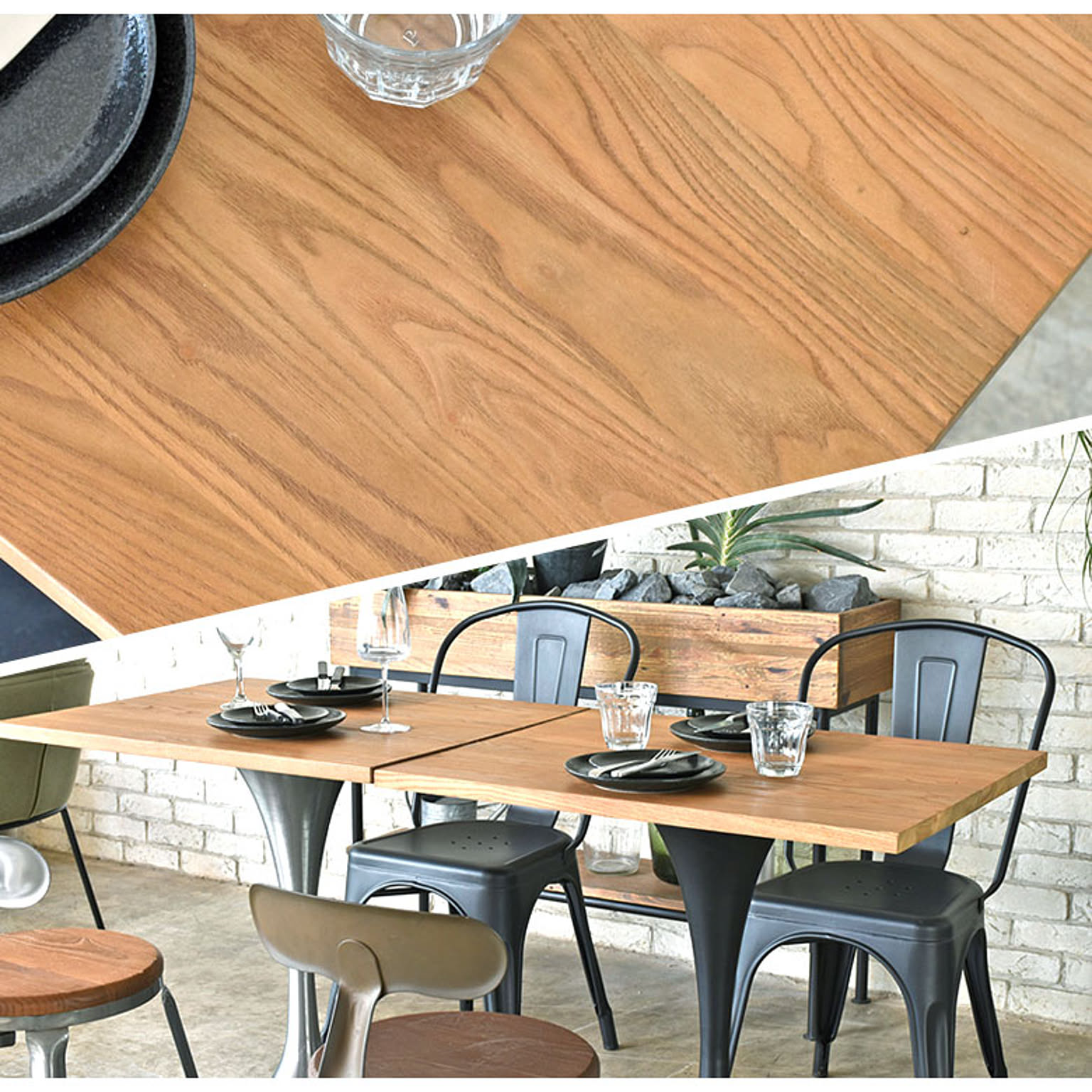 絶妙な曲線デザインがお洒落な雰囲気を醸し出す木製カフェテーブル。無垢天板とスチールの組み合わせがヴィンテージやインダストリアルなテイストを演出。天板はウレタン塗装を施しており、耐水性にも優れています。壁付けや、2つ並べて配置するのもオススメです。
