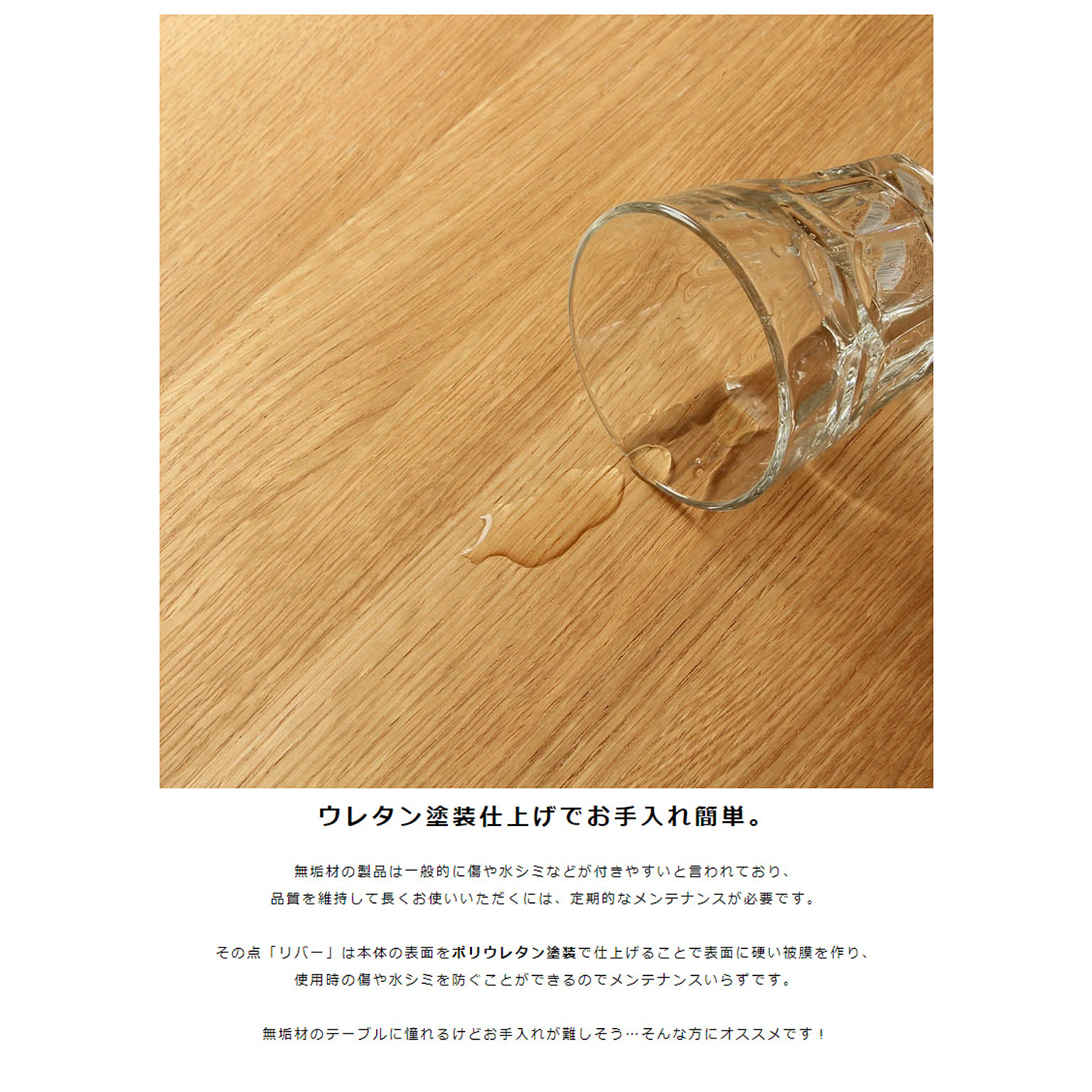 「リバー」は、天然木ならではの特性を持ちます。木目や色味、節の位置は個体ごとに異なり、それぞれが唯一無二の表情を持っています。これらは、天然木の美しさと魅力の一部であり、あなたの生活空間に自然のアートをもたらします。時間と共に深まる木の色合いと風合いを楽しみ、自然との調和を感じてください。