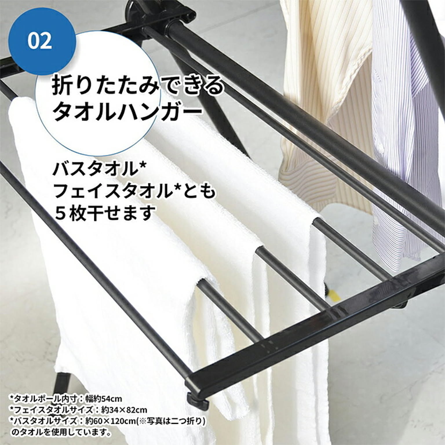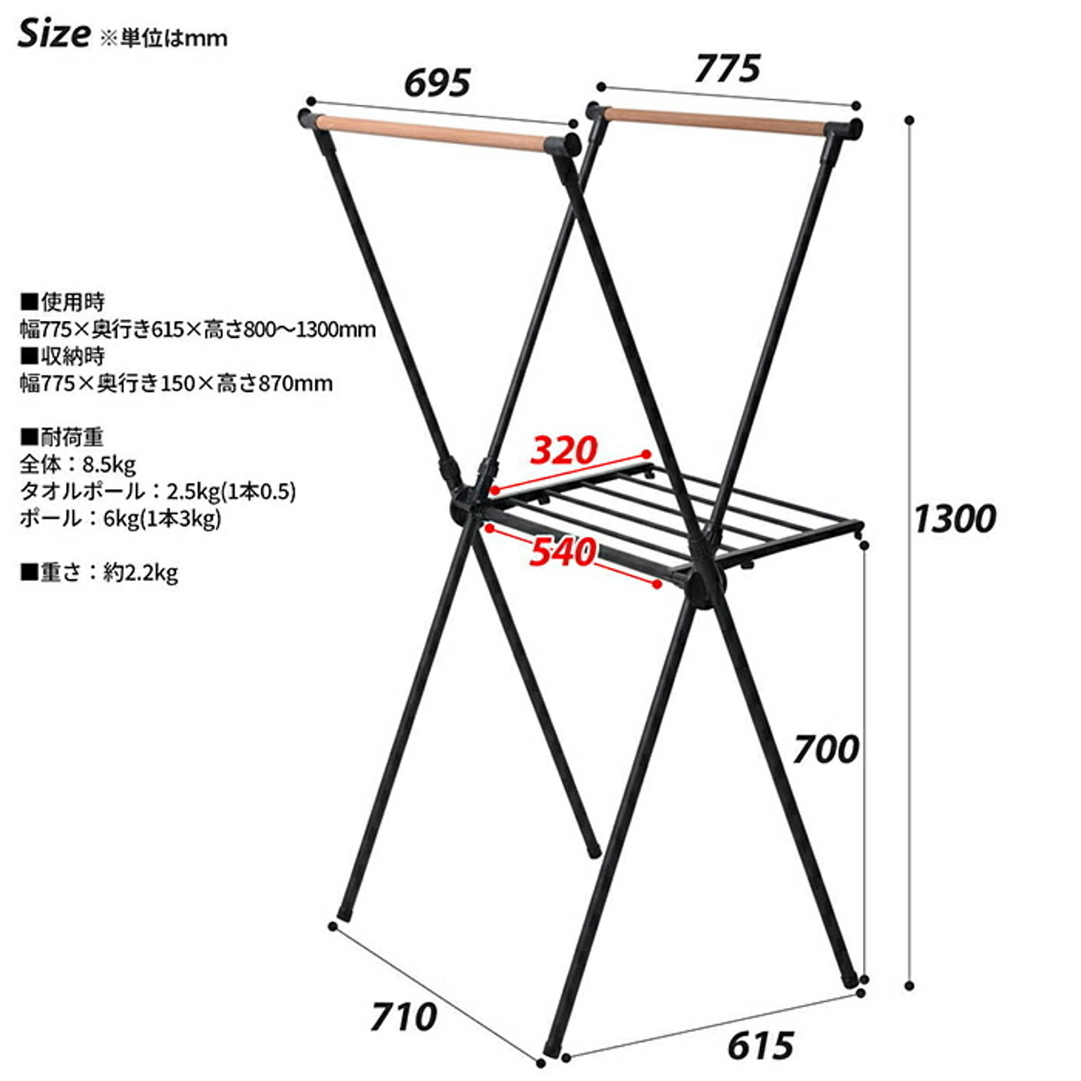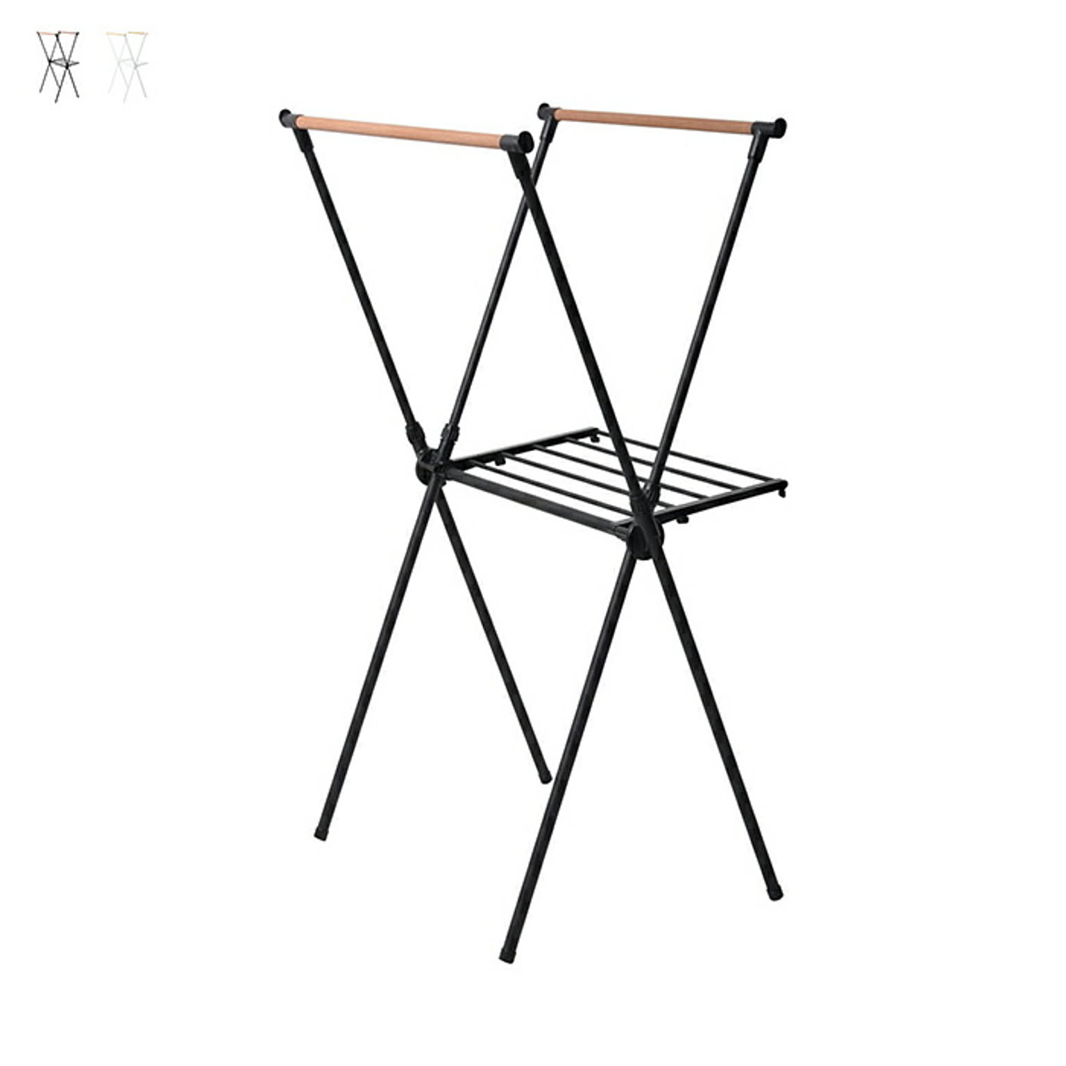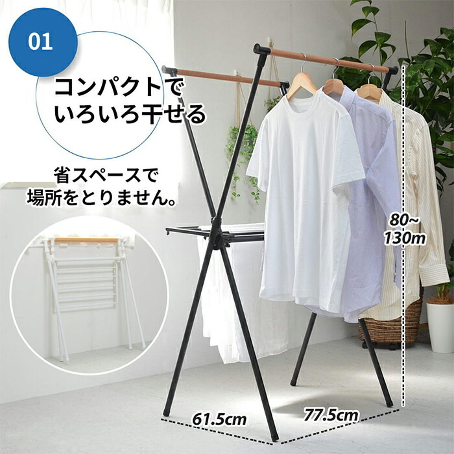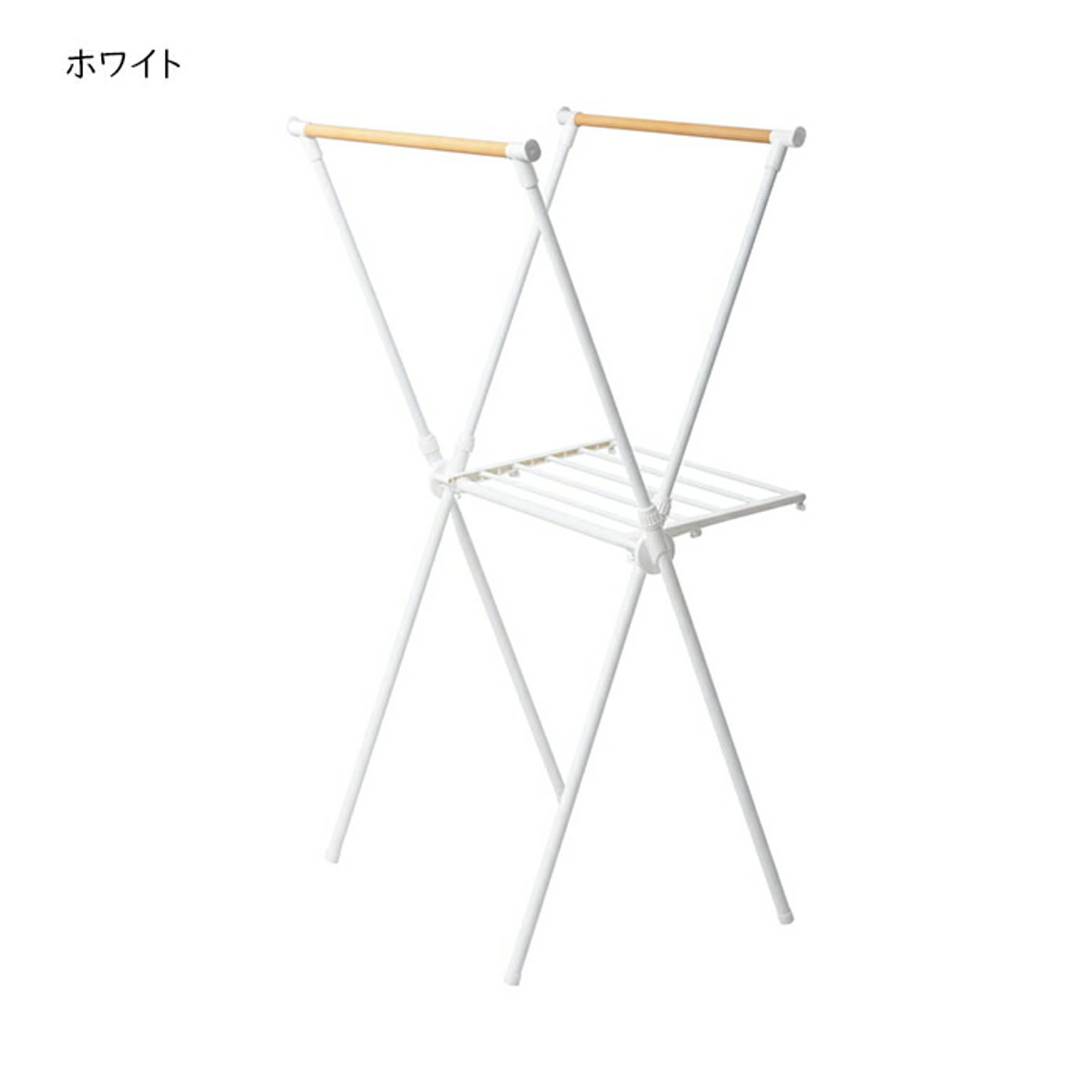 クロス型のコンパクトな洗濯物干しラック。さっと片付けられる折りたたみ式で場所を取らず、1〜2人の洗濯物が干せるので、室内干しやちょっとした洗濯物を干すのに便利。上部のバーはそれぞれ伸縮可能で用途に合わせて調節可能です。