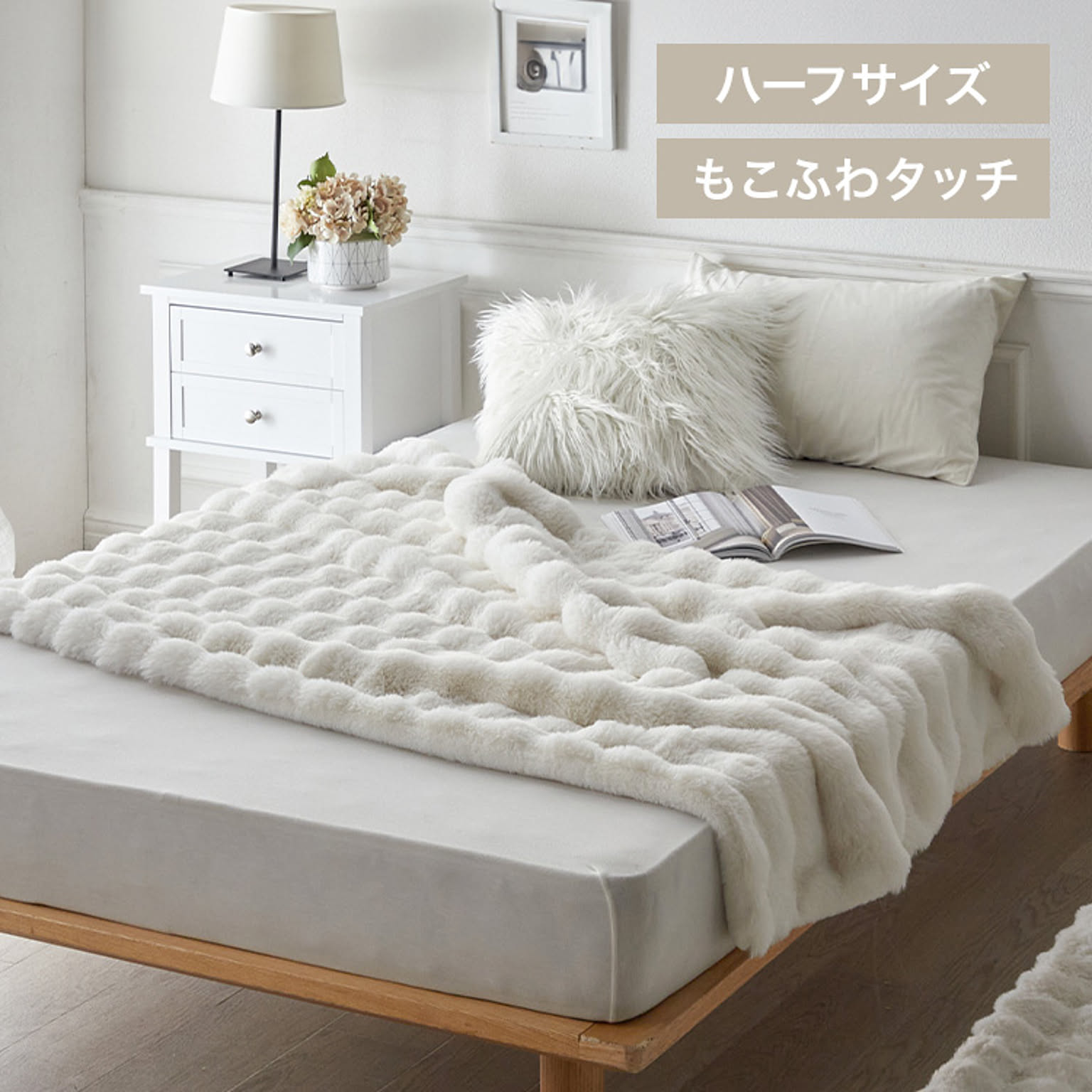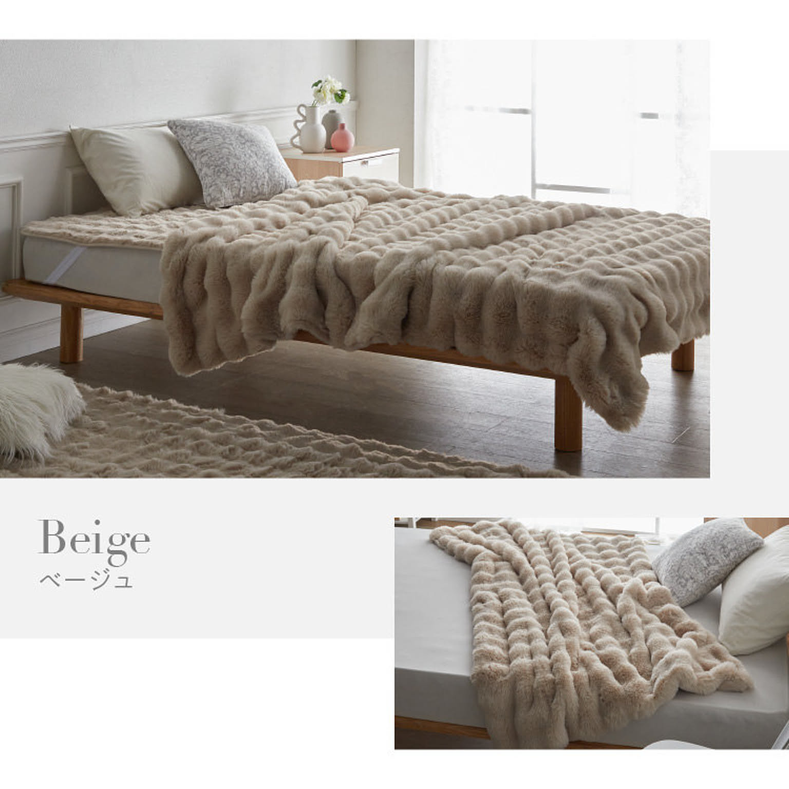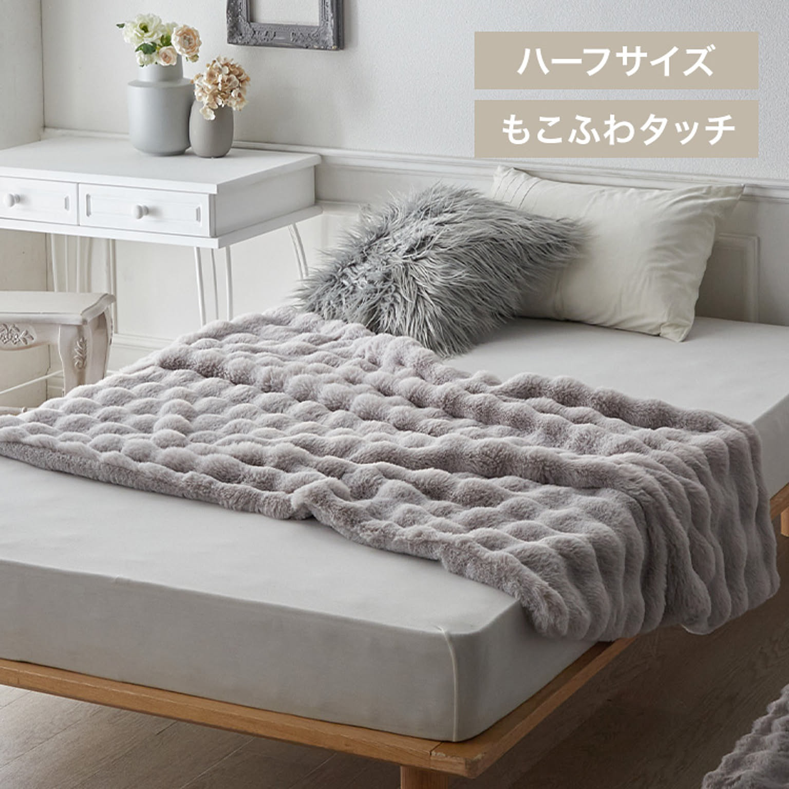 もこもこした立体カットでとろけるような肌ざわりが特長のラビットファー面と、短い毛足で上品な光沢感となめらさが特長のフランネル面の2つの素材を楽しめます。
