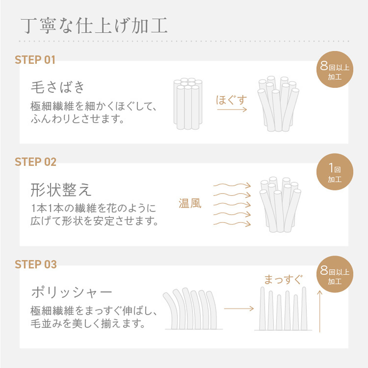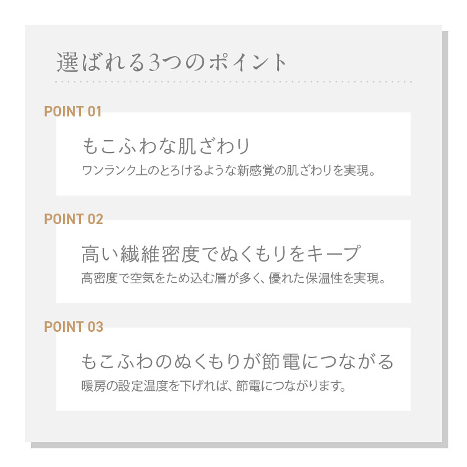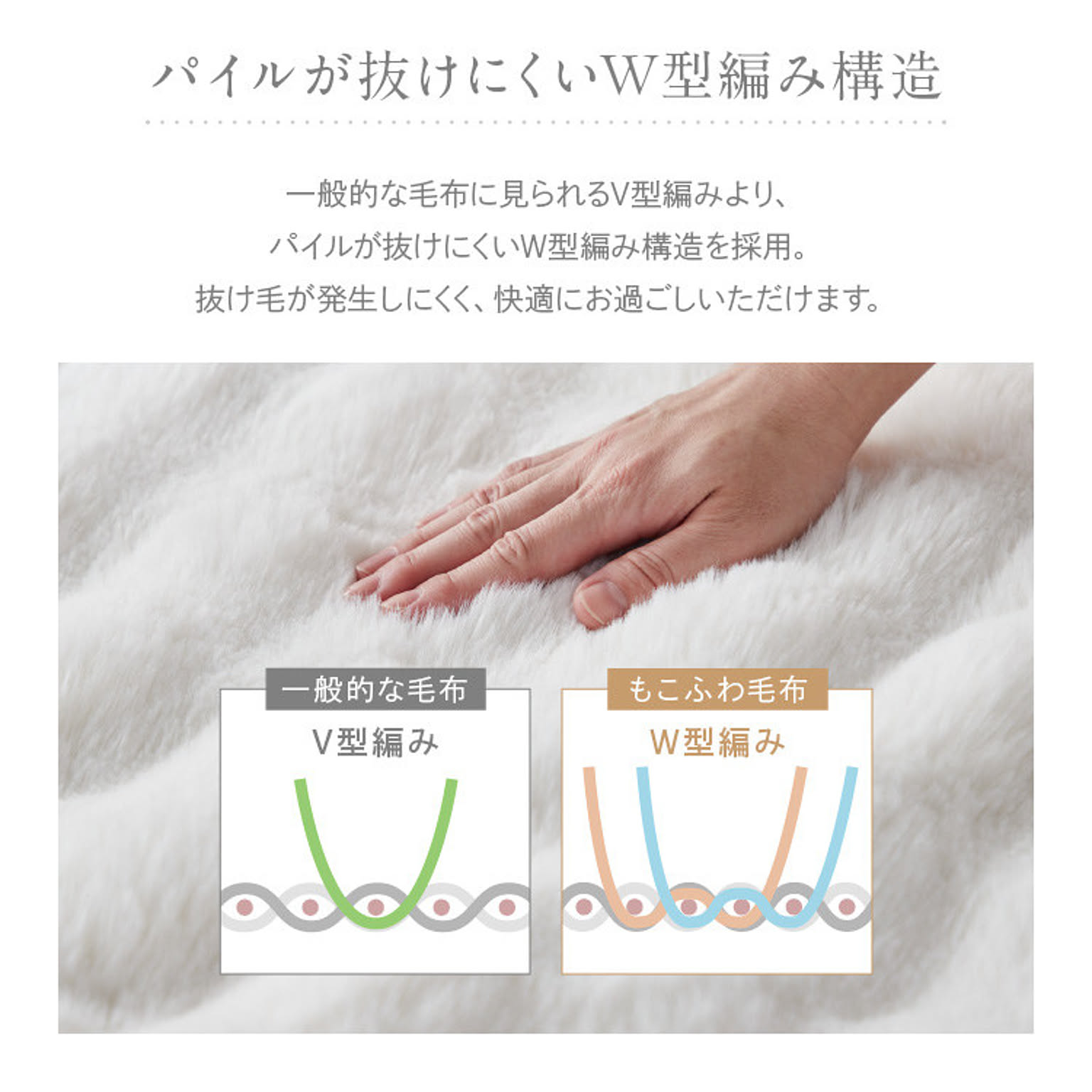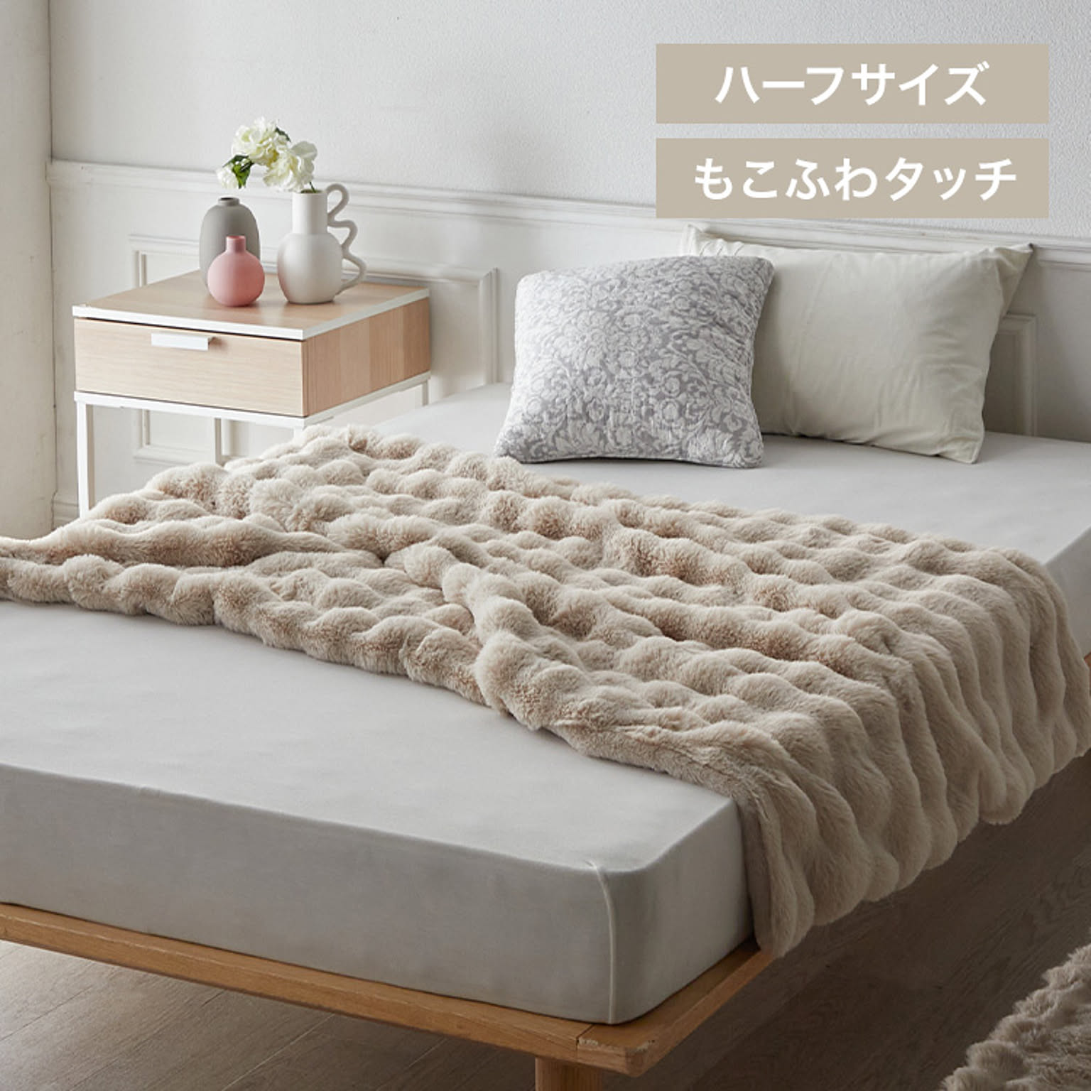 もこもこした立体カットでとろけるような肌ざわりが特長のラビットファー面と、短い毛足で上品な光沢感となめらさが特長のフランネル面の2つの素材を楽しめます。