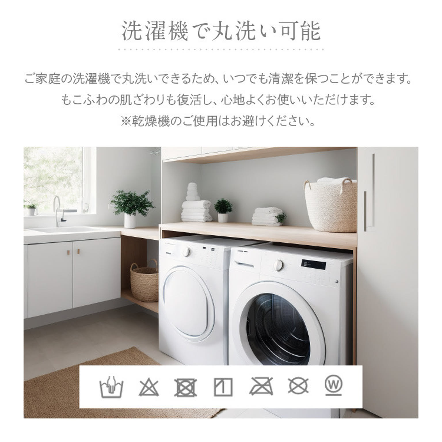洗濯機で丸洗い可能、乾燥機のご使用はお避けください。