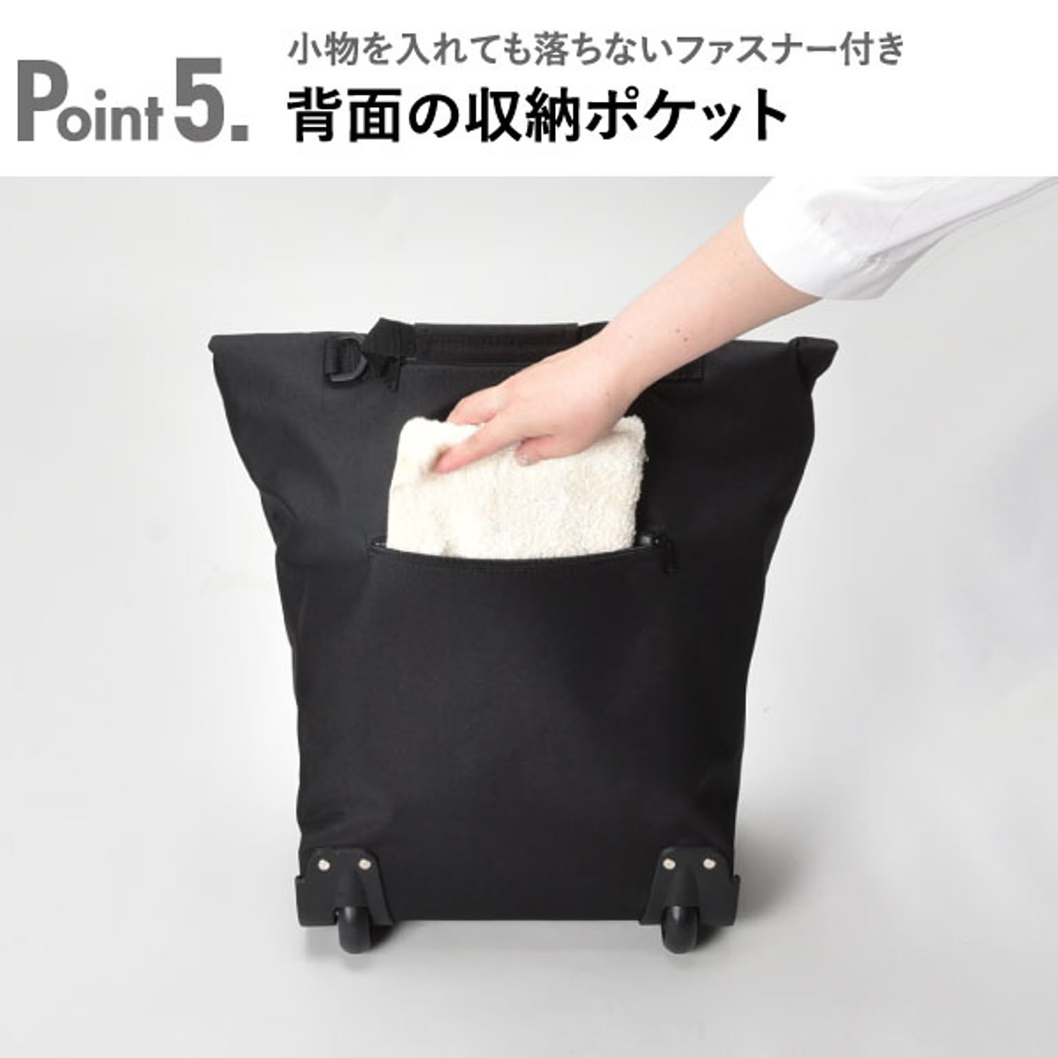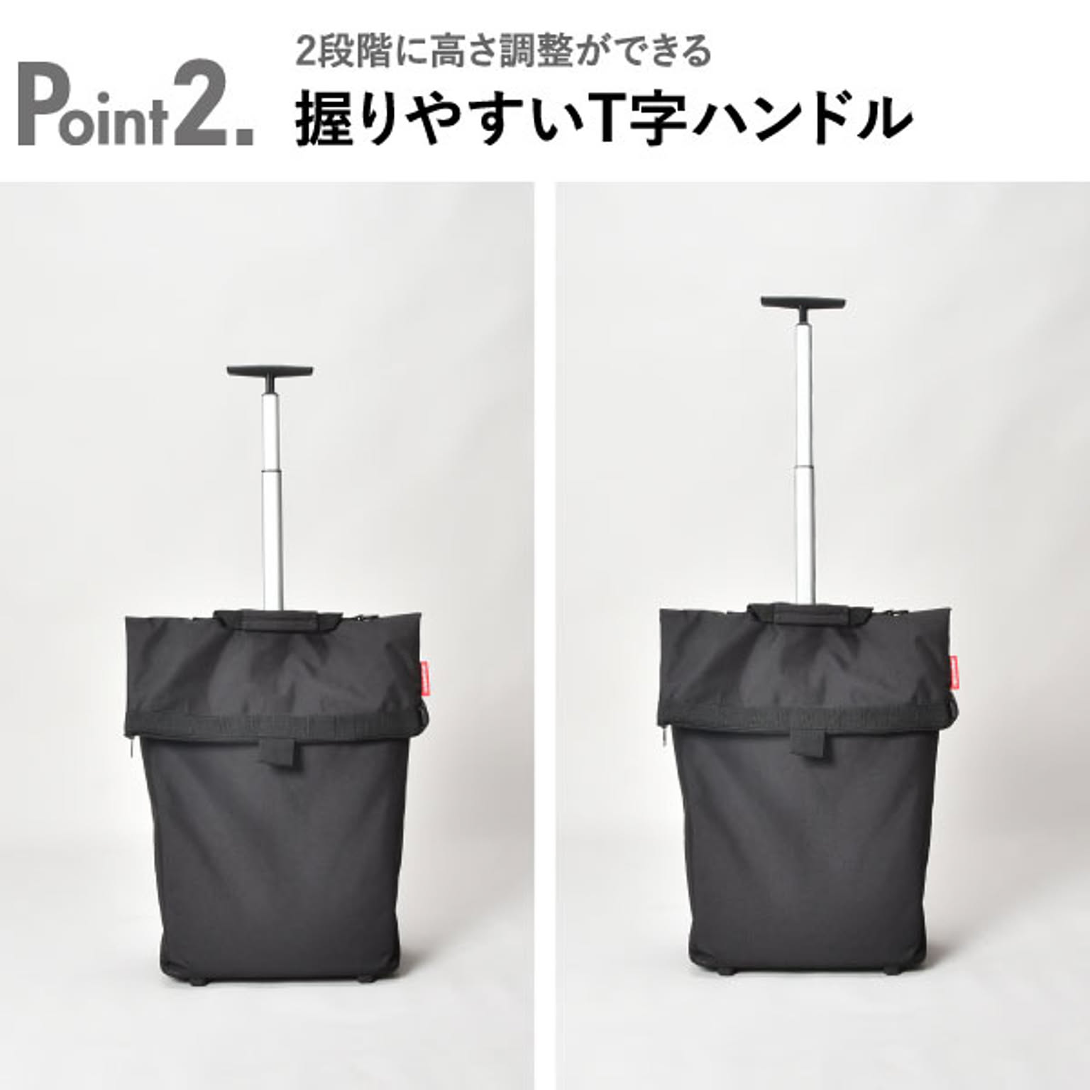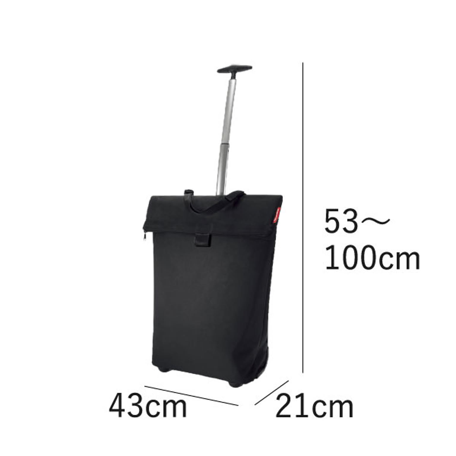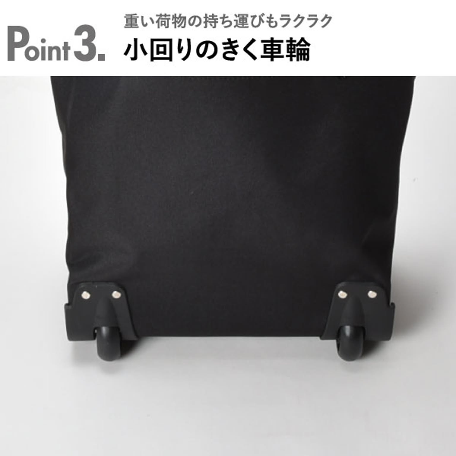 小回りのきく車輪付きのキャリーバッグです。狭い場所や人混みでも扱いやすいです。バッグを広げれば、約43Lと大容量です。たくさんの物を収納しても持ち運びやすいです。ハンドルは握りやすいT字型で、2段階に高さ調整が可能です。ハンドルはバッグの背面に収納できるので、バッグを手に持つこともできます。底鋲付きで置いた時も安定するので、荷物を出し入れしやすいです。大きく開く開口部で、安心のファスナー付き。背面にもファスナー付きの小物を入れられるポケットあります。買い物や旅行、アウトドアなど様々なシーンで活躍します。