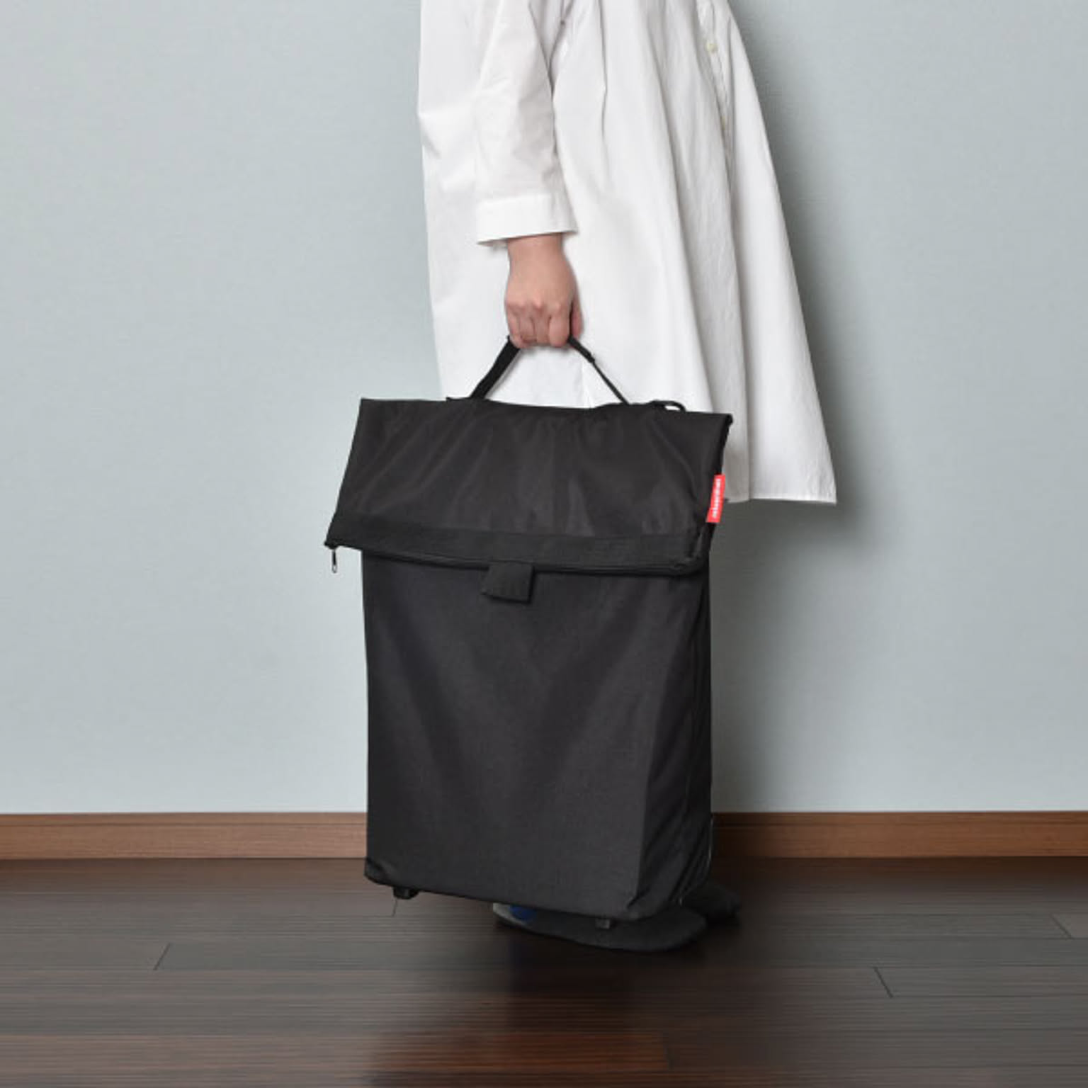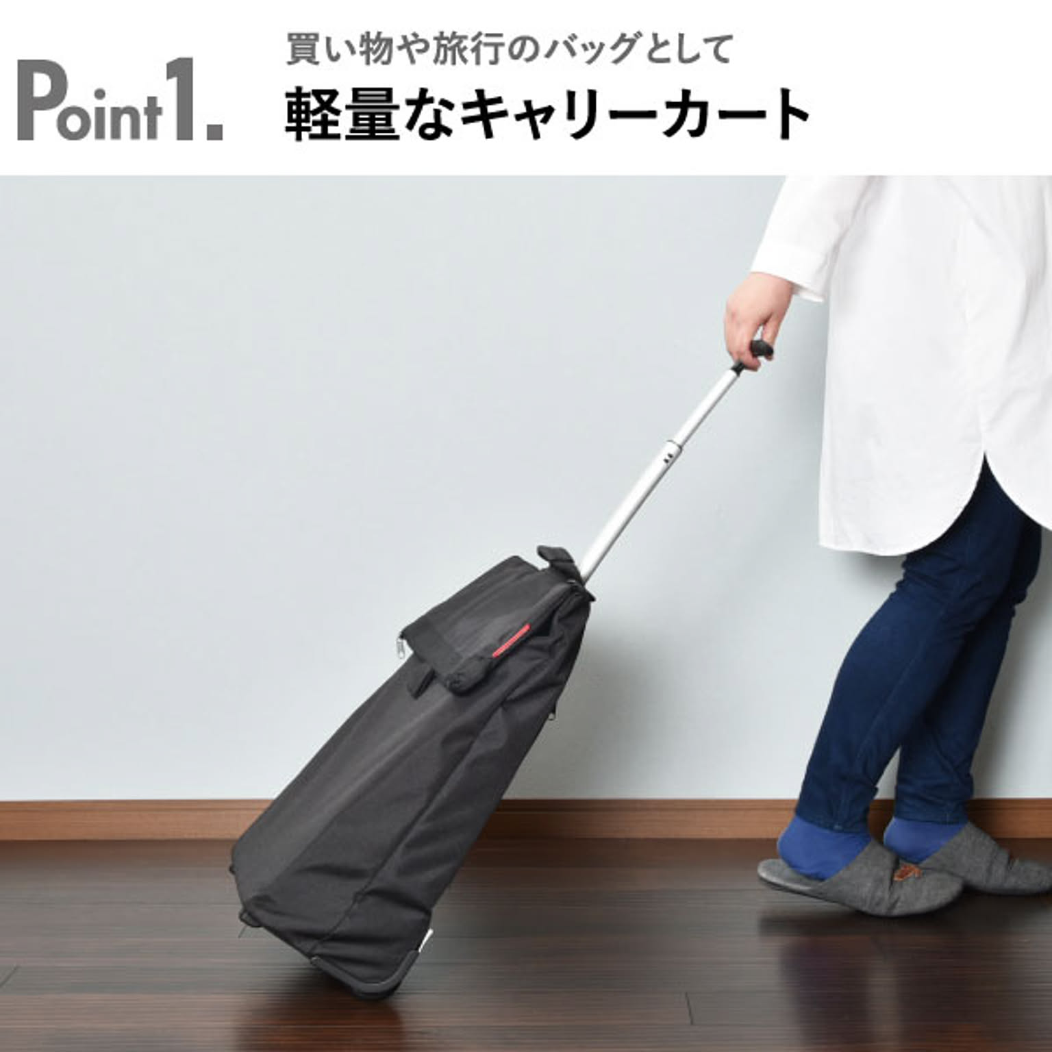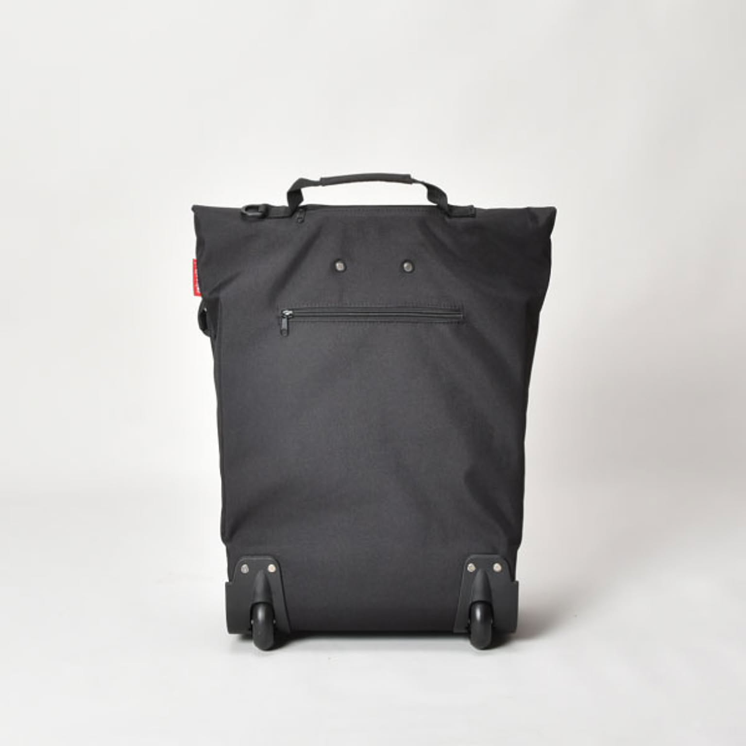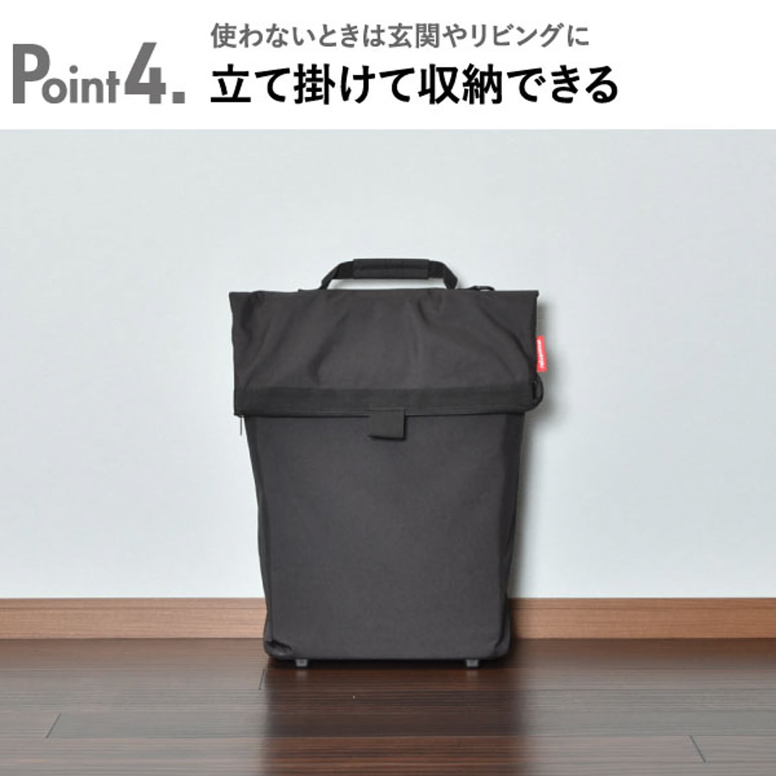小回りのきく車輪付きのキャリーバッグです。狭い場所や人混みでも扱いやすいです。バッグを広げれば、約43Lと大容量です。たくさんの物を収納しても持ち運びやすいです。ハンドルは握りやすいT字型で、2段階に高さ調整が可能です。ハンドルはバッグの背面に収納できるので、バッグを手に持つこともできます。底鋲付きで置いた時も安定するので、荷物を出し入れしやすいです。大きく開く開口部で、安心のファスナー付き。背面にもファスナー付きの小物を入れられるポケットあります。買い物や旅行、アウトドアなど様々なシーンで活躍します。