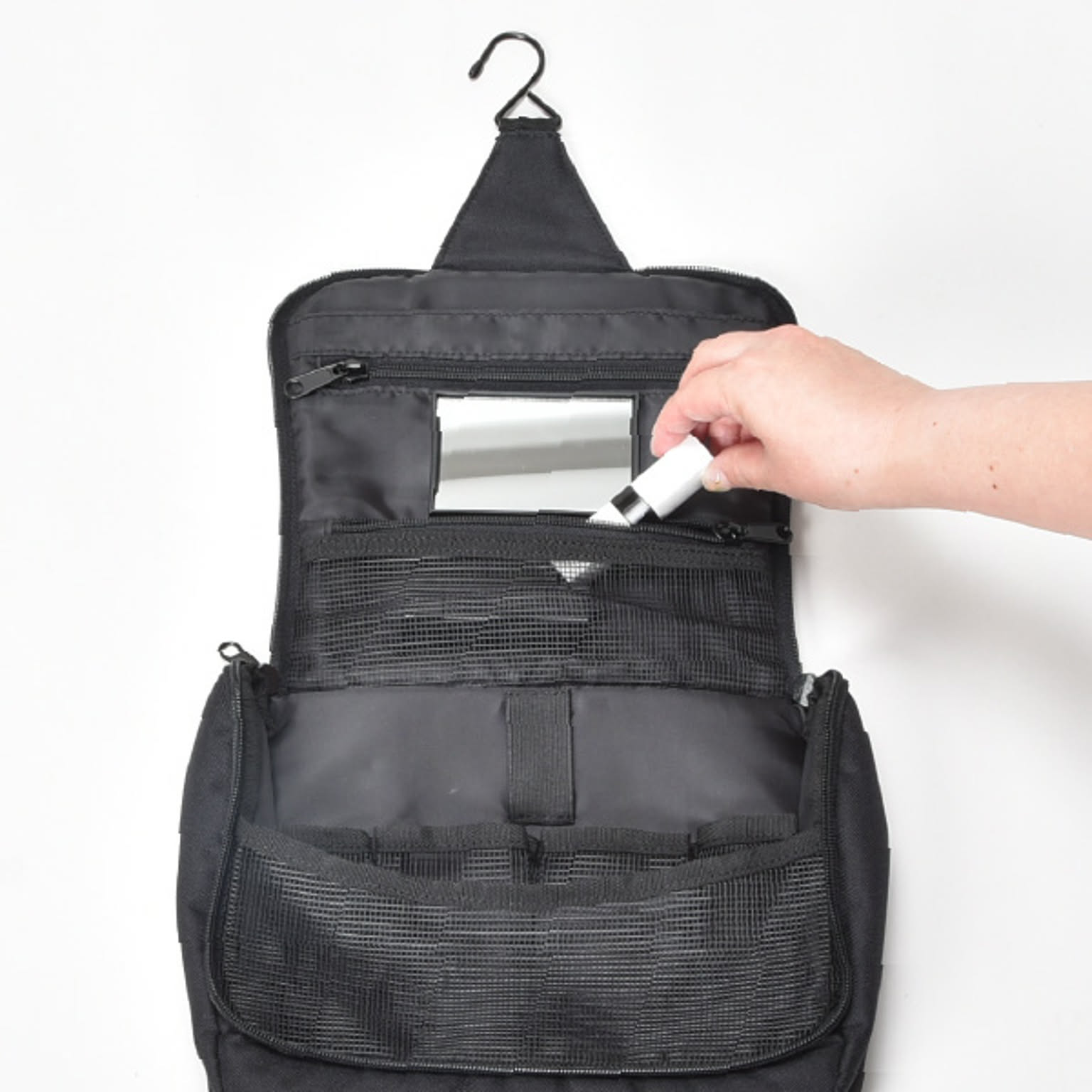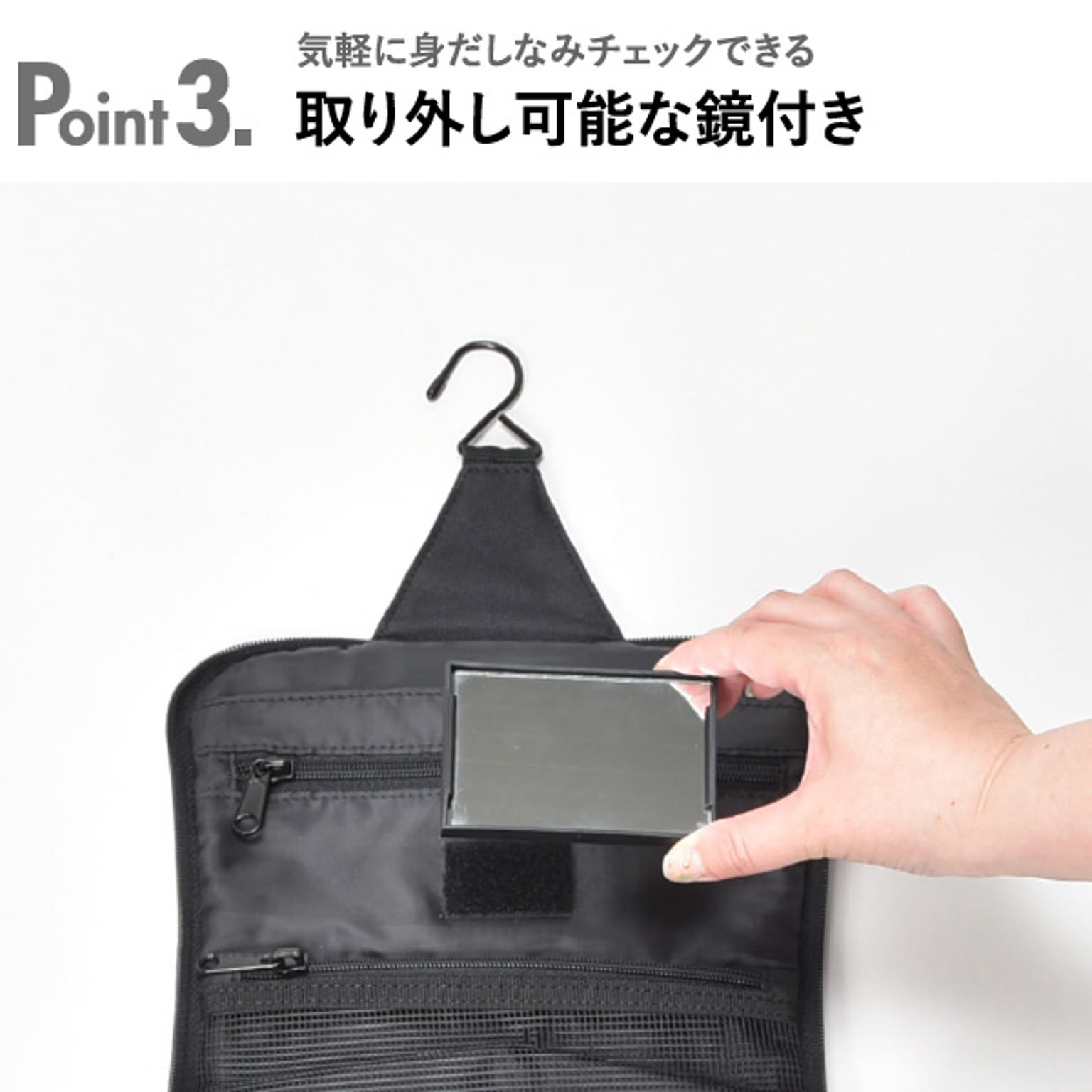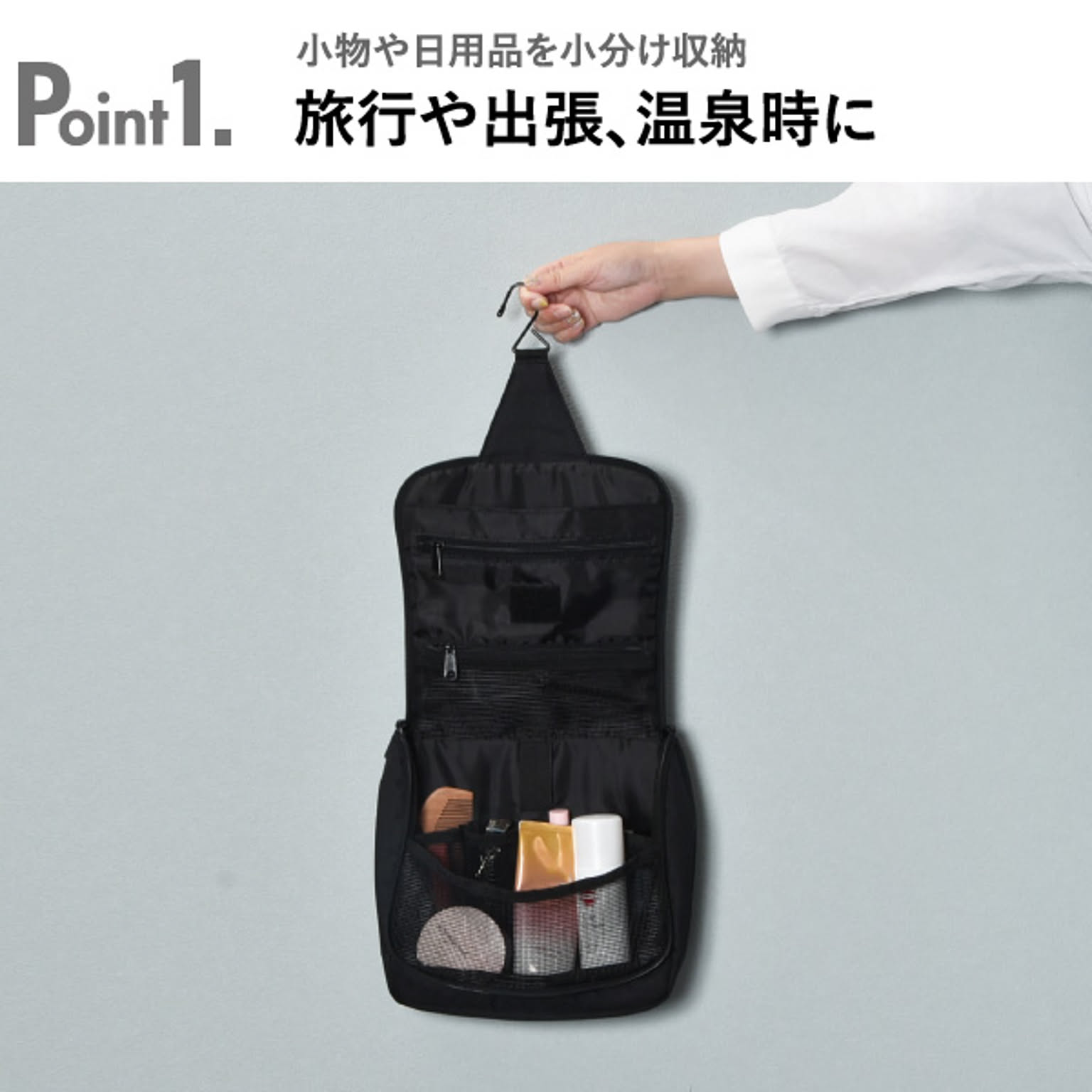 化粧品やスキンケア用品などを小分けして収納できるトラベルポーチです。旅行や温泉、出張など様々なシーンで活躍します。小物を8つのポケットに分けて収納できるので、ポーチの中がごちゃつきません。ヘアブラシを固定できるゴムベルト付きです。バスルームや洗面所に吊り下げられるフック付きで、場所を取らずに広げられます。ポーチには鏡がついているので、身だしなみのチェックも可能です。マジックテープで取り外せて便利。開口部は大きく開くので、中が見やすく、取り出しやすいです。年齢・性別問わずお使いいただけるシンプルなデザインです。