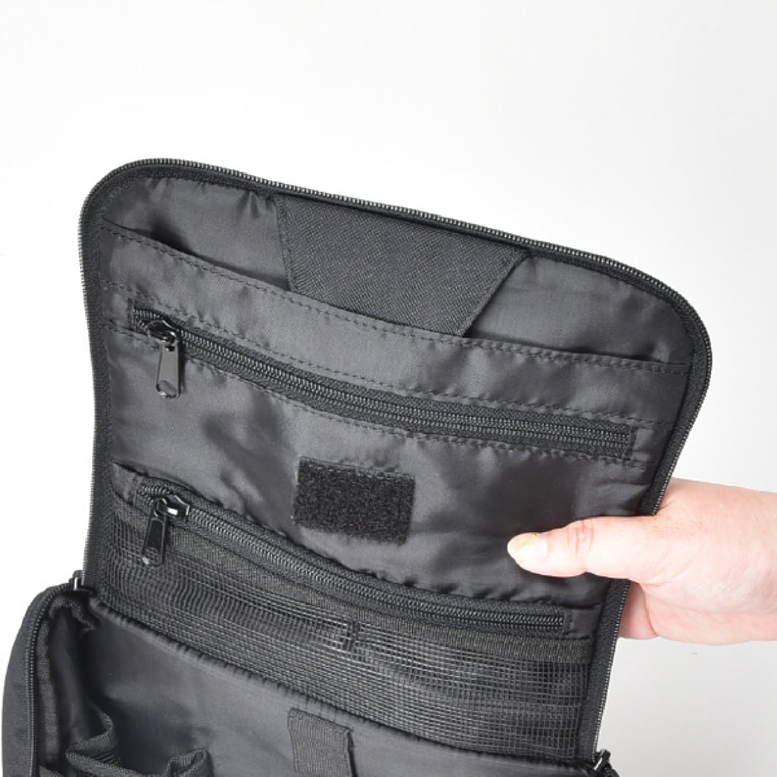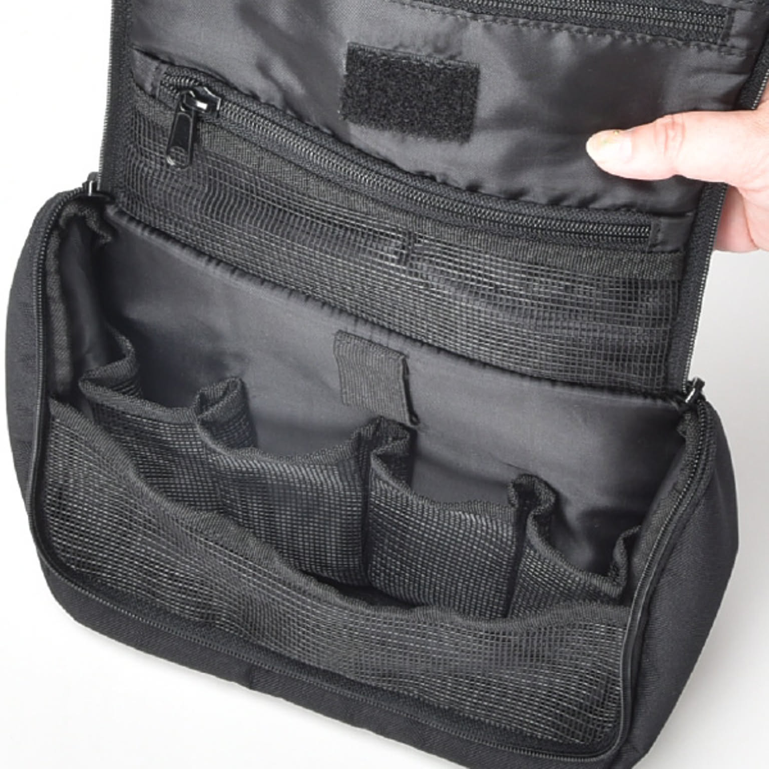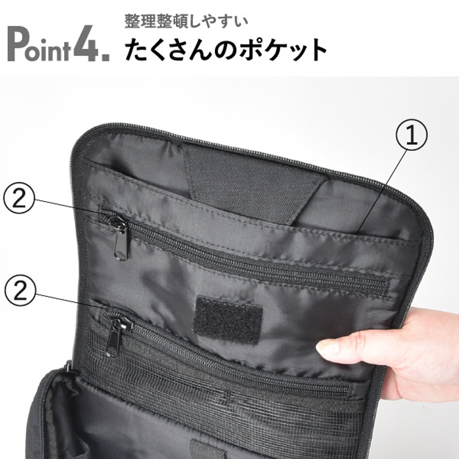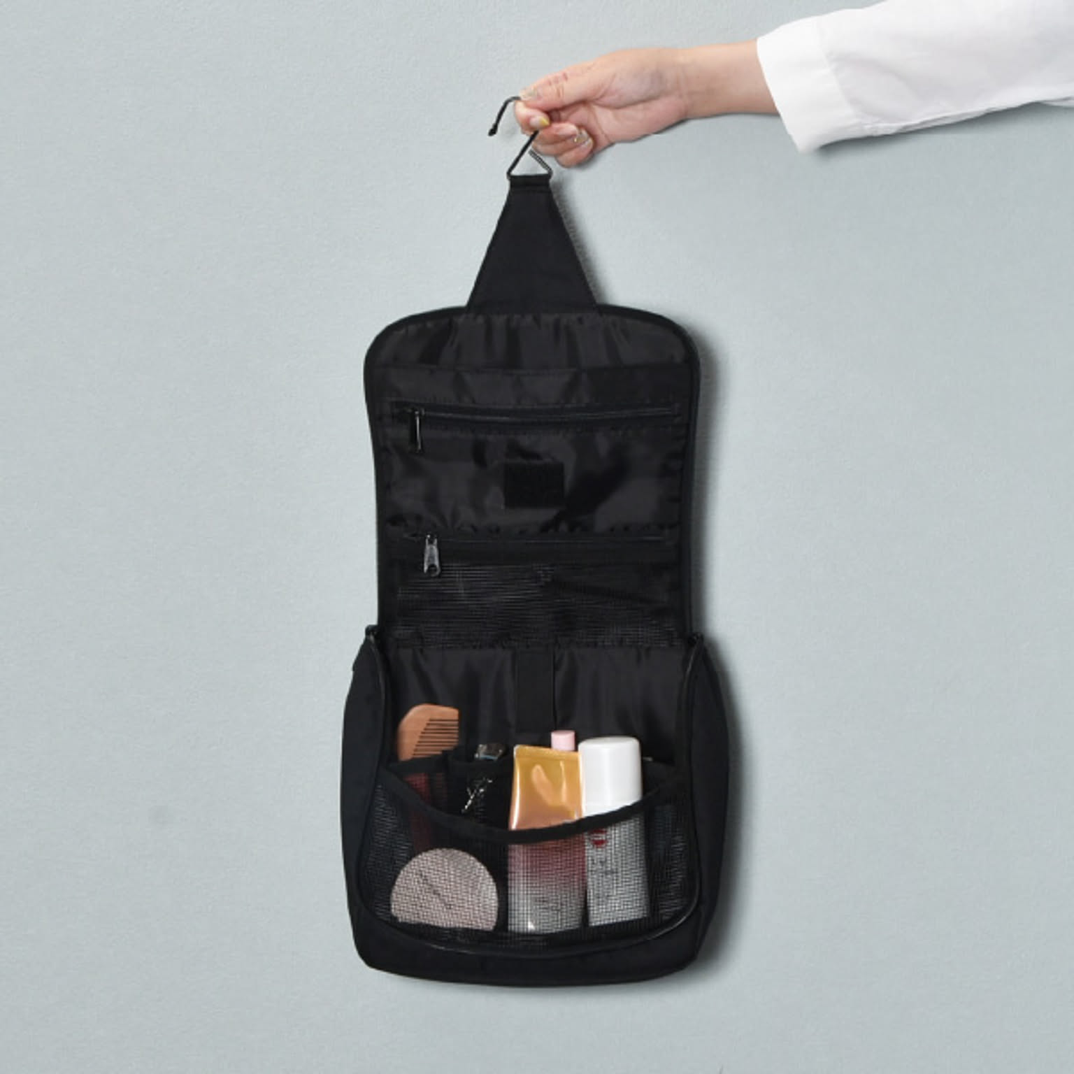 化粧品やスキンケア用品などを小分けして収納できるトラベルポーチです。旅行や温泉、出張など様々なシーンで活躍します。小物を8つのポケットに分けて収納できるので、ポーチの中がごちゃつきません。ヘアブラシを固定できるゴムベルト付きです。バスルームや洗面所に吊り下げられるフック付きで、場所を取らずに広げられます。ポーチには鏡がついているので、身だしなみのチェックも可能です。マジックテープで取り外せて便利。開口部は大きく開くので、中が見やすく、取り出しやすいです。年齢・性別問わずお使いいただけるシンプルなデザインです。