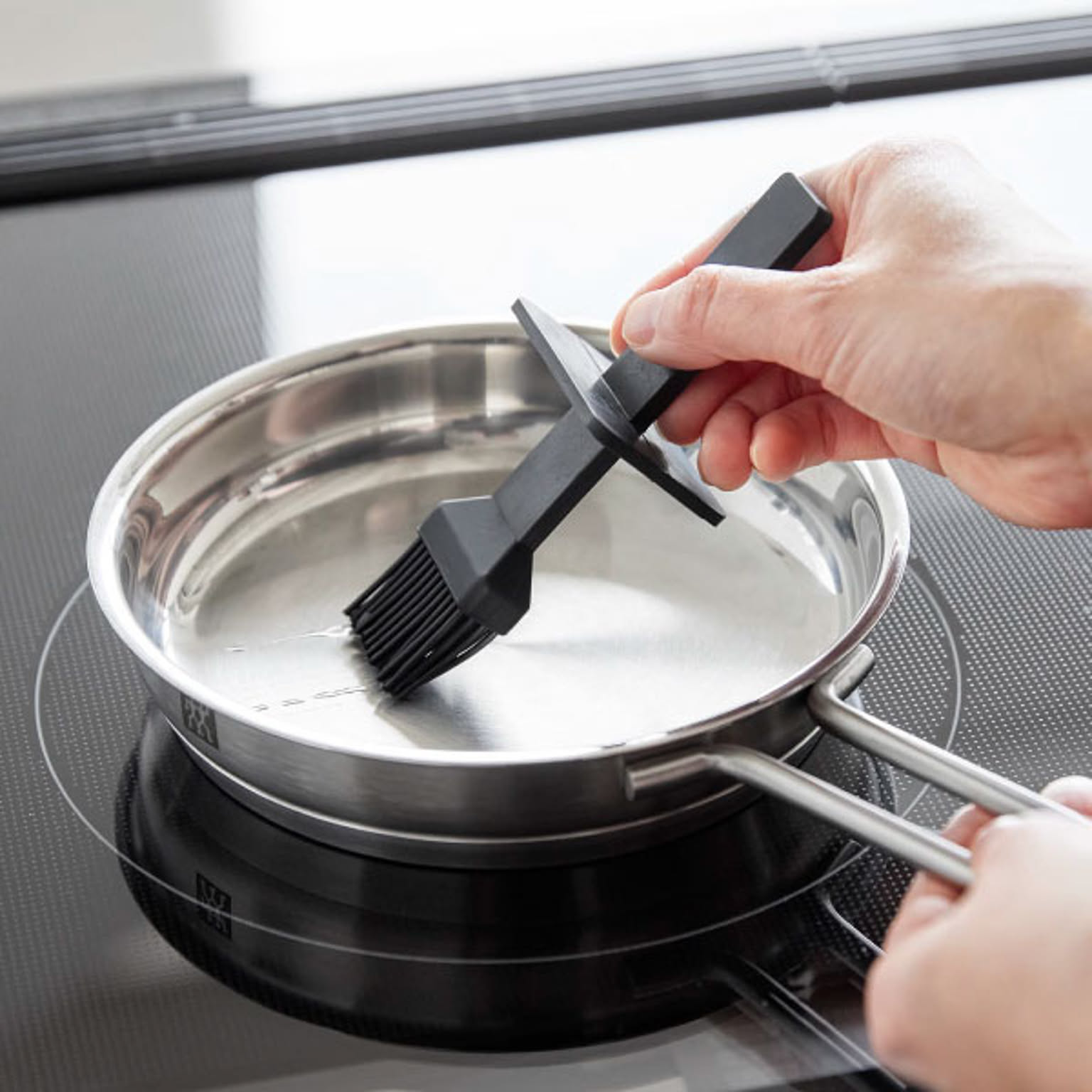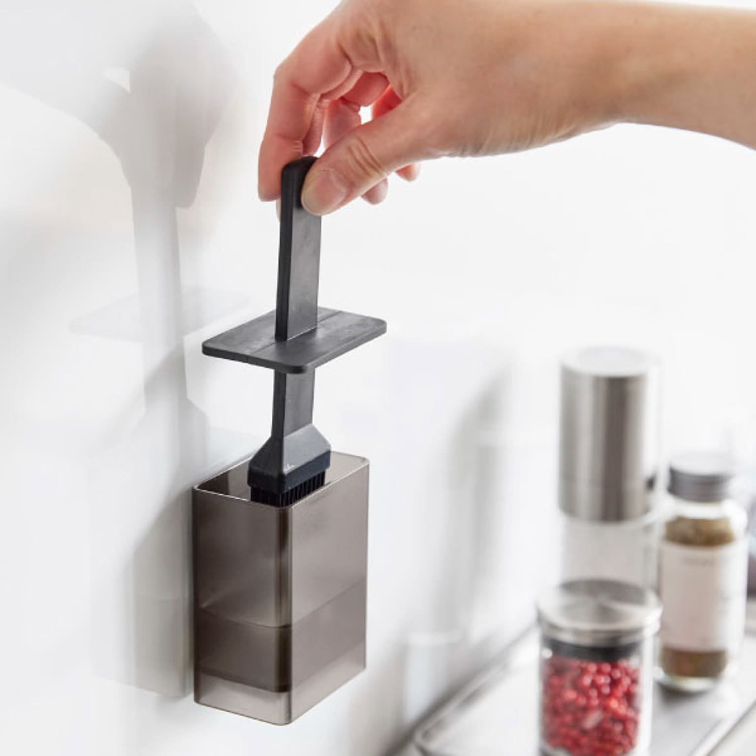 フライパンなどに油を薄く塗り広げられる、おしゃれなシリコン油ひきです。様々なインテリアに馴染むモノトーンのシンプルなデザイン。油引きのブラシは熱に強いシリコーン製で、安心してご使用いただけます。少量でもしっかり油を伸ばすことができ、油の使いすぎを防ぐことができます。シリコン油ひきは壁面に取り付けられる便利なマグネットタイプ。コンロまわりなど、調理中でも手に取りやすい場所へ、油引きを手軽に設置できます。浮かせることでキッチンの掃除もしやすくなり、衛生的です。シリコン油ひきはブラシとフタが一体型なので、ブラシの持ち手を持ち上げるだけでスムーズに使うことができます。容器の口が広く、油の詰め替えもラクラク。容量は100mLです。シリコン油ひきはブラシと容器のみの構造なので、洗いやすく、清潔に保てます。油引きのブラシは食洗機対応でお手入れも簡単です。