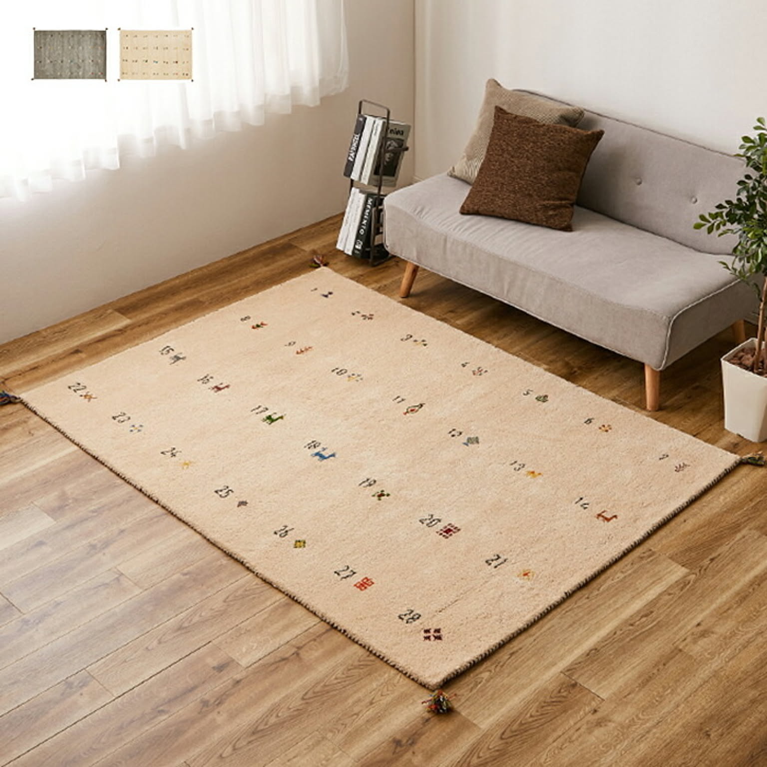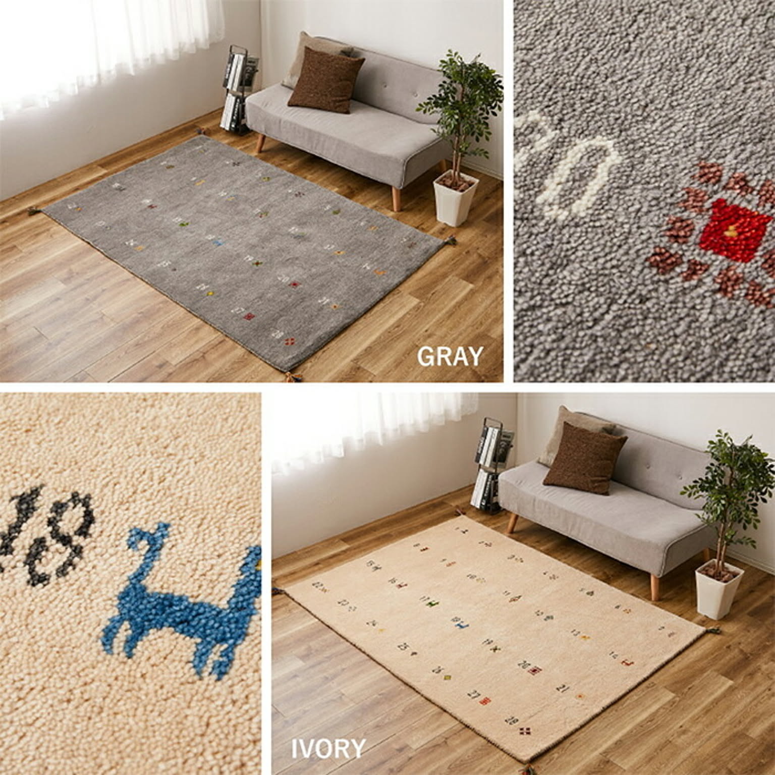 インドの職人が一枚一枚丁寧に織り上げた一点もの。ウ−ル素材は暖かく冬に適しているイメ−ジがありますが、温度差の激しい環境で育った羊から取れる羊毛は、保温性と湿度を調節する機能に優れています。夏の湿気にも適しておりオ−ルシ−ズンご使用いただける素材です。しっかりとした密度と厚みで、ふかふかな踏み心地をお楽しみいただけます。裏面も同素材で床にやさしい仕様です。四隅にはタッセルをあしらい、愛らしさをプラスしました
