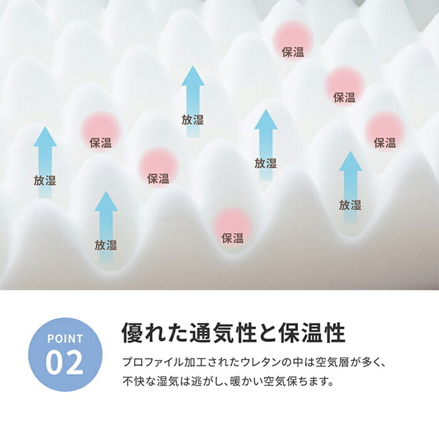 表面凸凹(プロファイル)加工で、点になったウレタンが体圧を分散し、身体への負担が軽減。通気性・保温性にも優れています。厚み約8cmで、ベッド無し、敷布団無しでご使用いただけます。