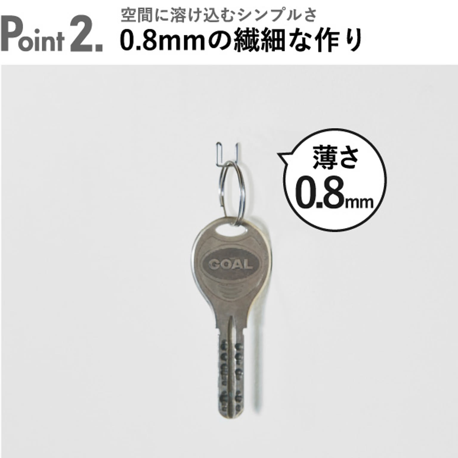 0.8mmという薄さにも関わらず、約1kgの耐荷重で壁掛けフックとしても活躍します。