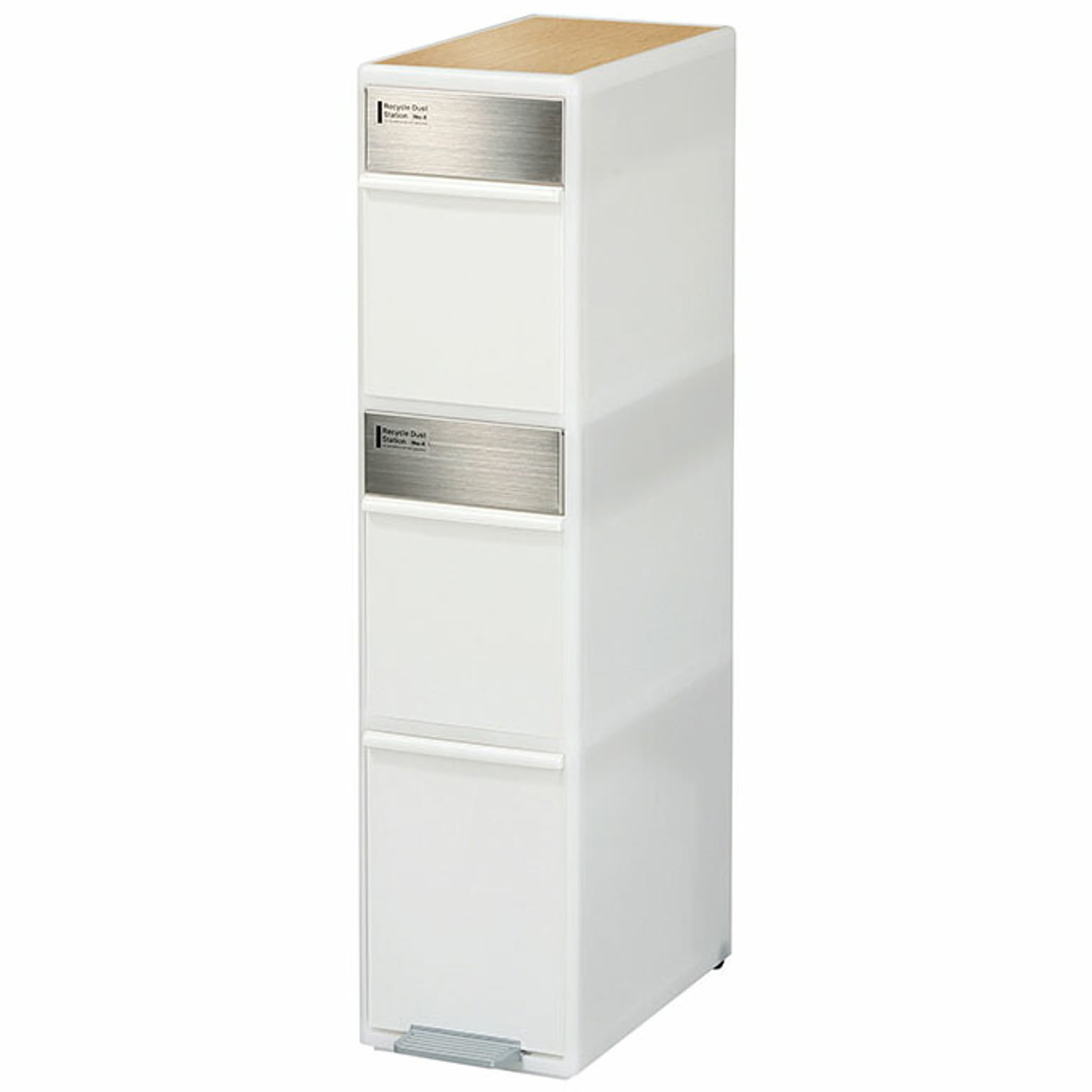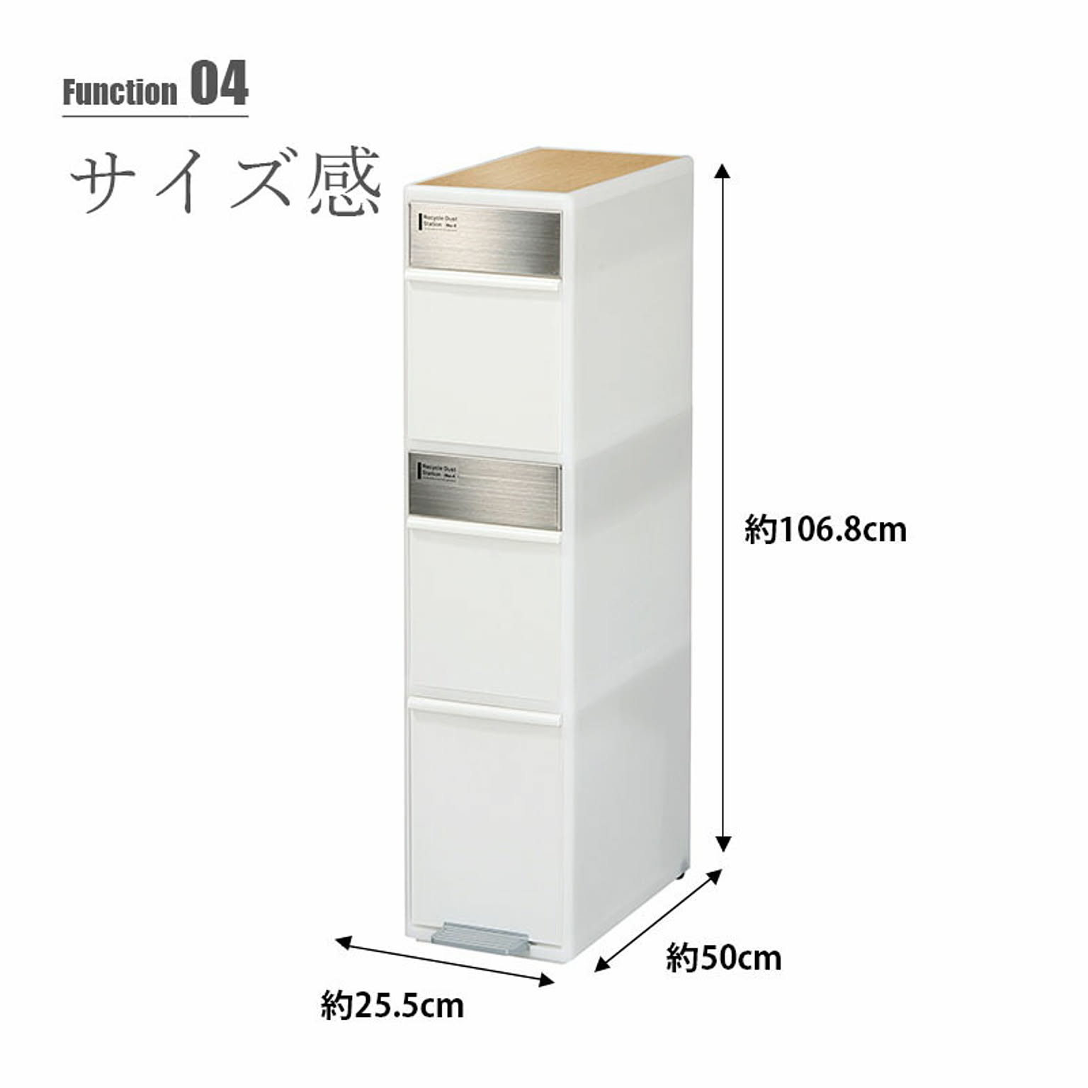 資源ゴミをひとまとめにストックできる分別容器3段タイプ。引出し内部の左右の切込みにスーパーなどの取っ手付きポリ袋をセットするだけで簡単に多種分別が行なえます(5‐7分別対応)。上段のスイングパネル付き引出しには、使用頻度の高い資源ゴミを簡単に投入。最下段は足で踏めば開閉するペダル式なので、かがまずラクにゴミを投入できます。天板トップにはインテリア性を考慮した耐熱性メラミン木天板を付属。木天板は表裏リバーシブルなのでお好みの木目をお選びいただけます。片手で投入できるスイングタイプ。ステンレスヘアライン仕上げで高級感があり、汚れが落ちやすいので衛生的に使えます。容器内の切り込みに手提げ袋を取り付けて2〜3分割できます。分別ユニットの引き出し左右の切り込みに引っ掛けるだけで簡単にセットできます。最下段はかがまなくても捨てることができるフットペダルタイプ。■カラー ホワイト ■容量 55リットル