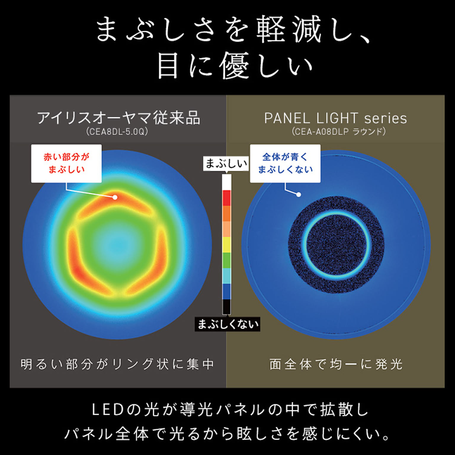 LEDの点の光が導光パネルの中で拡散し、パネル全体で光るからまぶしさを感じにくい!
